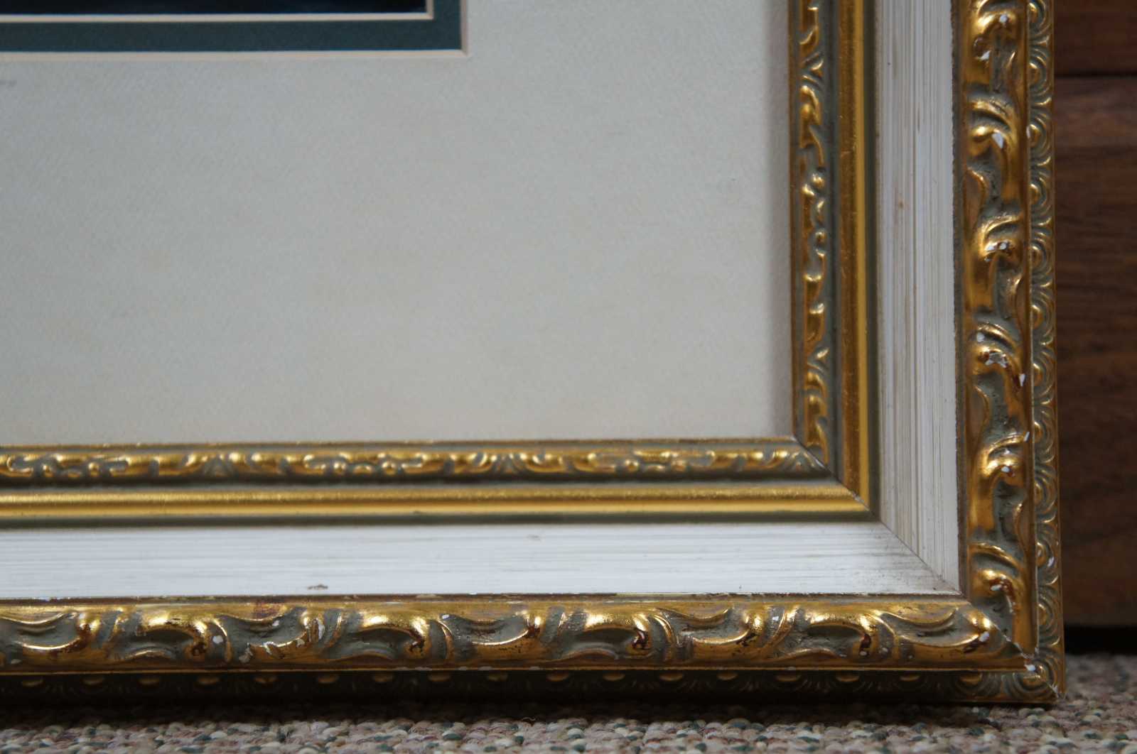 Framed vintage color photographic print of a white ketch or yawl type sailboat with red trim.