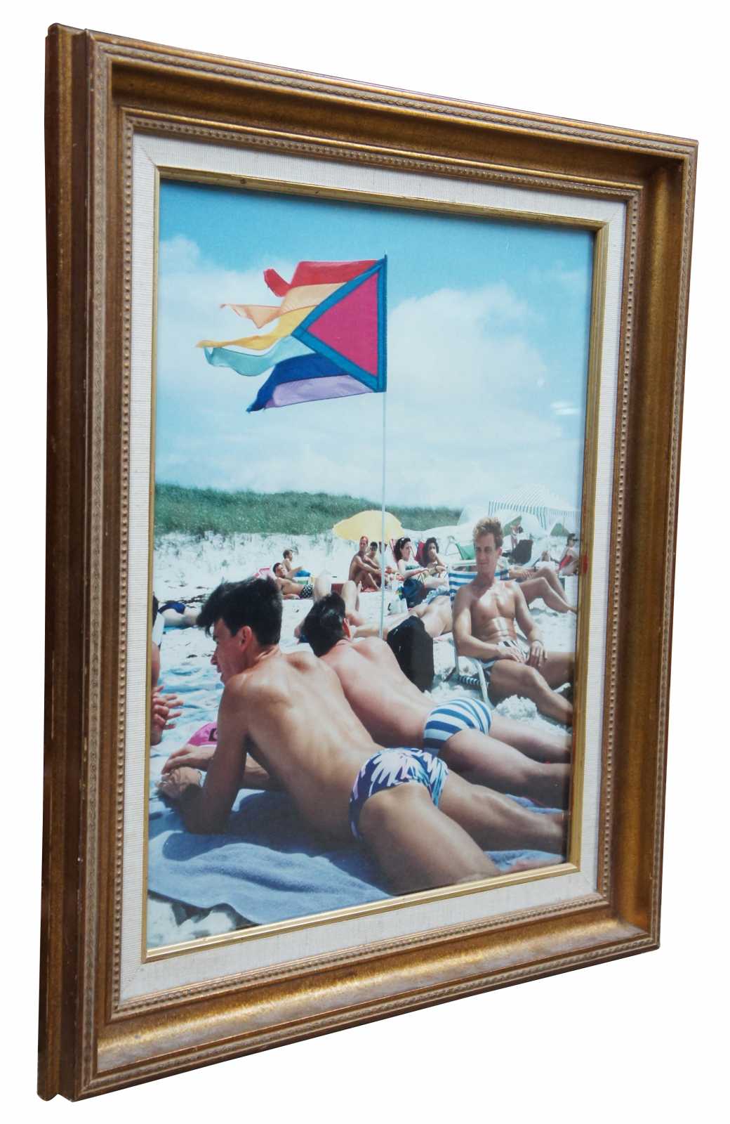 Vintage color photographic print of same sex couples on a beach under a gay pride flag.