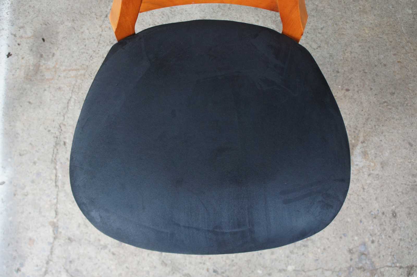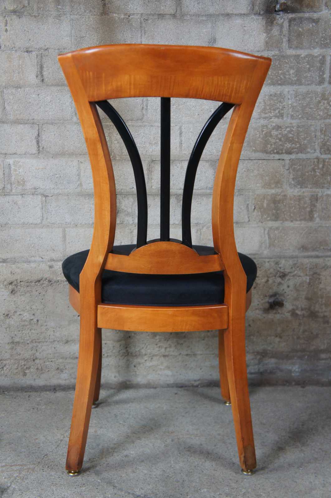 Circa 1990s National Mt Airy dining chairs. Beidermeier style with maple and ebonized frame. Upholstered in black with two arm chairs.