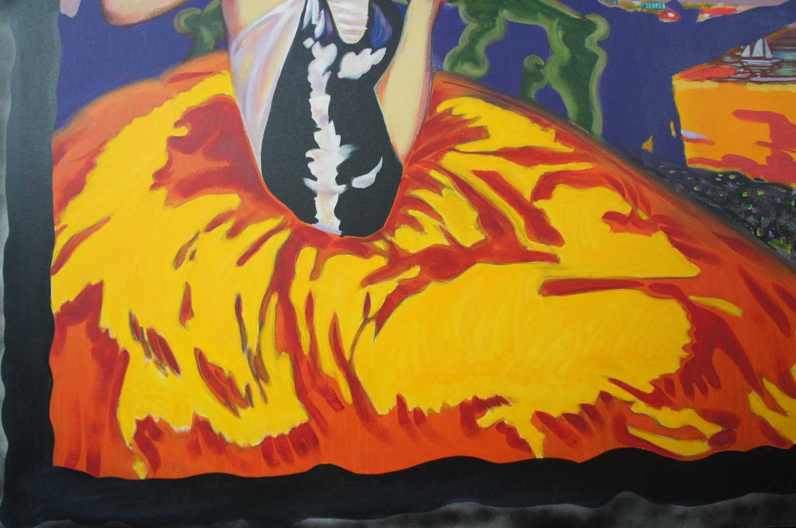 This painting was done in trade for the use of Daniel Adams' Paris apartment, by artist Ralph (Andy) Richards. The general subject was an adaptation of a 1930's Campari ad. A martini glass was substituted for the Campari glass since Adams doesn't drink Campari. The background reflects the four places Adams had property and spent time.