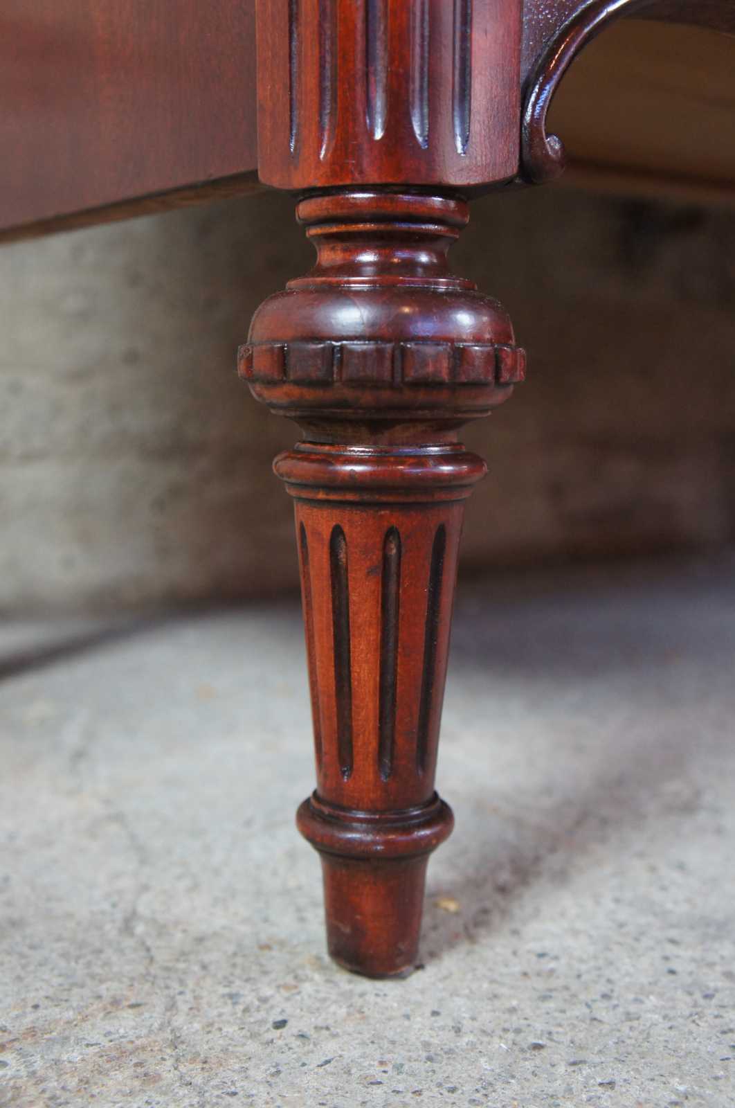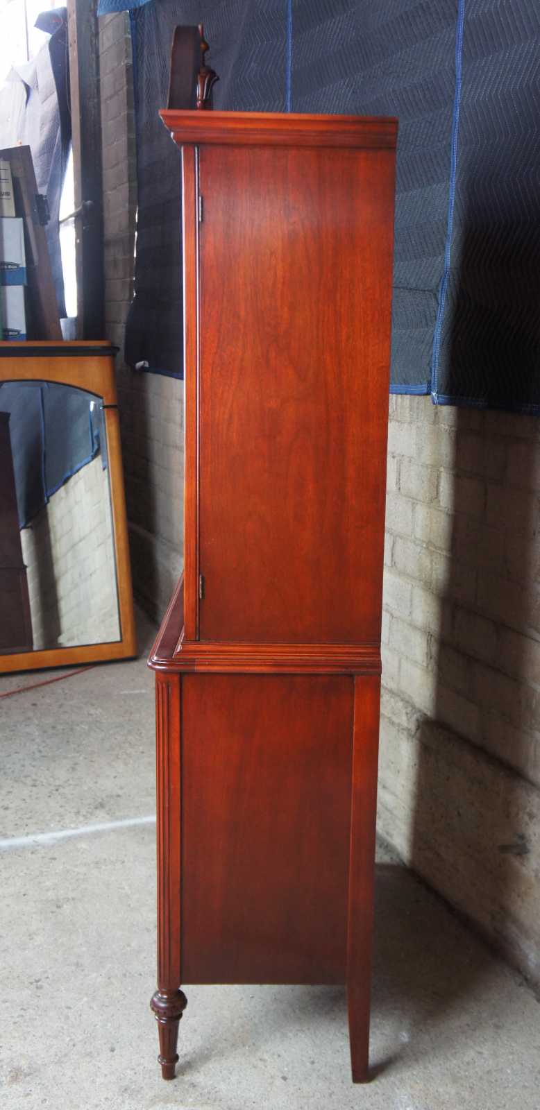 Circa 1940s American mahogany china cabinet. Features Sheraton styling with an open pediment and central trophy finial. The glass covered fretwork doors open to two shelves. Lower storage includes one drawer and cabinet. Legs are tapered and fluted.