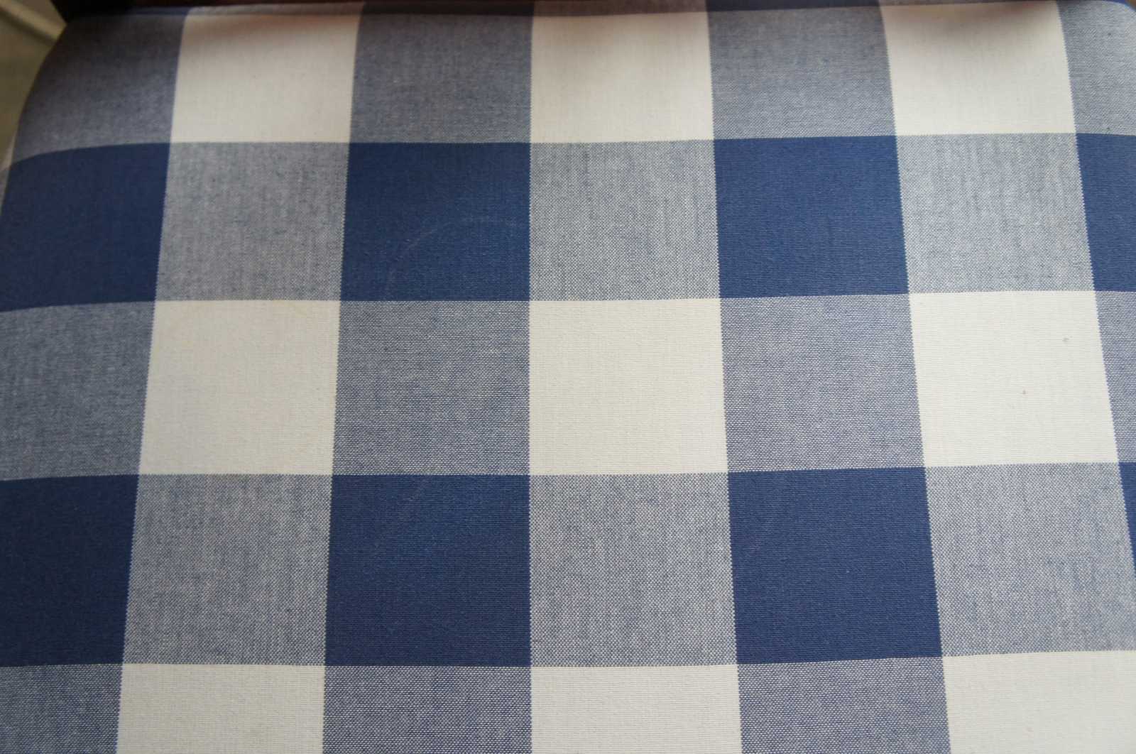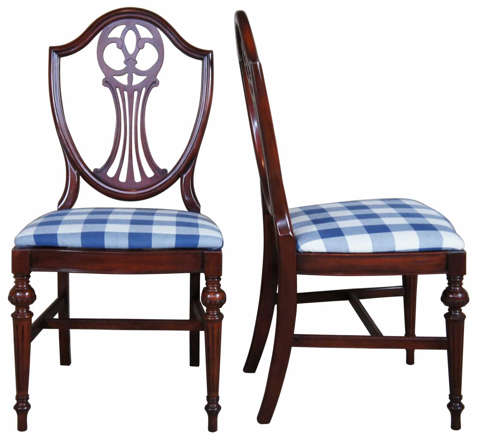 Circa 1940s American Red Mahogany Dining Chairs. Features a blend of sheraton and hepplewhite styling with a pierced shield back. Upholstered in a white and blue check over turned fluted and tapered legs connected by an H stretcher leading down to an arrow/ peg foot.