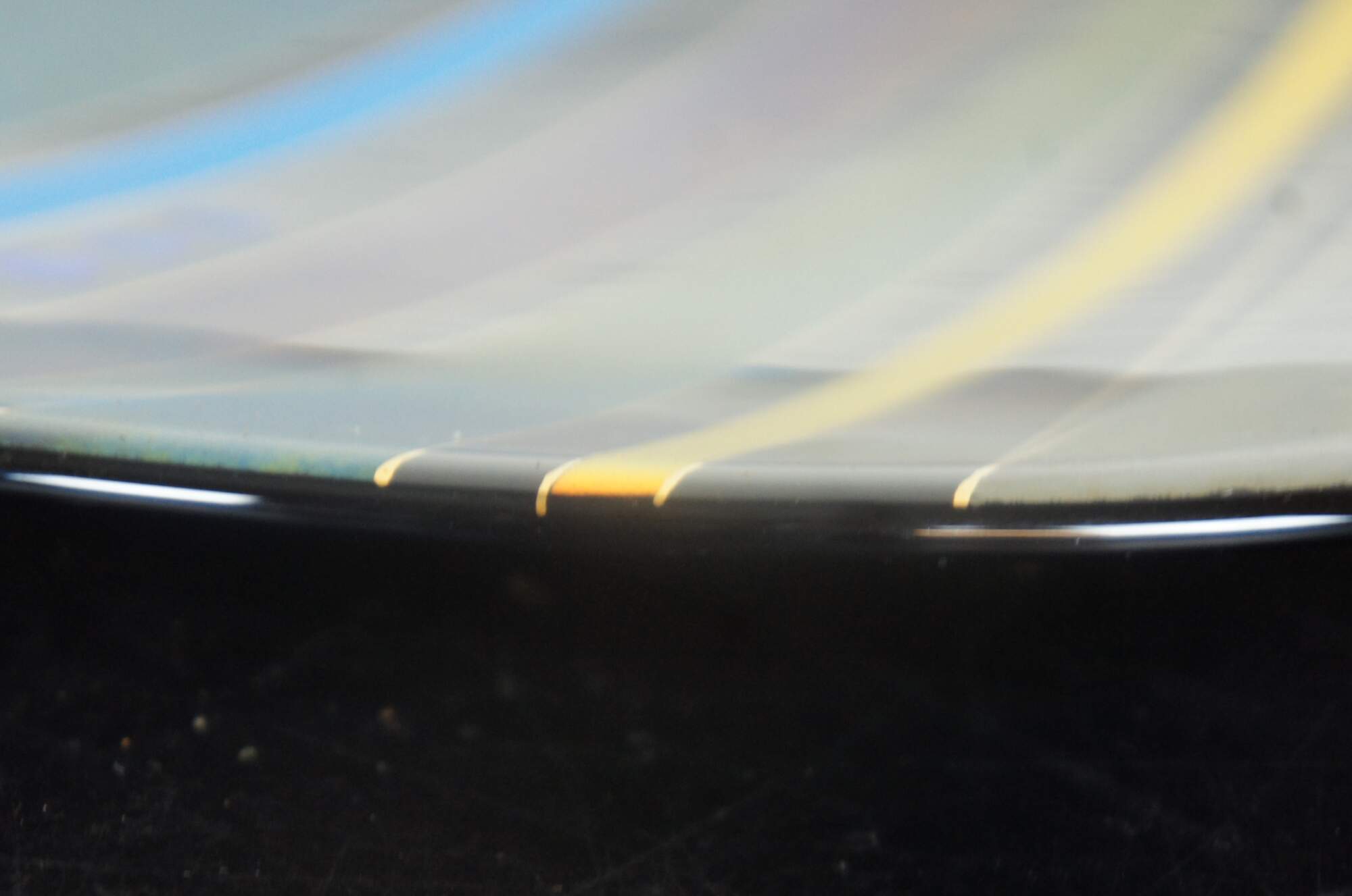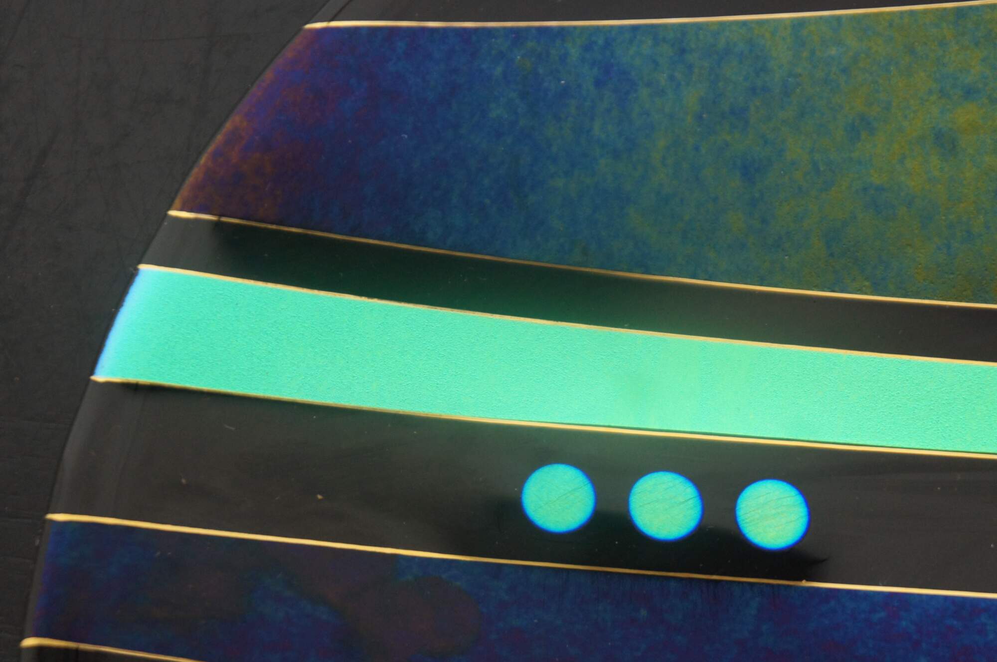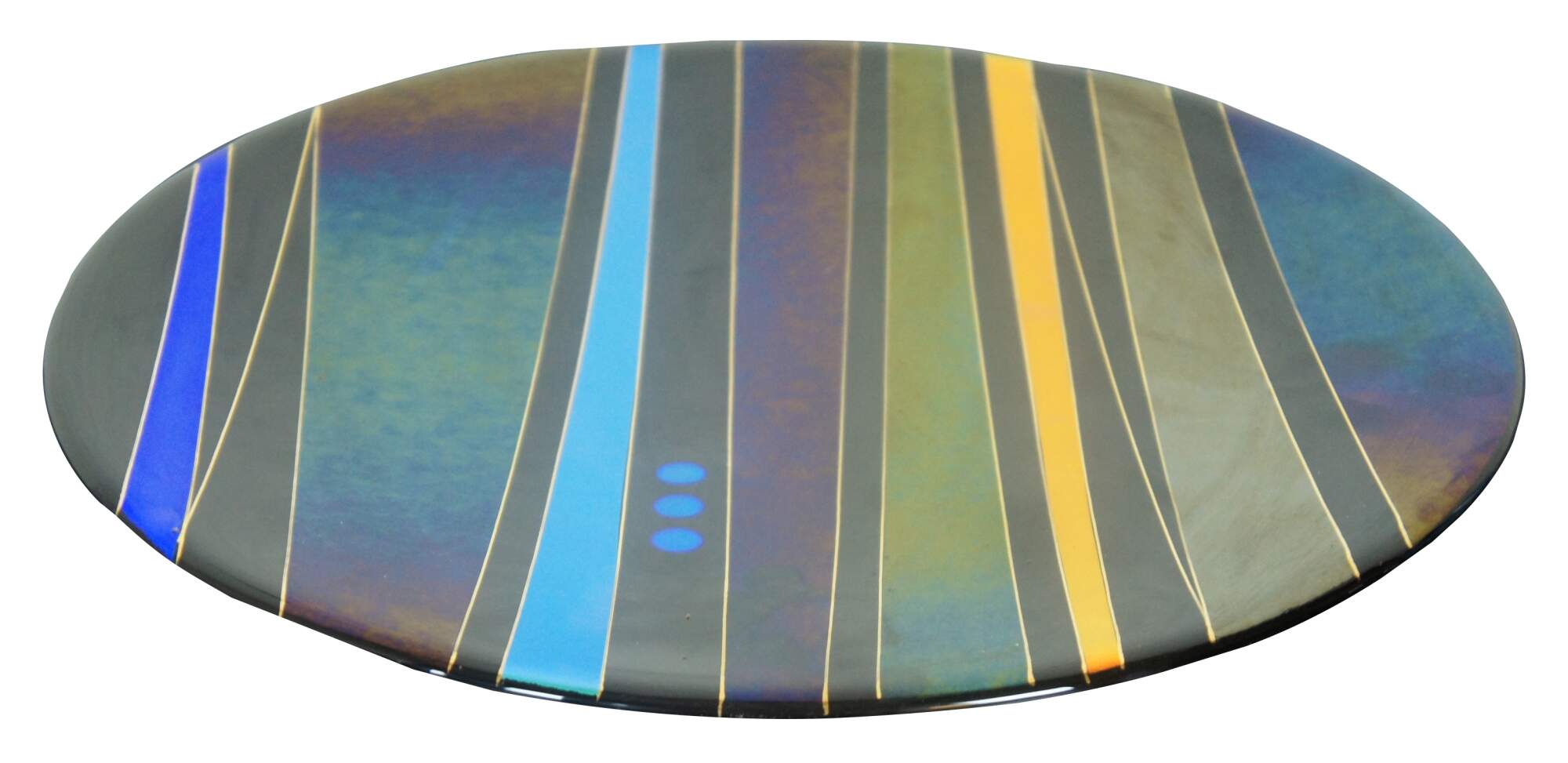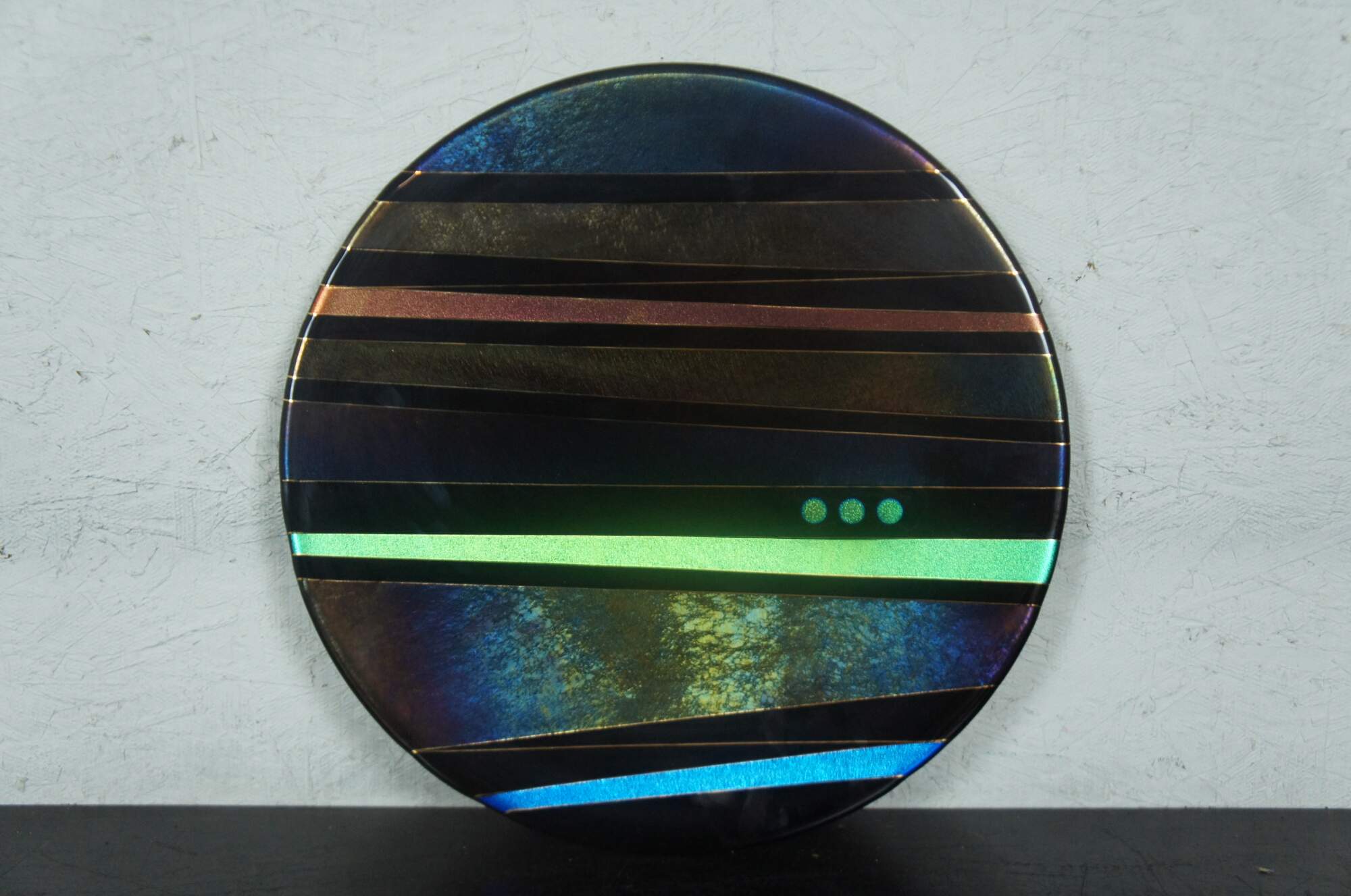 Beautiful Modernist abstract geometric studio art glass plate or charger featuring striped of bold, iridescent colors and gold trim. Made by Jim & Sharon Barrett of Barrett Glass Studios in Memphis, Tennessee.