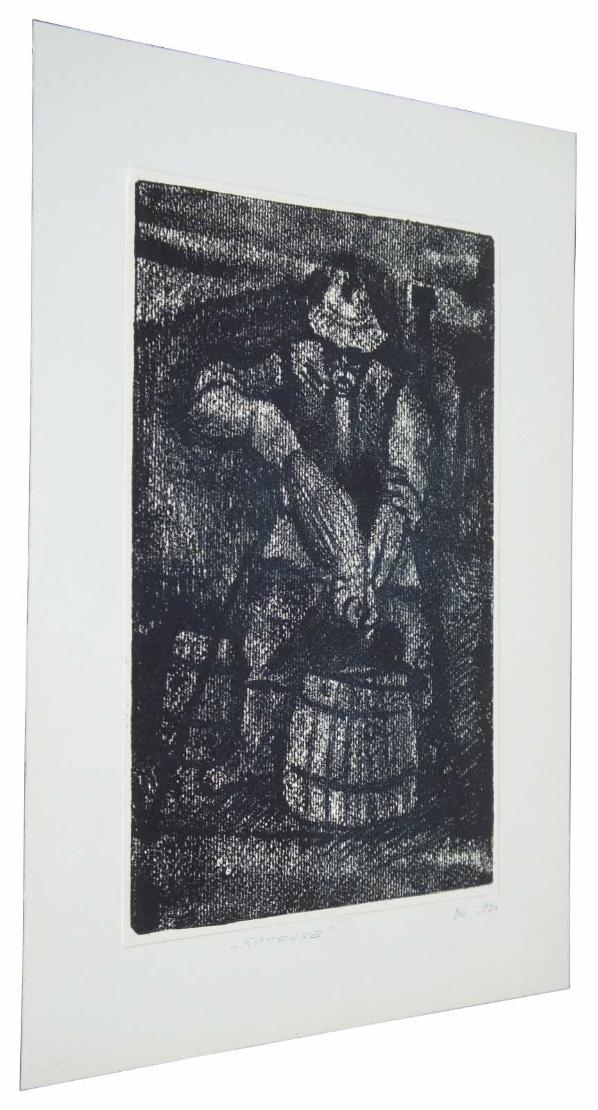 Vintage 1986 black and white Ukrainian etching by Lanyak Dmytro Oleksiiovych titled “Boiler,” showing a man wringing / twisting / draining water / oil into an barrel with factory stacks in the background. Titled and dated in pencil by the artist.