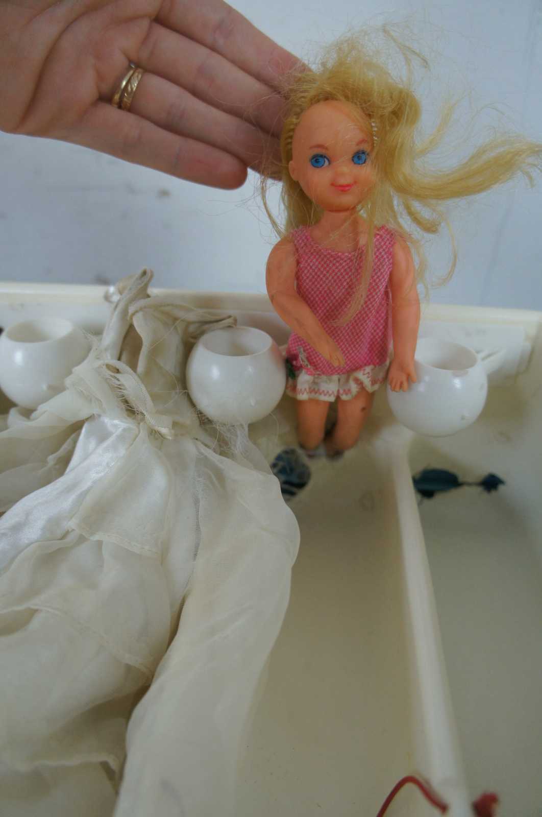 Very Good – Gentle wear throughout; trunk structurally sound, a few crack and holes; feet of one doll and edge of wedding dress trapped/melted to side of trunk; see pictures