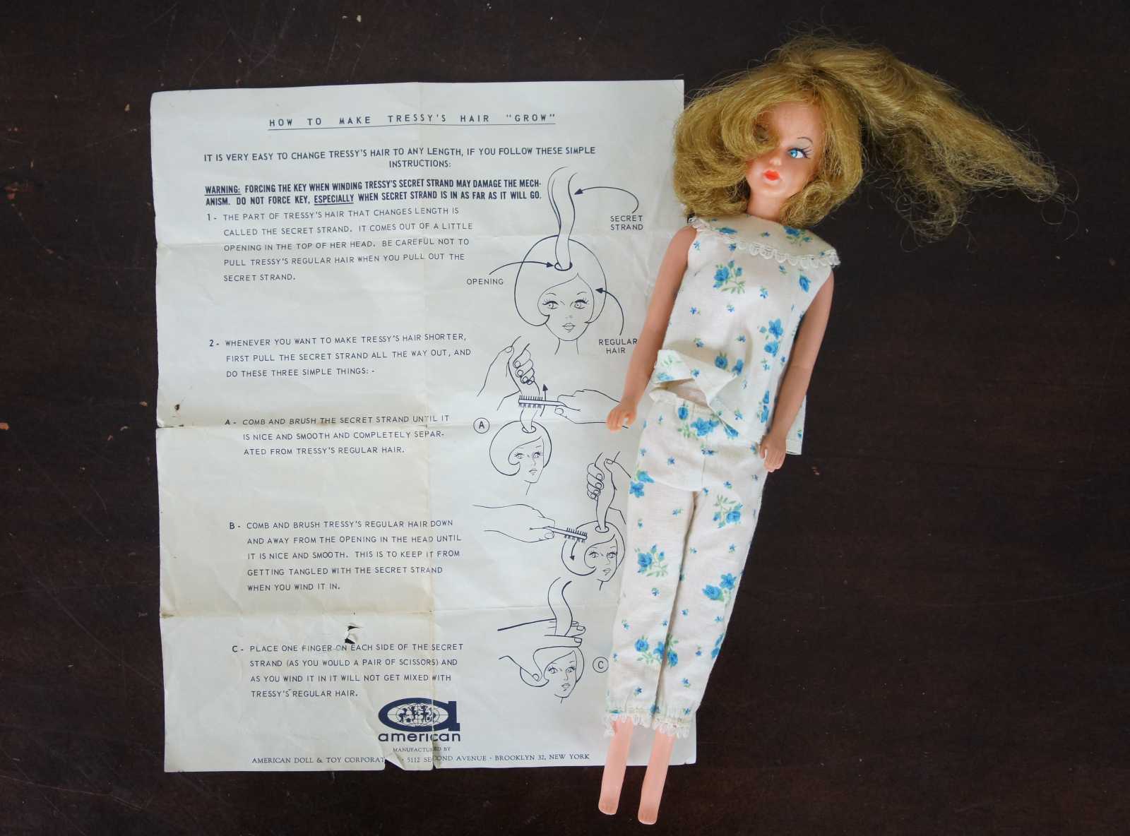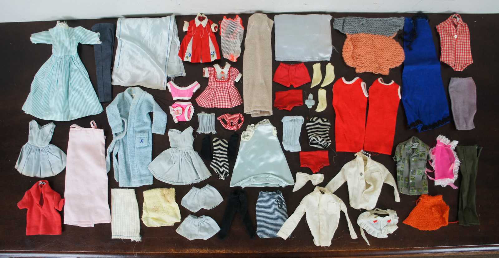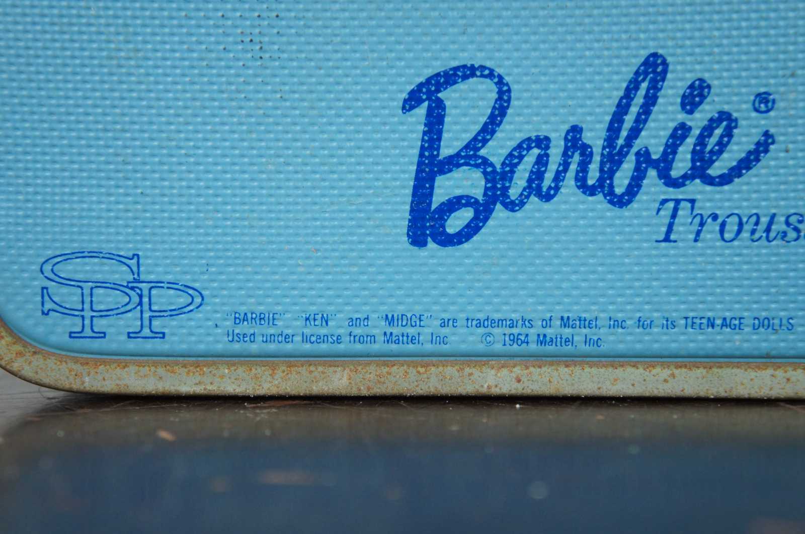 Vintage 1964 Barbie’s Trousseau Trunk and assorted collection of 8 dolls and clothes including one American Doll & Toy Corp’s Tressy doll (instructions included; no key), two matching 1966 Twist & Turn Barbies with posable legs, 1960 Ken doll, brunette Peggy Ann doll, short blonde doll by Deluxe Reading Corp, an unmarked blonde doll with rigid limbs, and a small blonde doll with very bendy limbs (feet melted into case).