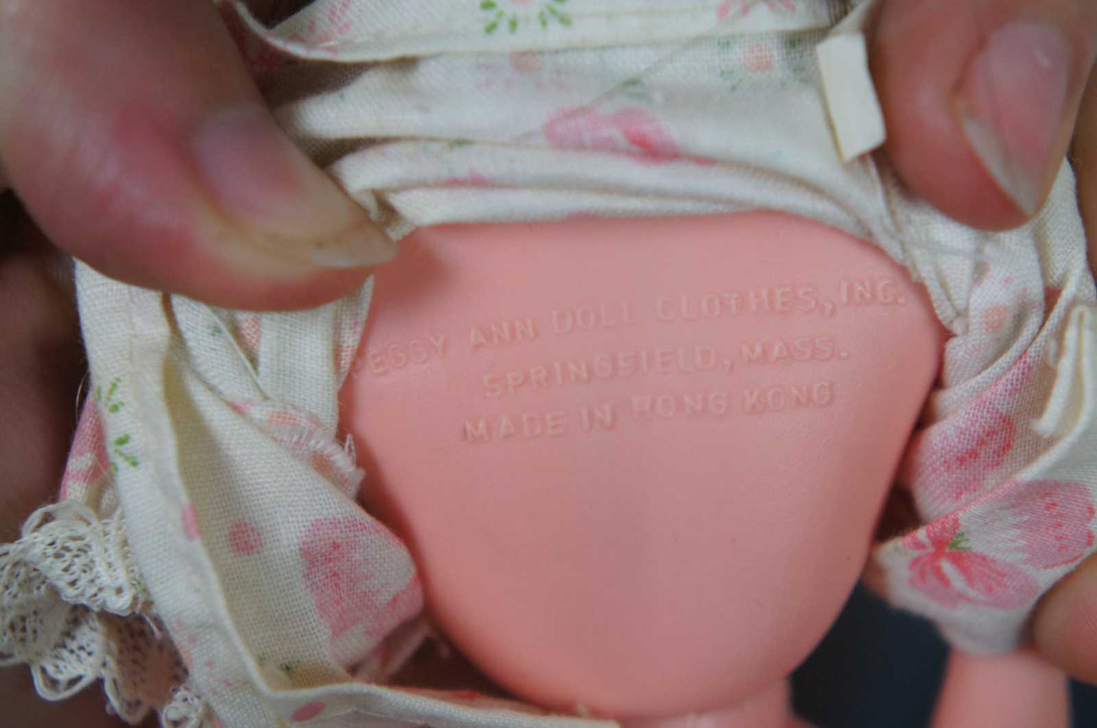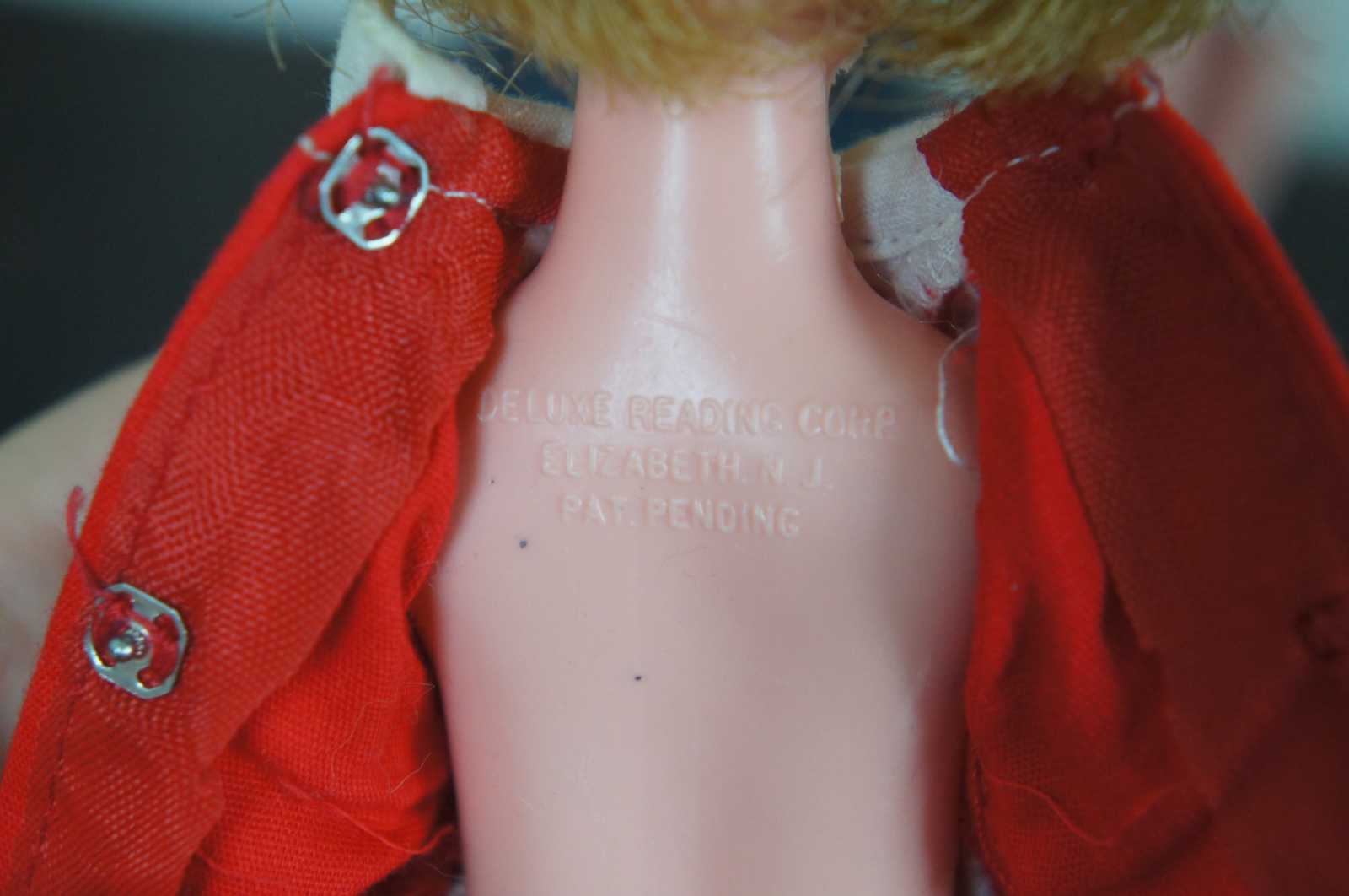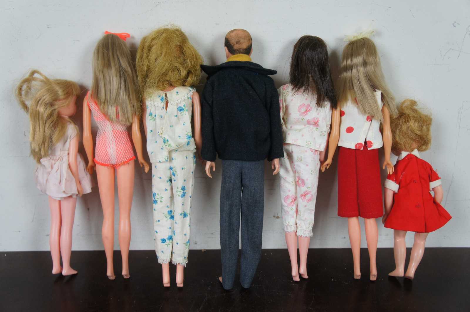 Vintage 1964 Barbie’s Trousseau Trunk and assorted collection of 8 dolls and clothes including one American Doll & Toy Corp’s Tressy doll (instructions included; no key), two matching 1966 Twist & Turn Barbies with posable legs, 1960 Ken doll, brunette Peggy Ann doll, short blonde doll by Deluxe Reading Corp, an unmarked blonde doll with rigid limbs, and a small blonde doll with very bendy limbs (feet melted into case).