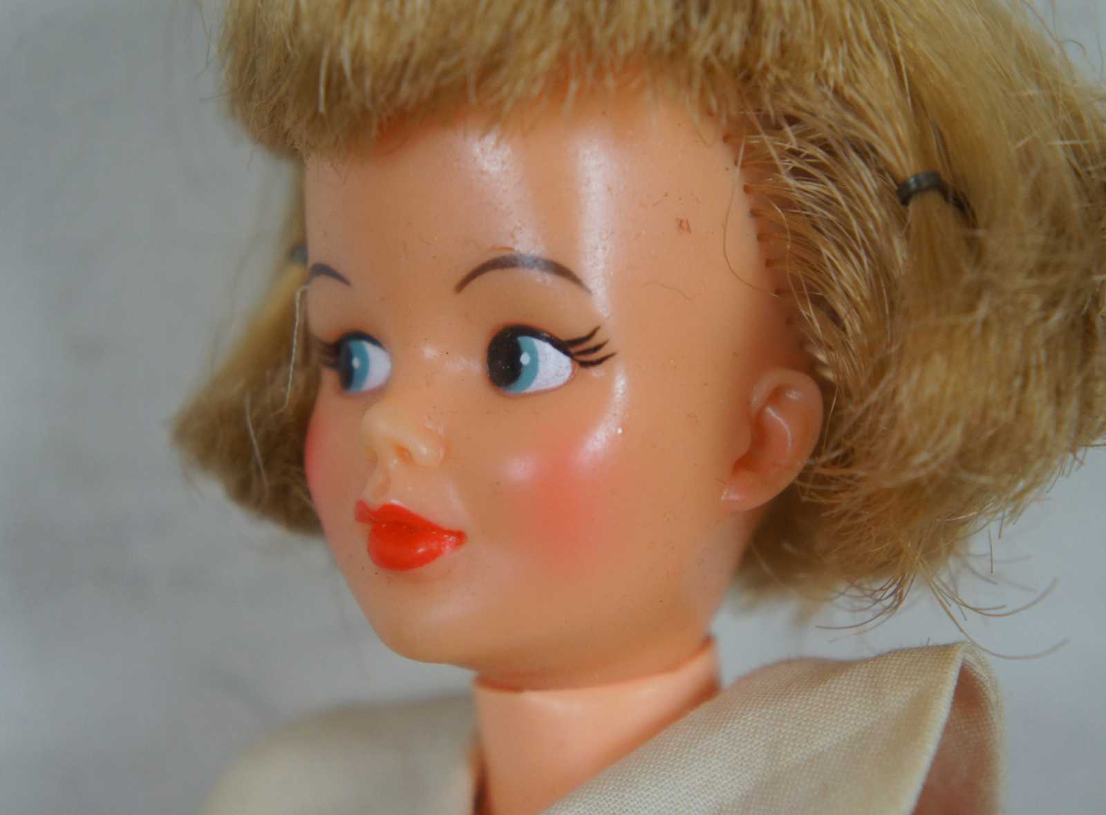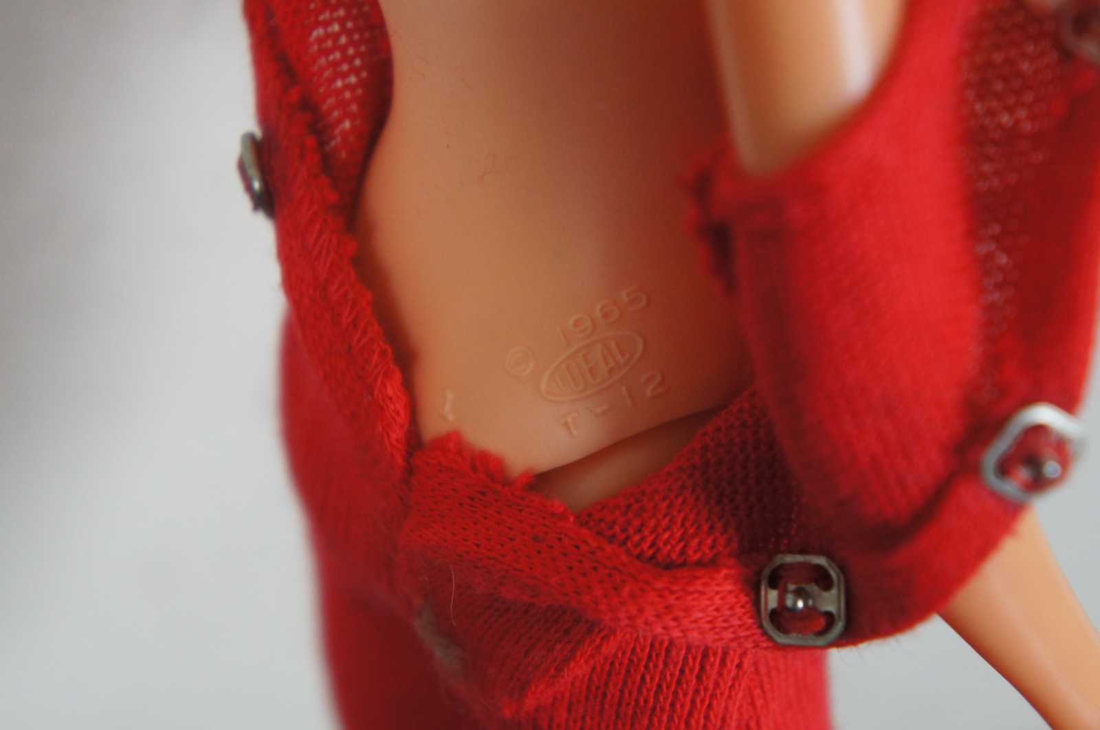 Vintage 1965 Pos’n Tammy doll by Ideal Toy corp, in her original red jumpsuit outfit and plastic telephone booth. Also included are black and white shoes (one missing) and hair comb.