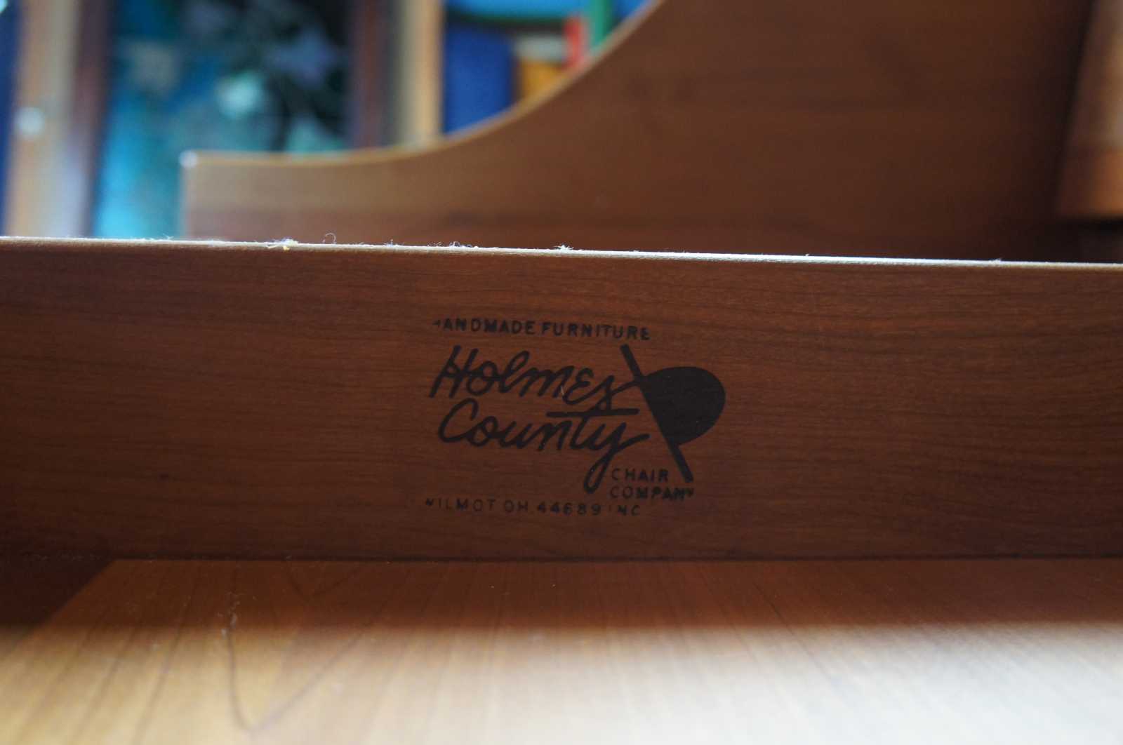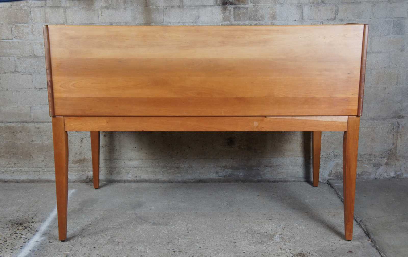 An incredible desk by Holmes County Chair Company. Made from solid cherry with a minimalist streamline shape. Features six fingertailed drawers along the back and cubbies for storage. Table surface is leather lined along the center and features dual action, hinging open to reveal additional storage. Legs remove for ease of transport. Holmes County near Canton, Ohio has been handcrafting furniture since 1980.