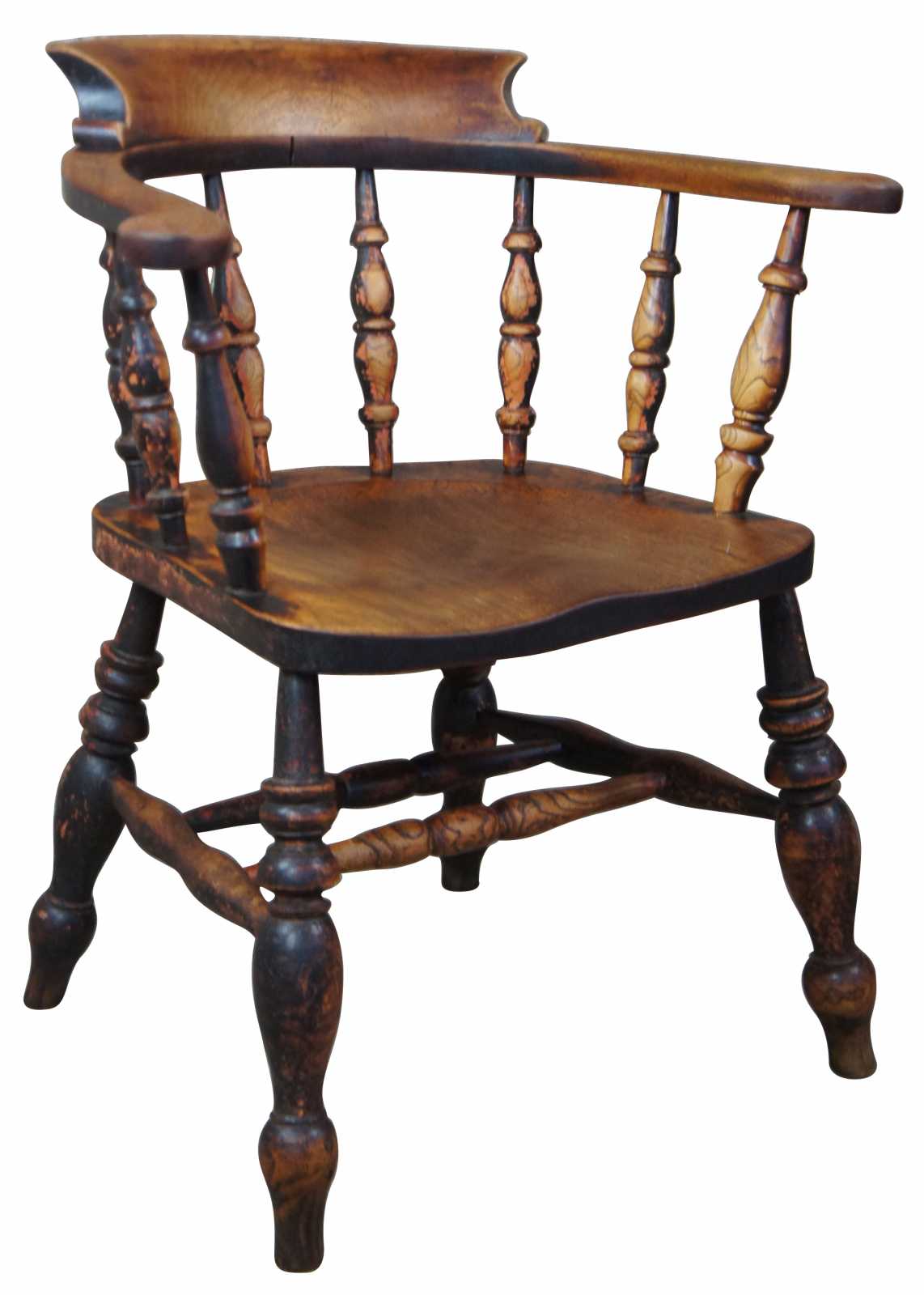 Good overall condition, distressing and heavy wear to finish commensurate with age and use, oak chair has split to seat, see pictures.