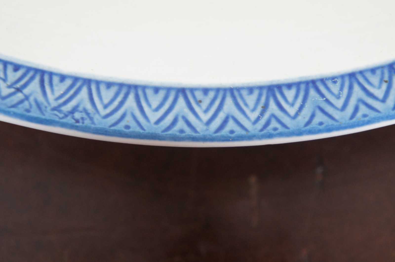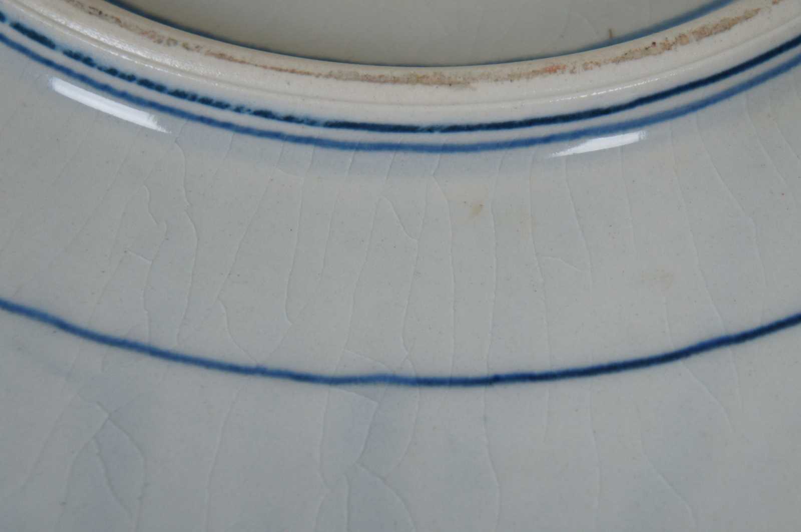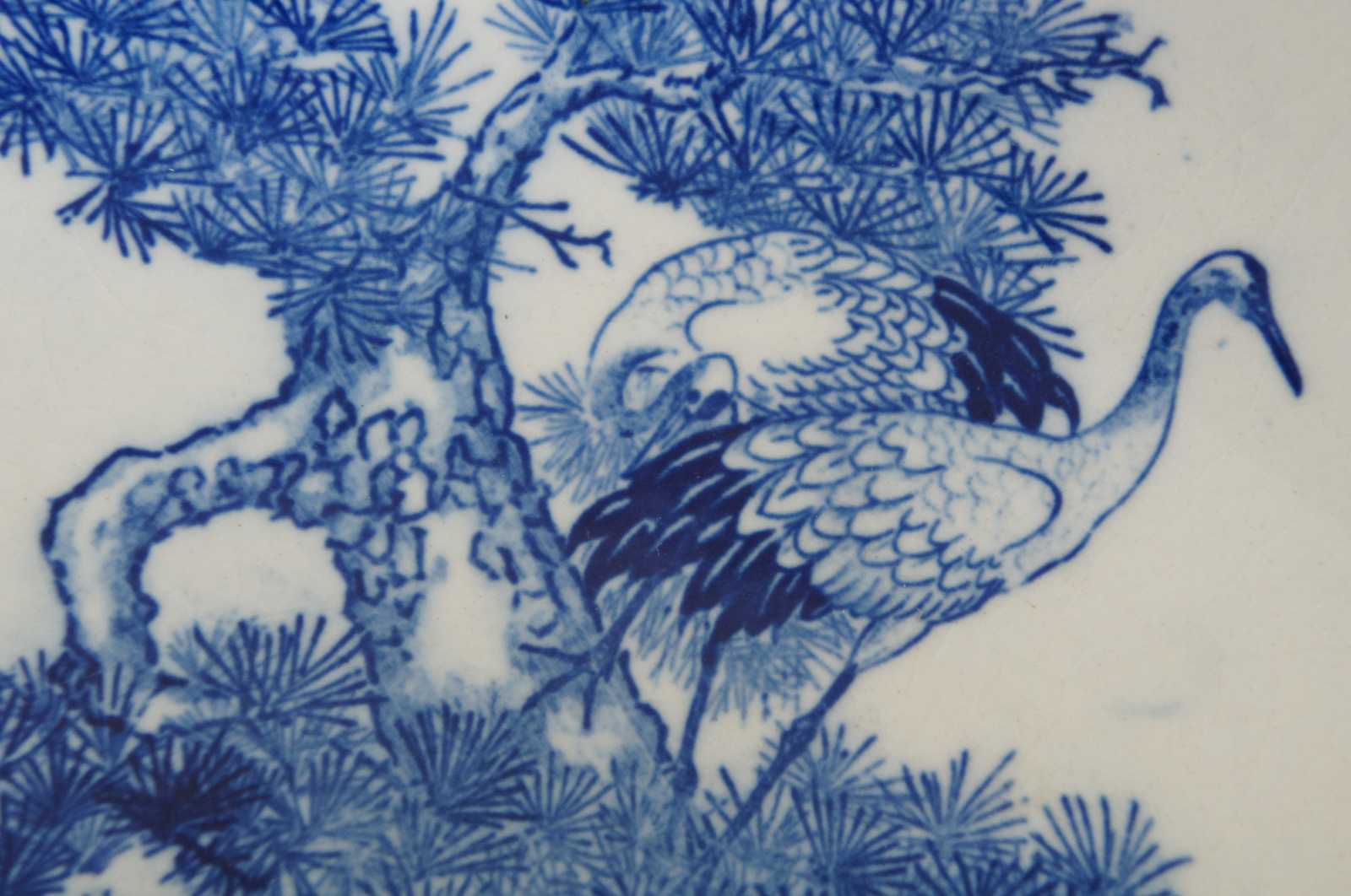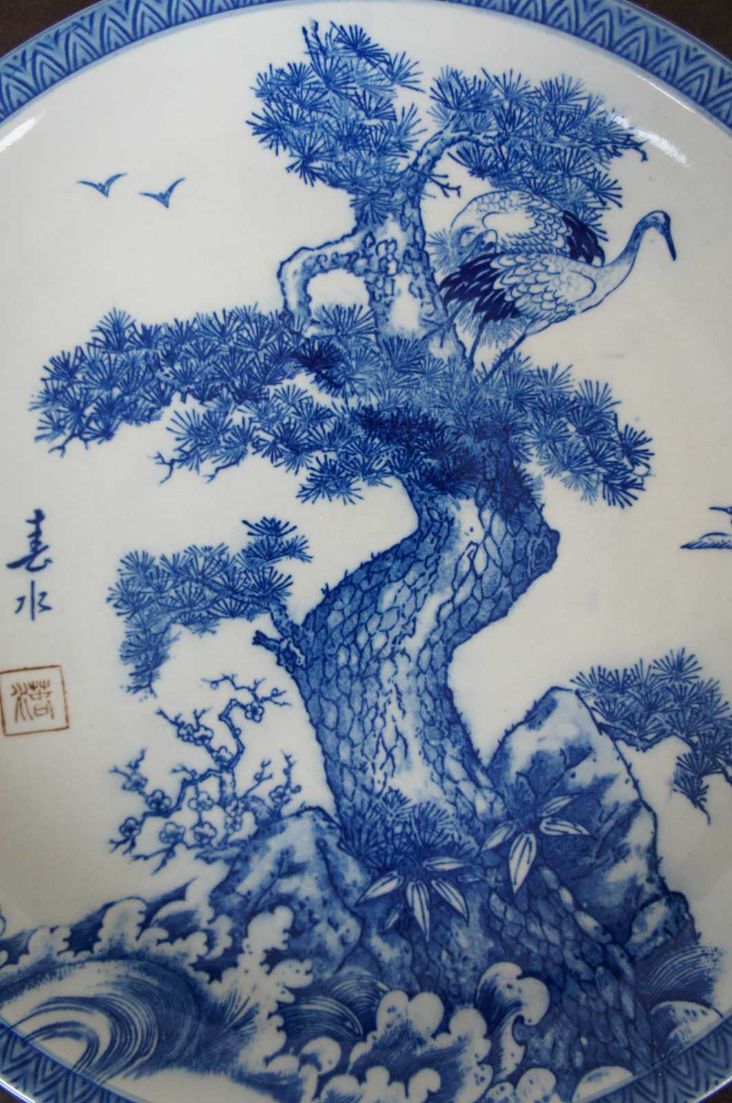 Antique Japanese Imari blue and white porcelain plate or charger featuring a gnarled pine with water at the base and three cranes / storks. Signed / marked / stamped on front and back.