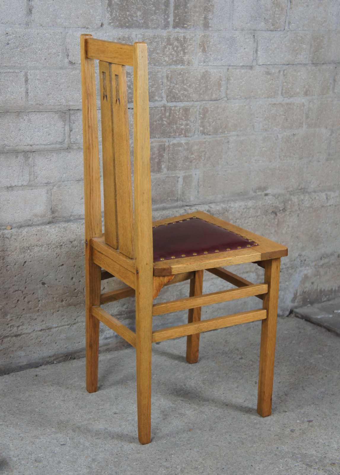 Circa 1920s arts and crafts oak dining or side chair. Features a burgundy leather seat with nailhead trim and a pierced rear splats with ribbon design.