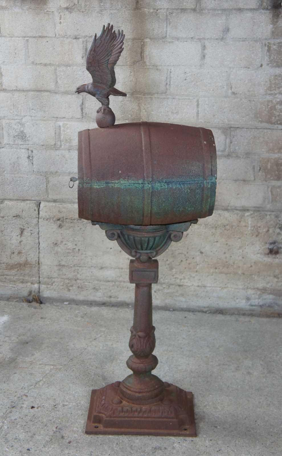 A fun vintage cast iron oak barrel shaped mailbox. Features an eagle finial and ornate base that can be bolted to the ground for safetly. Includes lock and key.