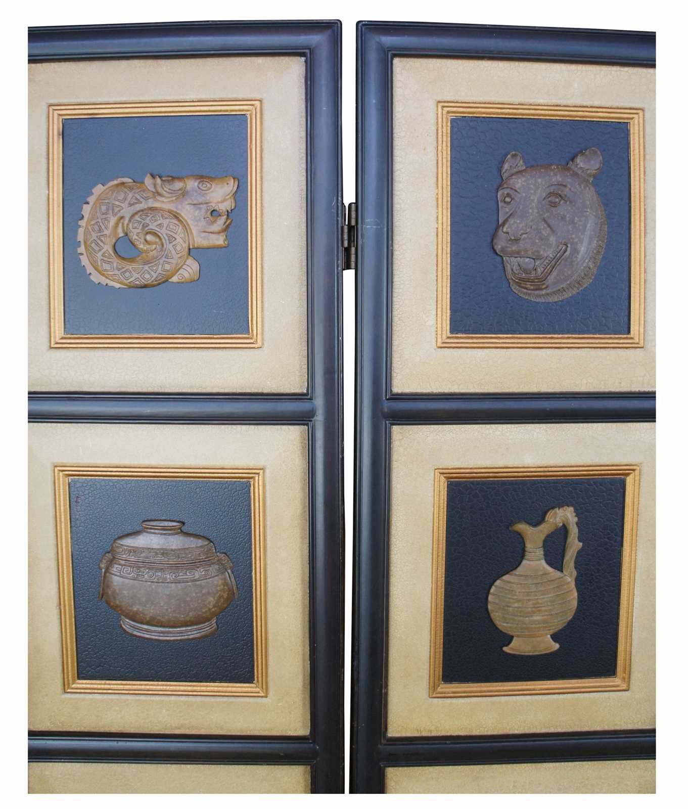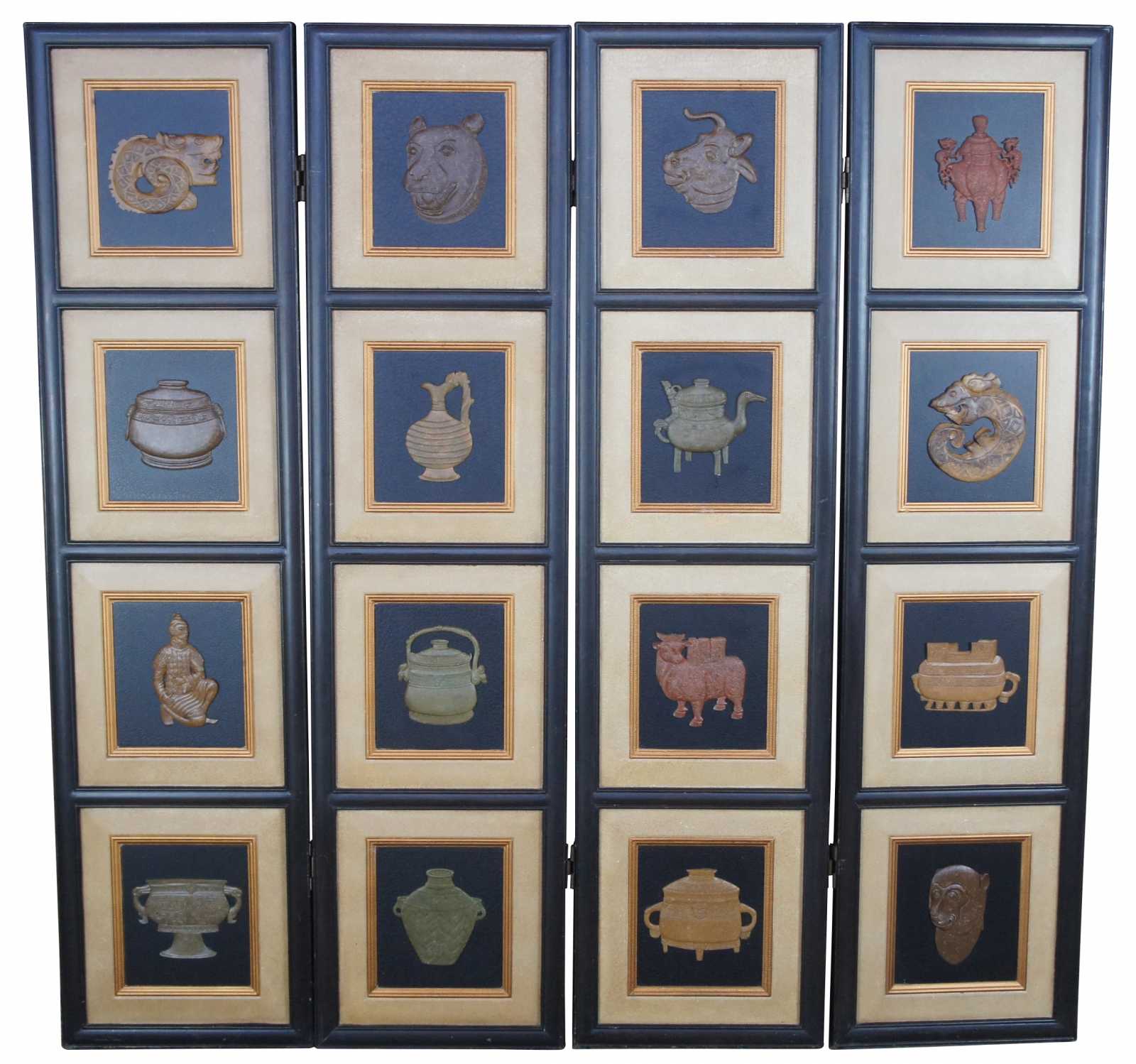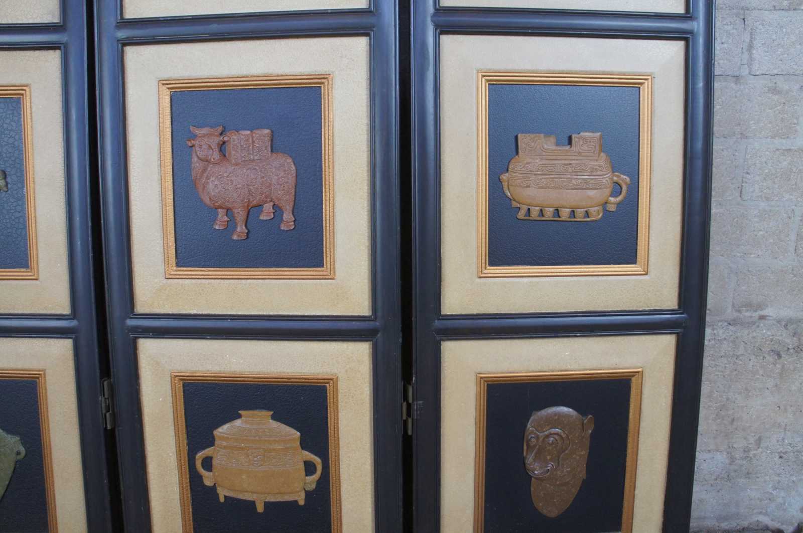 Vintage Chinese style room divider or folding screen. Made of wood and faux stone carved into ornate sillouettes of animals and pottery. Features a dragon / serpent, bear / dog, cow / bull, sensors, pots, pitchers, incents burners, buddha, vessels, a warrior / man and a monkey.