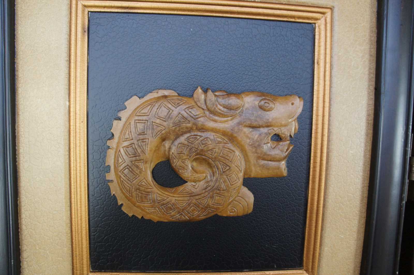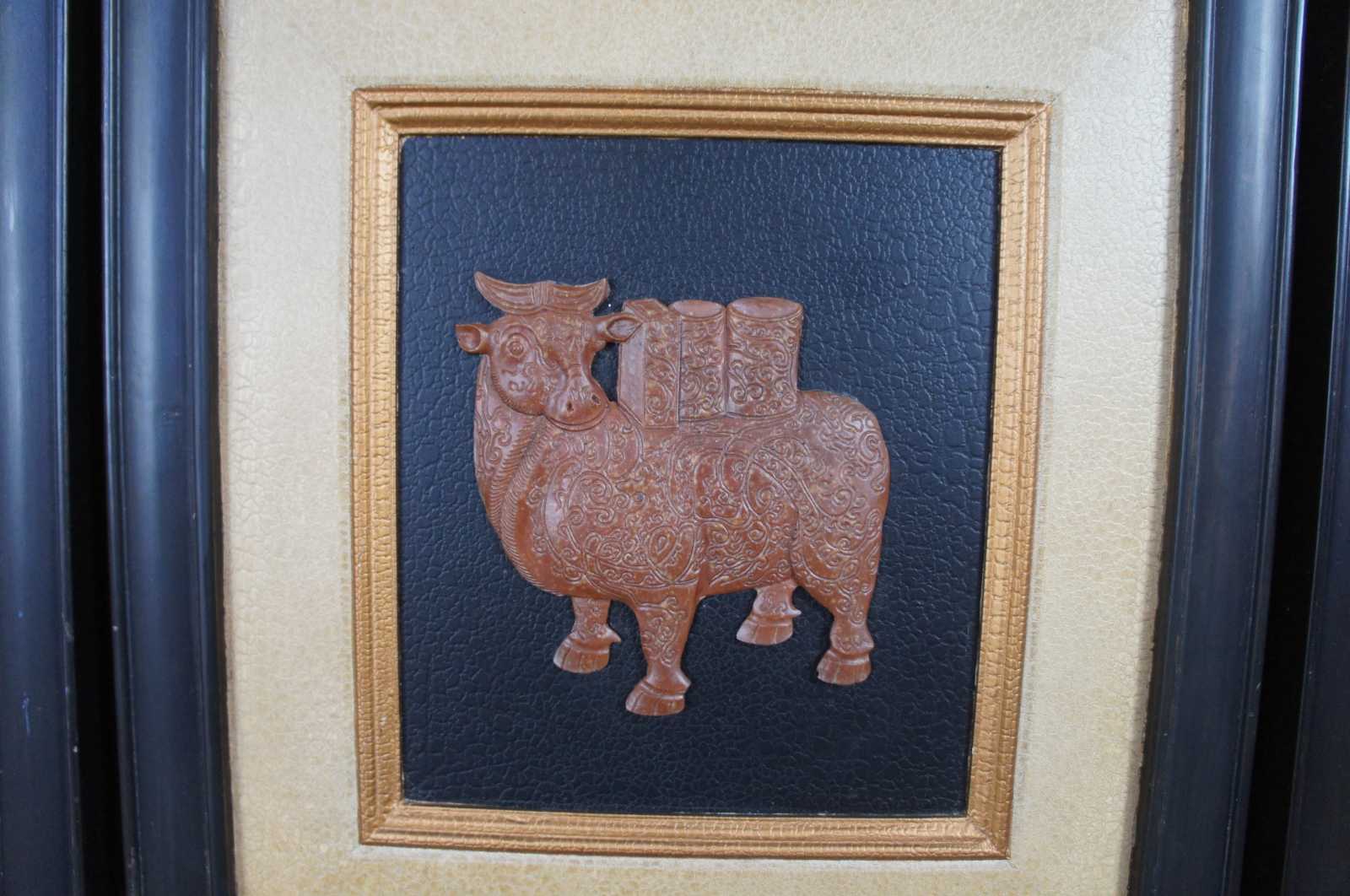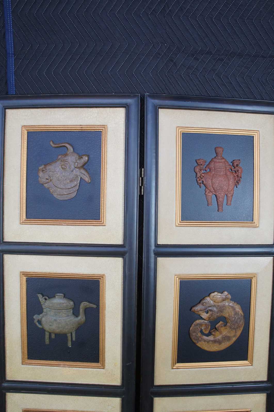 Vintage Chinese style room divider or folding screen. Made of wood and faux stone carved into ornate sillouettes of animals and pottery. Features a dragon / serpent, bear / dog, cow / bull, sensors, pots, pitchers, incents burners, buddha, vessels, a warrior / man and a monkey.