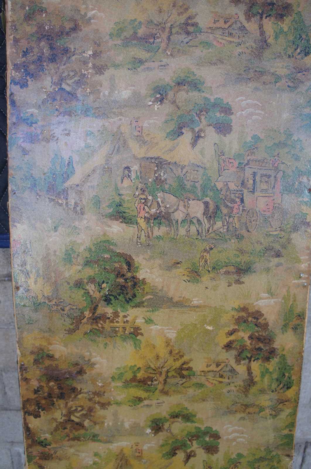 Late Victorian room divier. Features a repeating country landscape with a horse and buffy being loaded outside of a cottage.