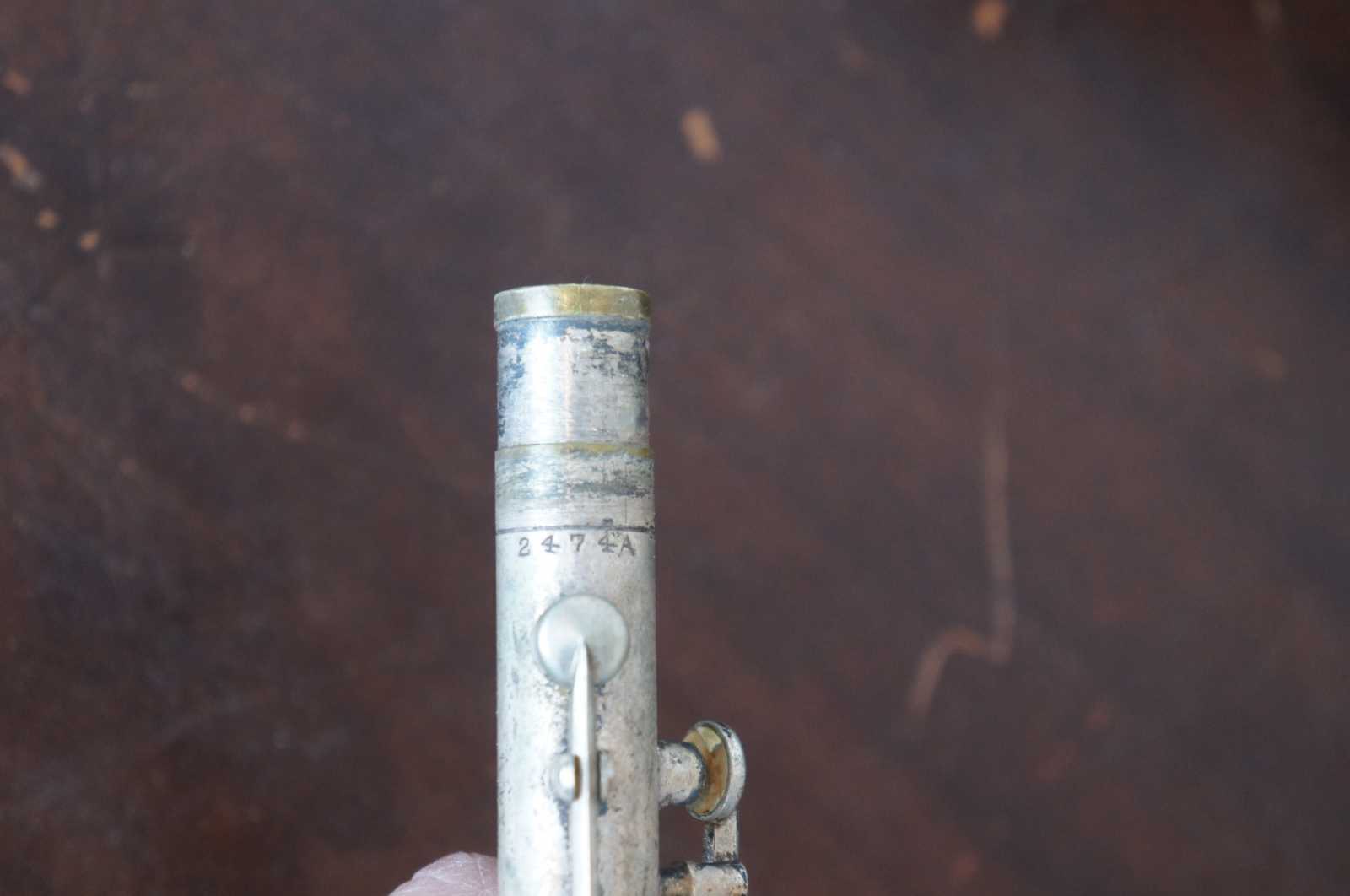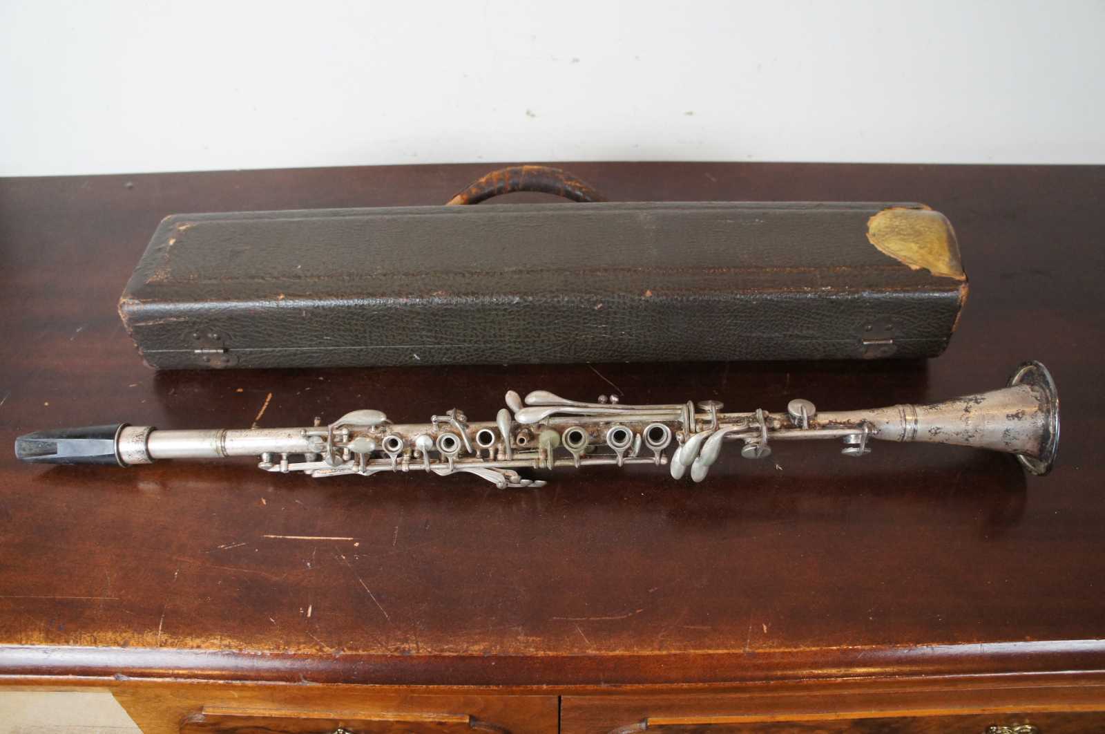 Antique European silver plated Superior clarinet and case with music holder attachment. Attributed to Paul Dupre.