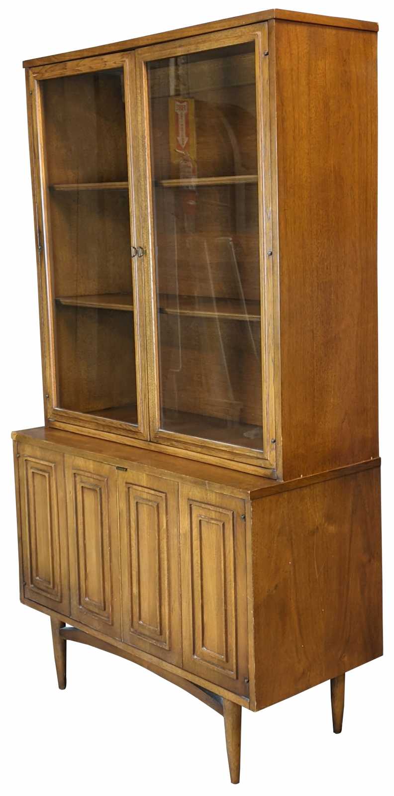 Circa 1960s Broyhill Premier Sculptra collection bookcase or china cabinet. Made of walnut with mid century modern styling. Tapered legs support a two door compartment with inner drawer, and two glass doors open to three shelves.