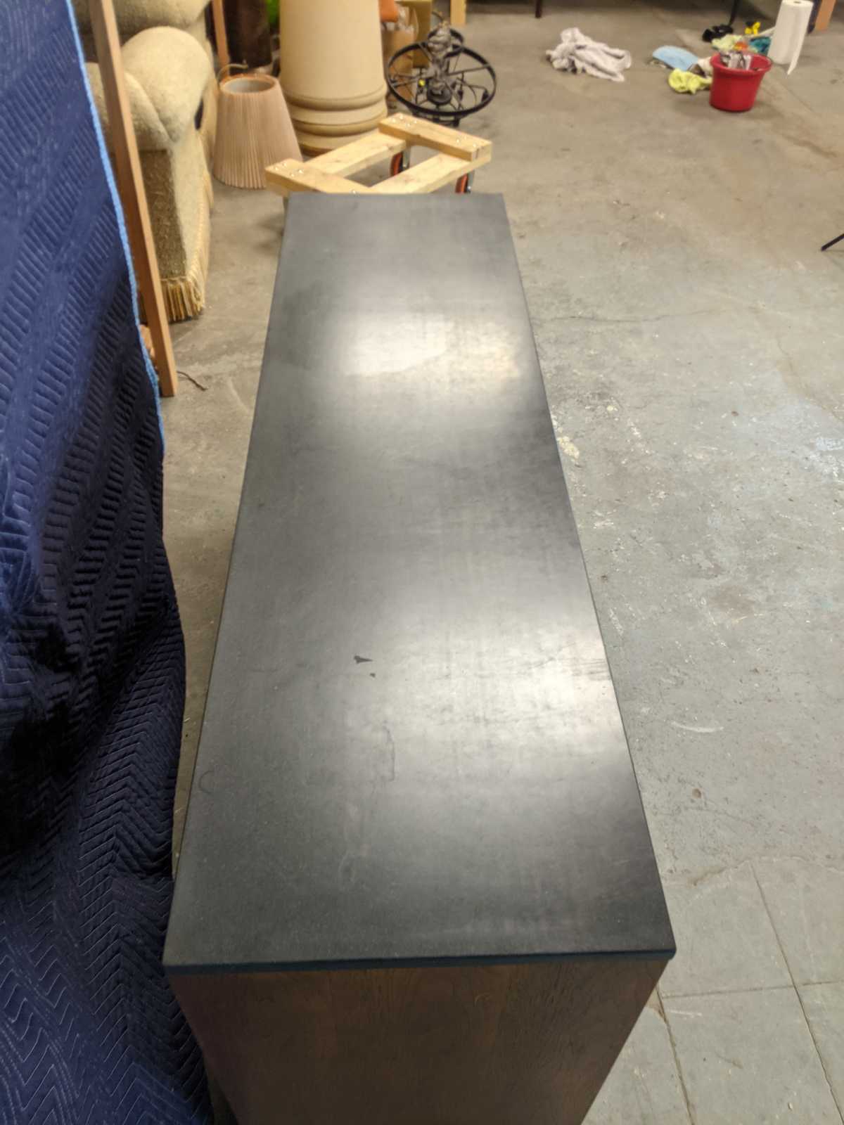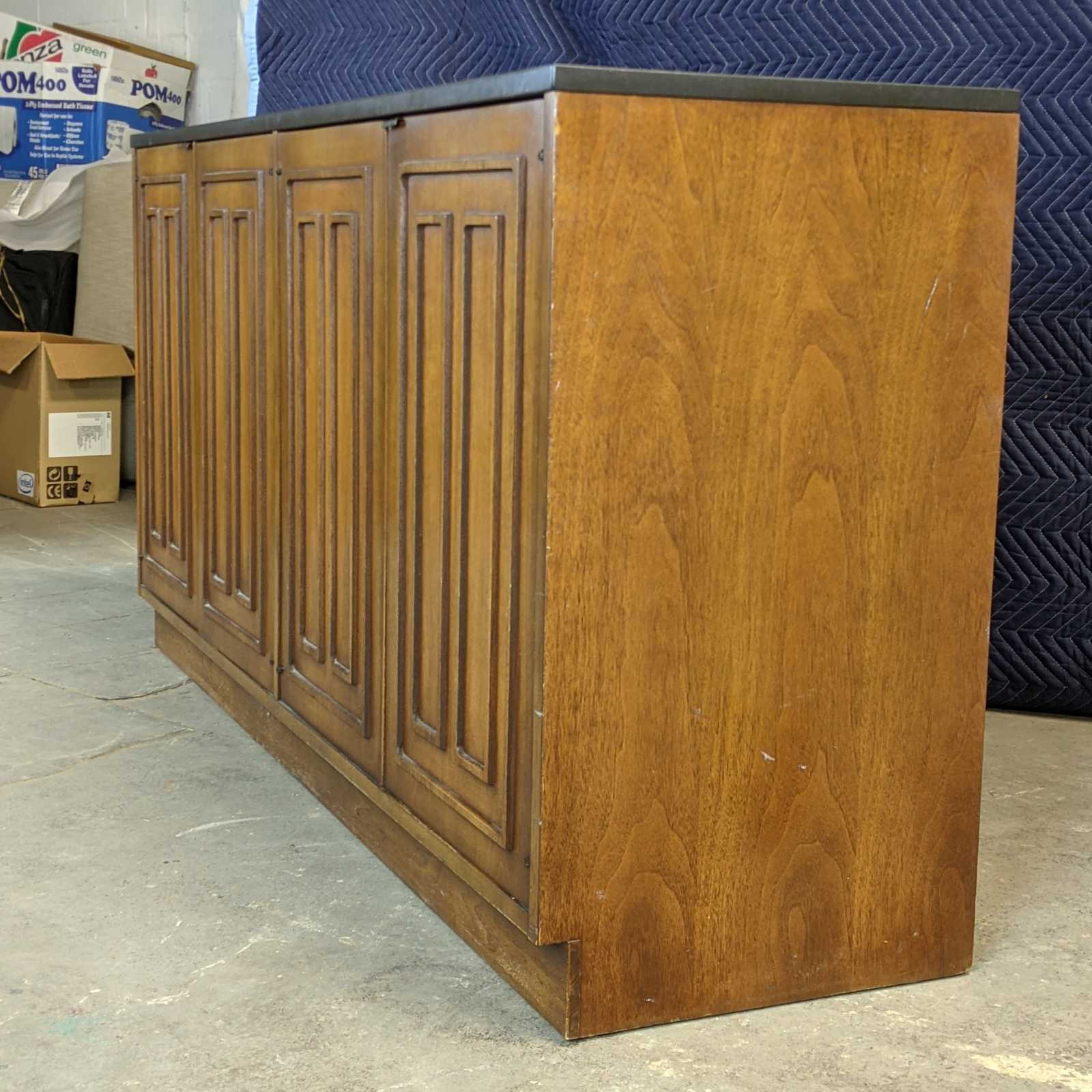 Circa 1960s Broyhill Premier Sculptra collection buffet or credenza. Made of walnut with slate top and mid century modern styling. The bottom doors open to reveal four drawers, three shelves, and a silverware / flatware drawer.