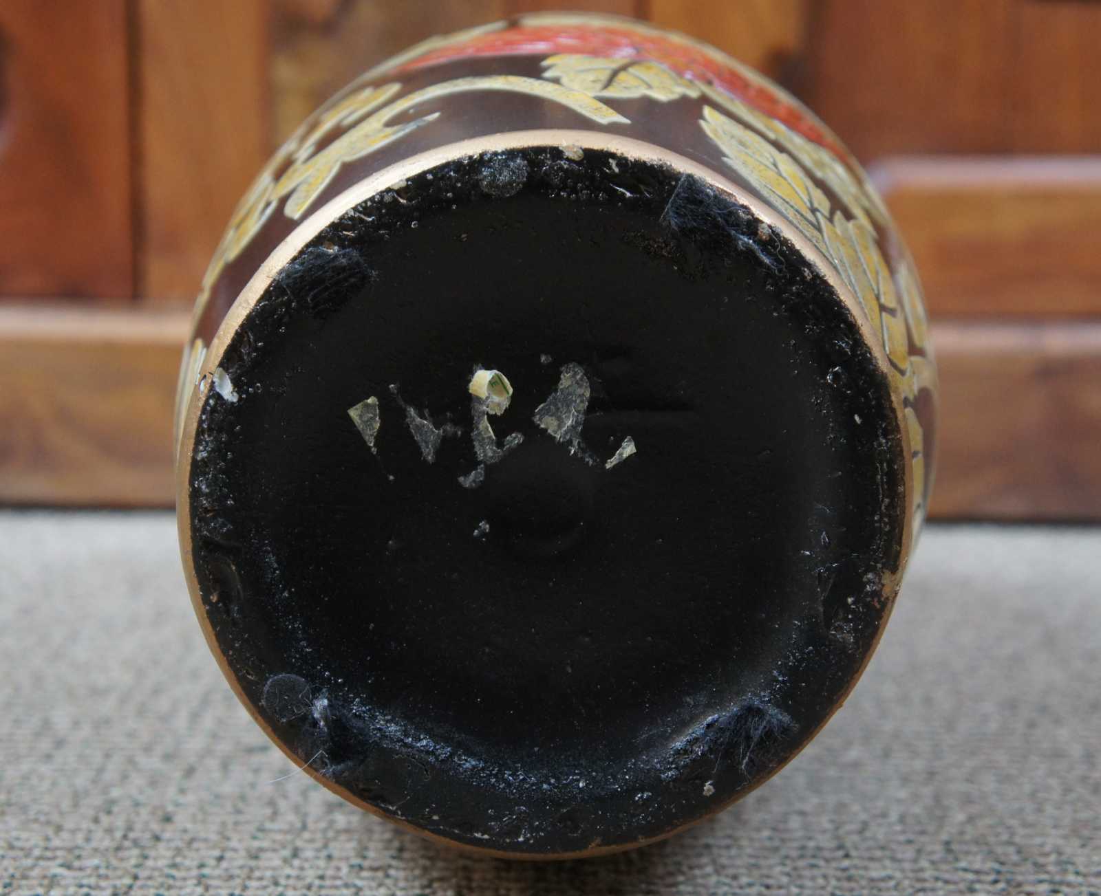 Vintage ceramic Asian floor vase featuring red flowers and yellow vines swirling over a black background.