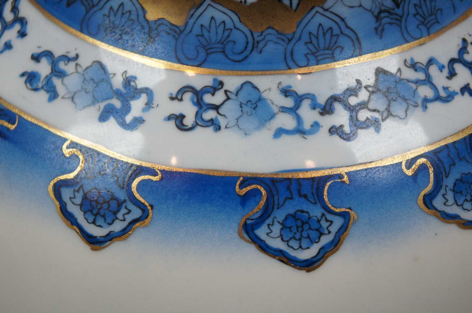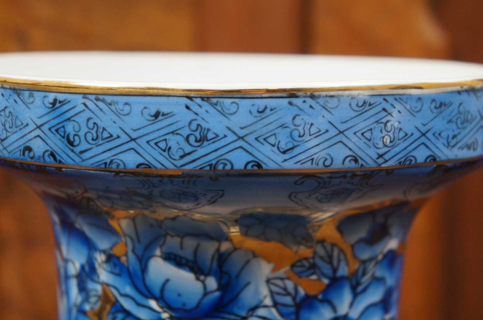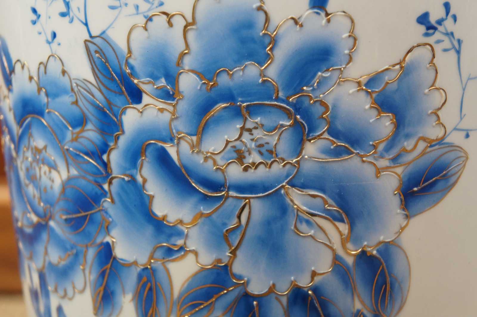 Vintage blue and white gilded Asian floor vase or urn with a design of flowers and birds.