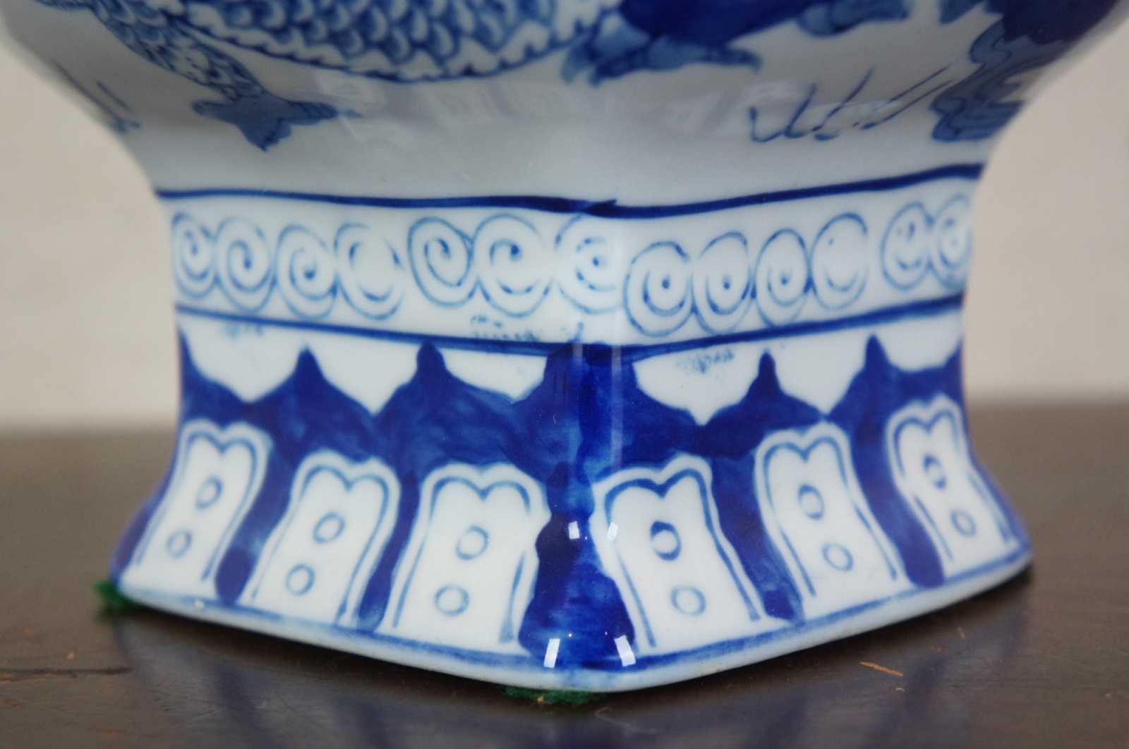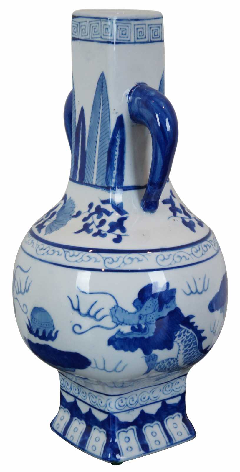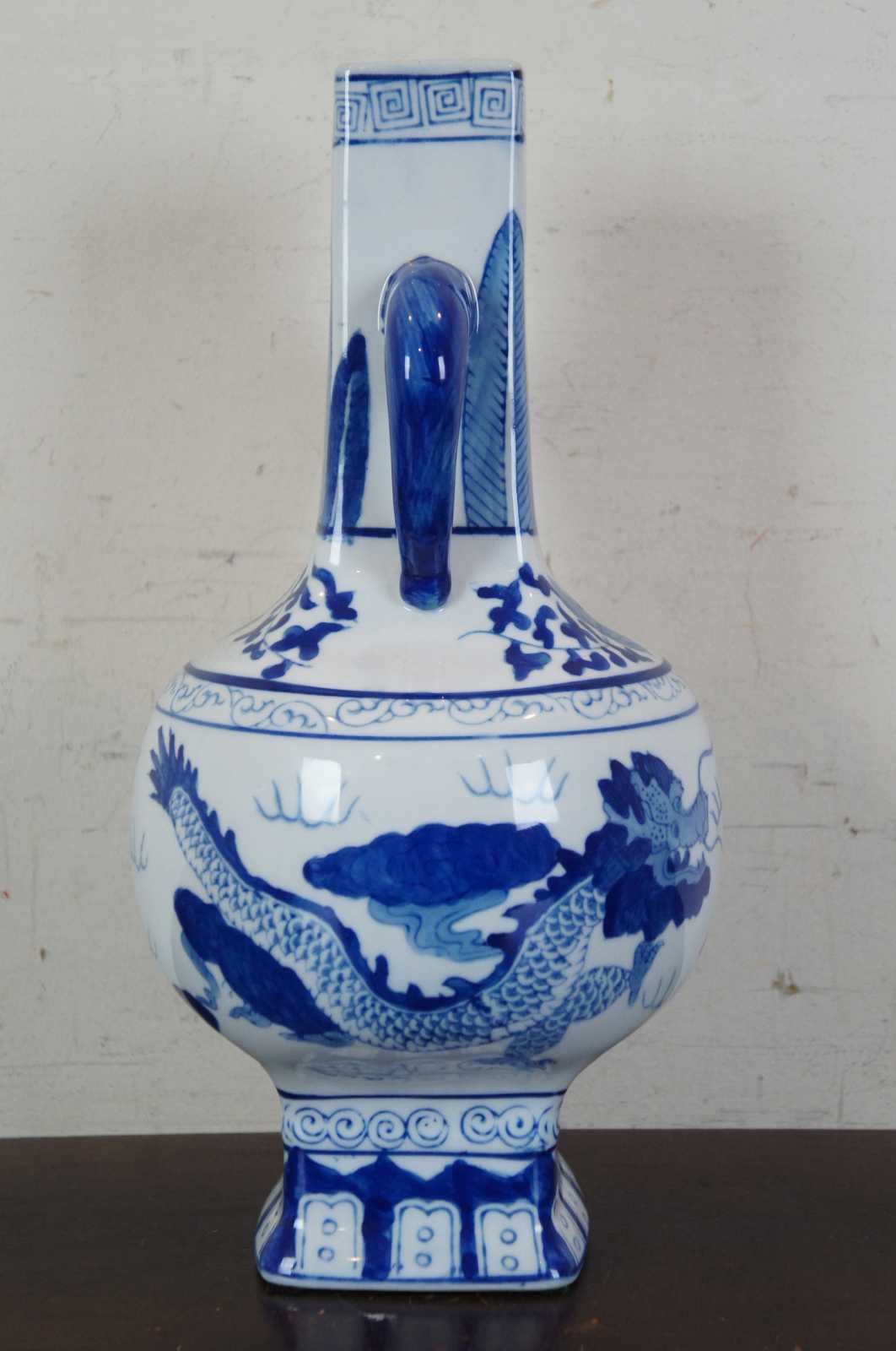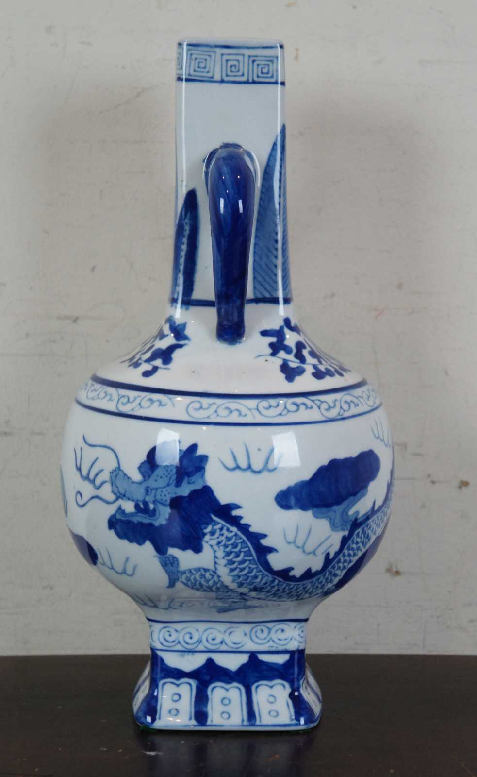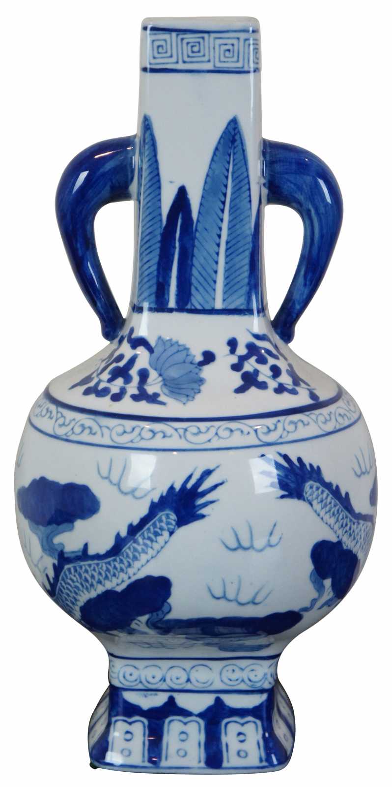 Vintage Chinese blue and white porcelain vase with handles featuring two dragons or serpents. Marked on base.
