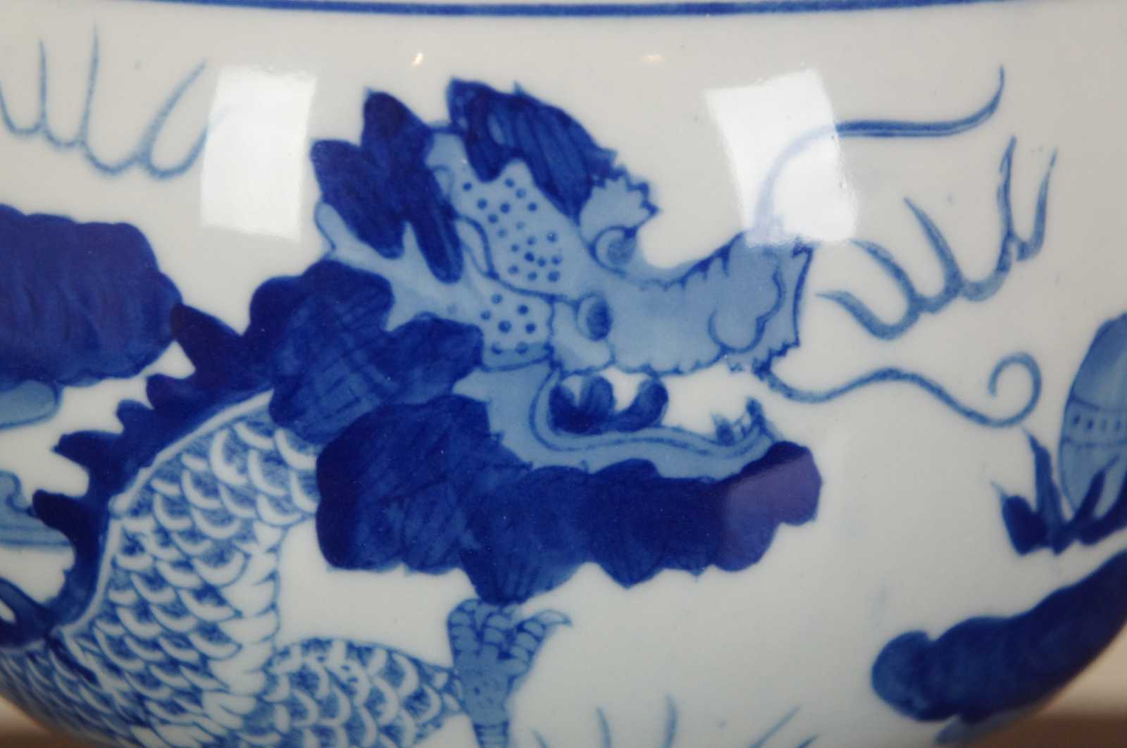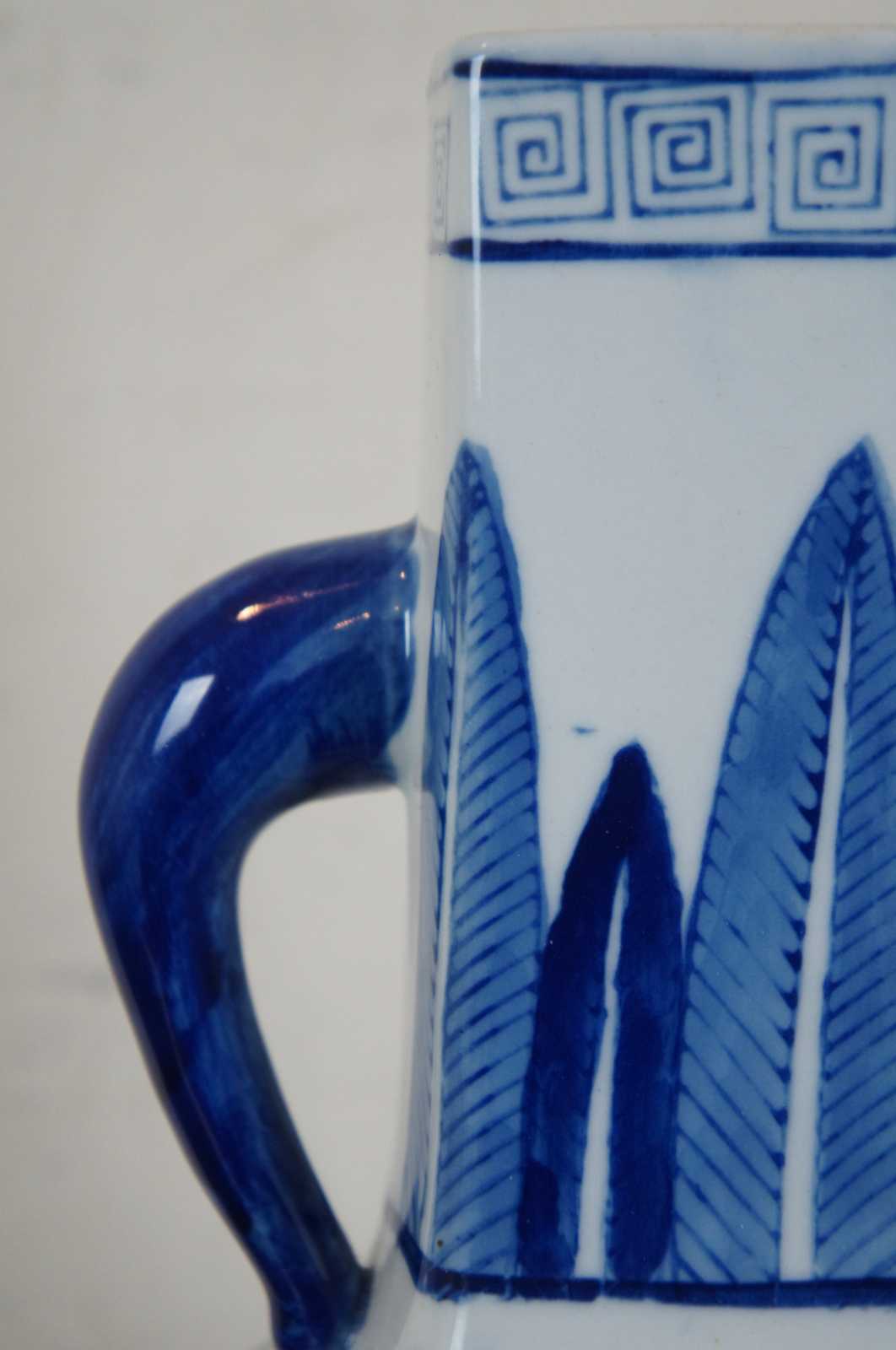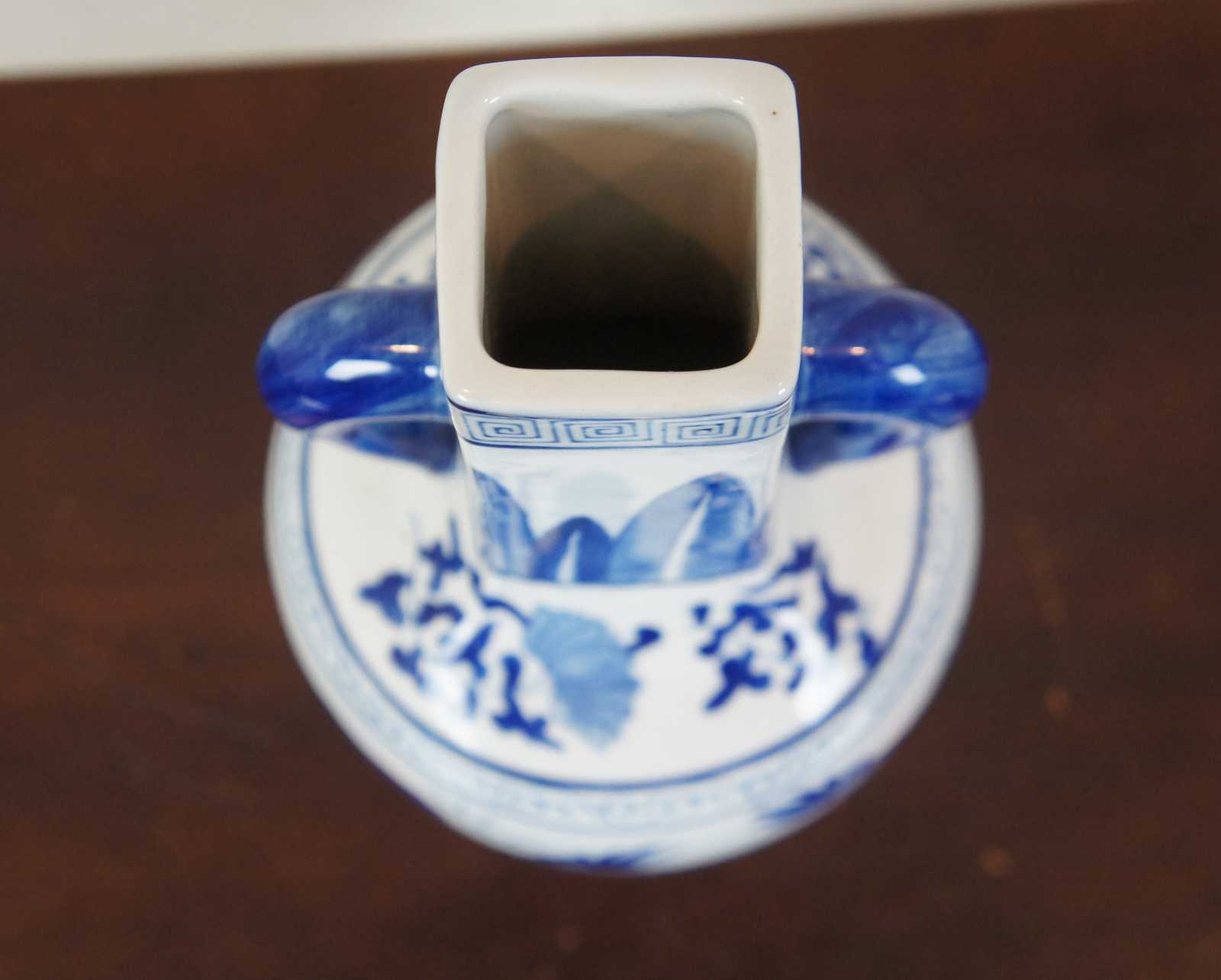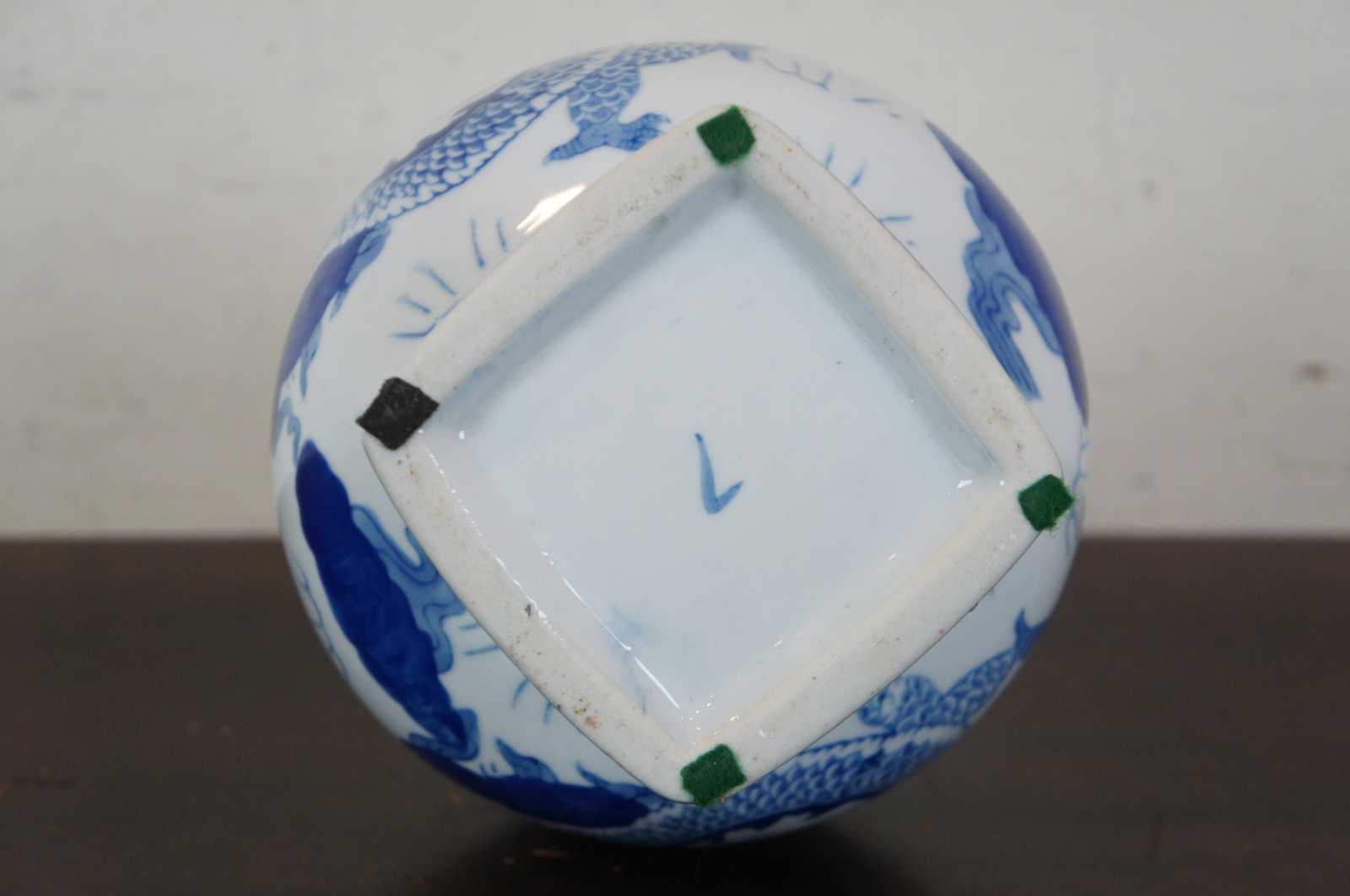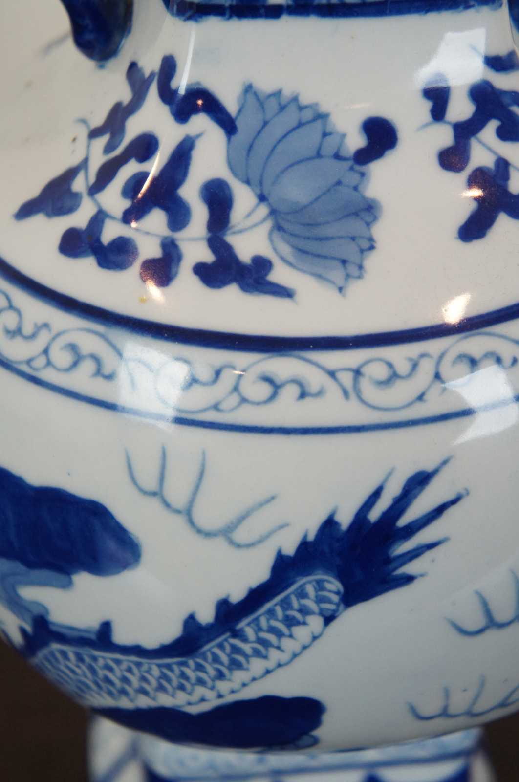 Vintage Chinese blue and white porcelain vase with handles featuring two dragons or serpents. Marked on base.