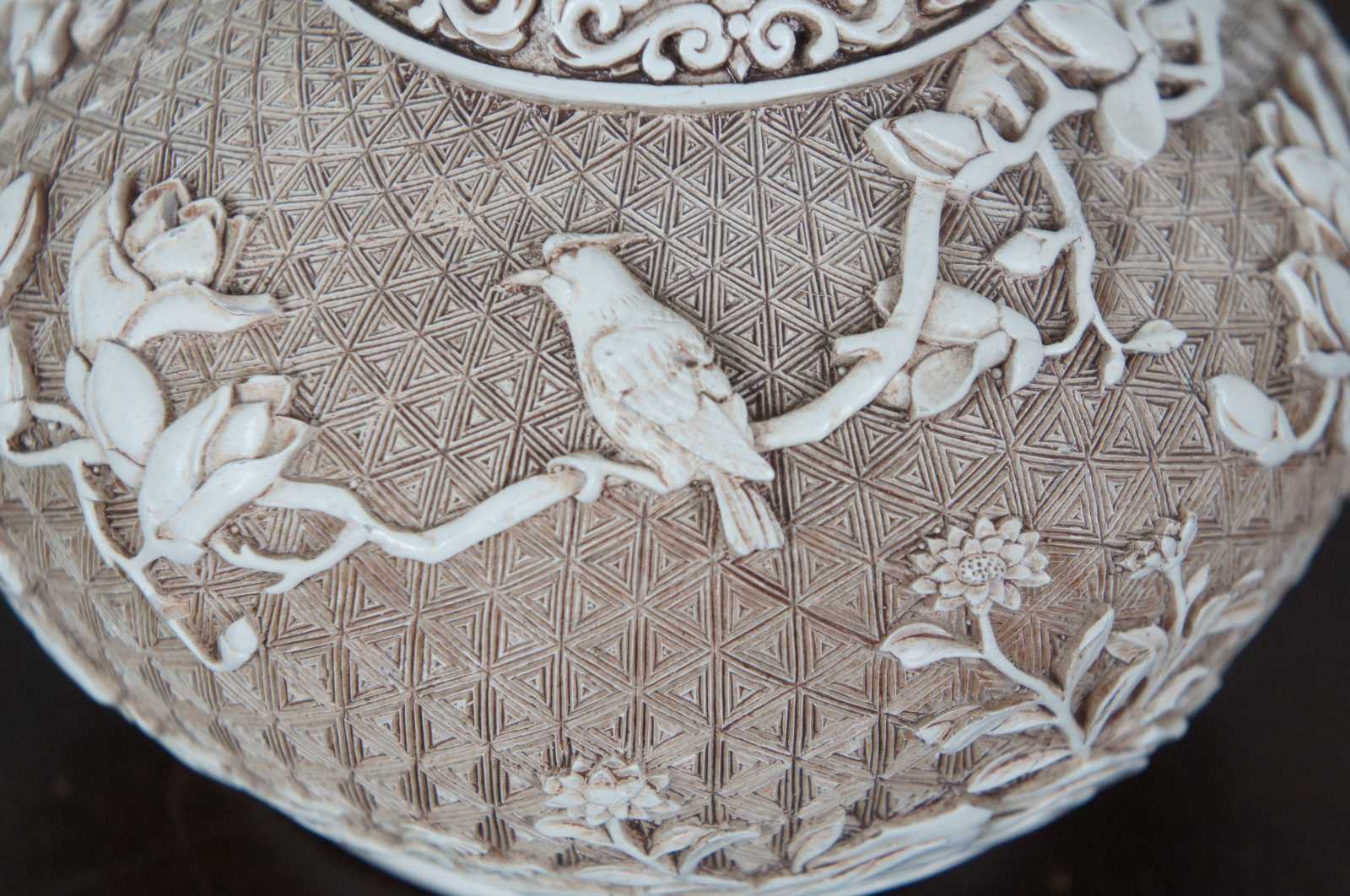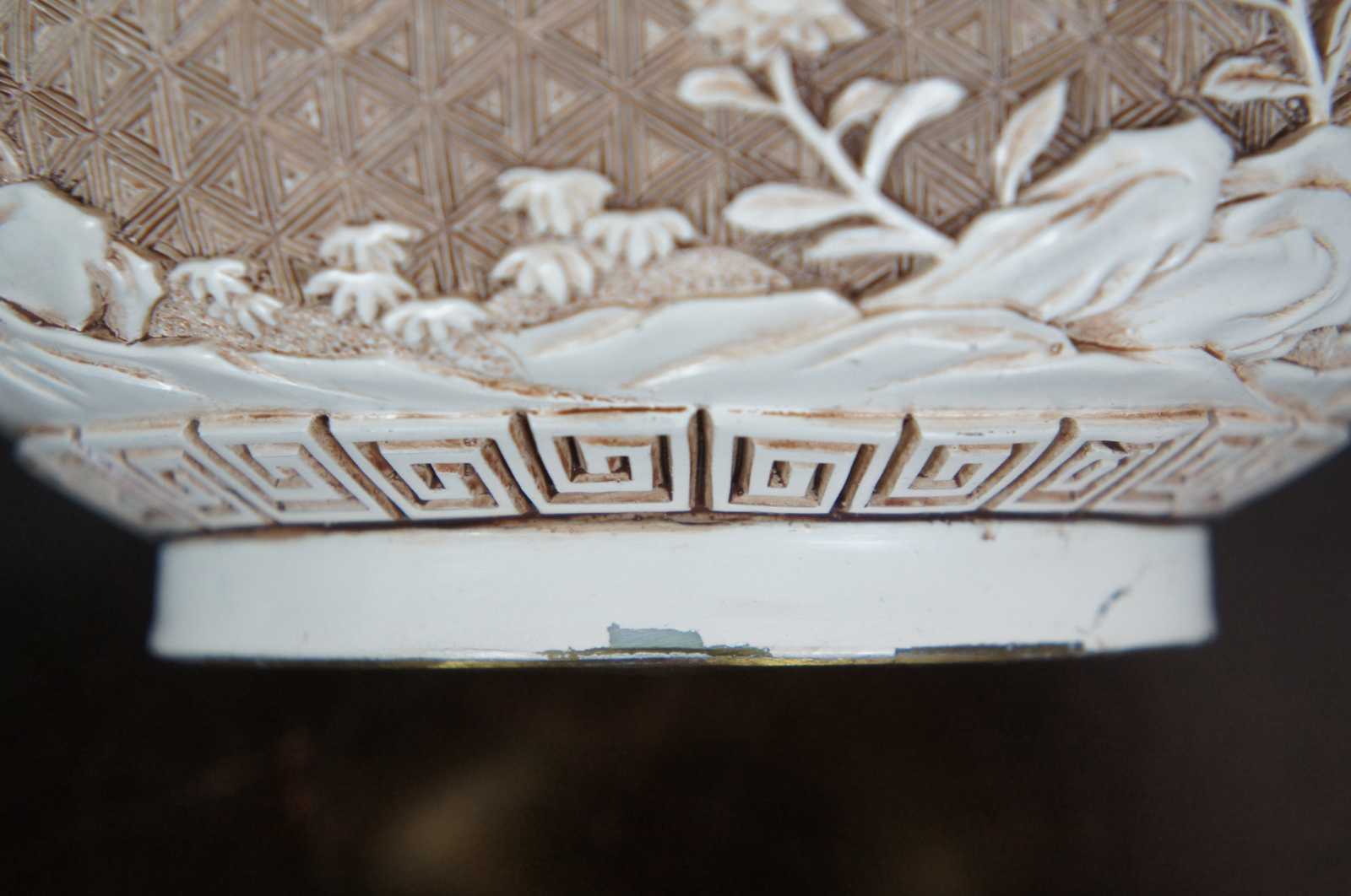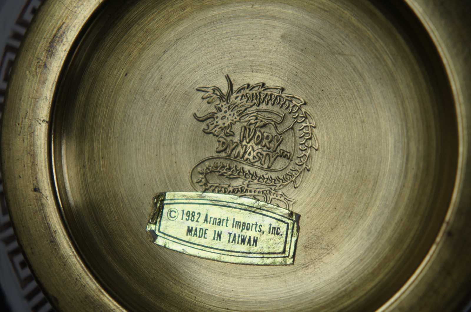Vintage 1982 Arnarts Ivory Dynasty white cinnabar, carved resin vase with cherry blossoms and birds and inlaid brass around the mouth.