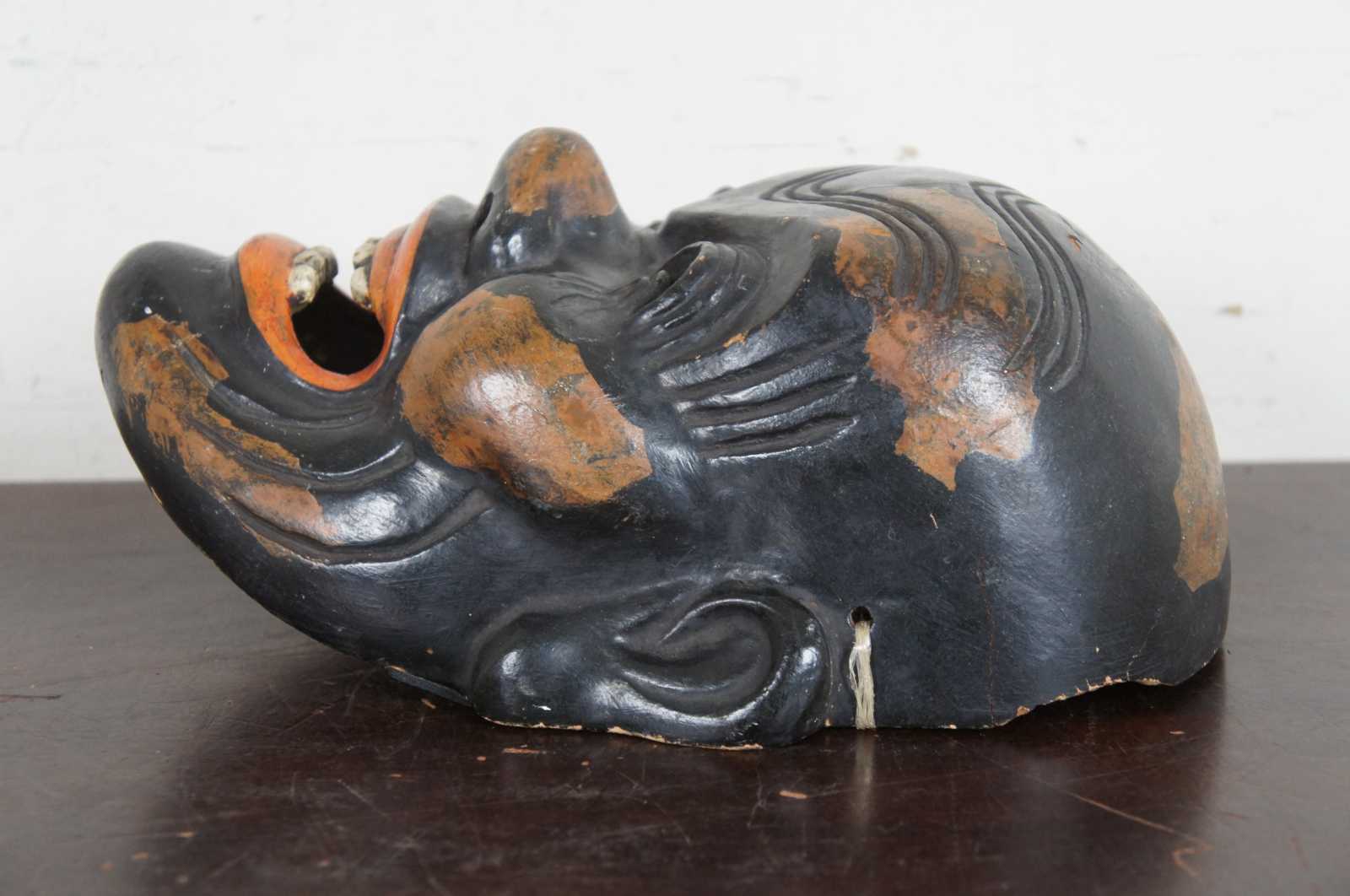 Antique Japanese Bugaku or Noh Mask, Late 19th Century Antique Japanese Bugaku mask of an old man laughing. The mask is made of wood and lacquer. Hand painted and signed on the inside. Japan, late Edo or early Meiji period. The character is known as Heishitori or wine bearer, in the dance Kotokuraku. These masks were often used in theater (Gigaku) at Shinto festivals.