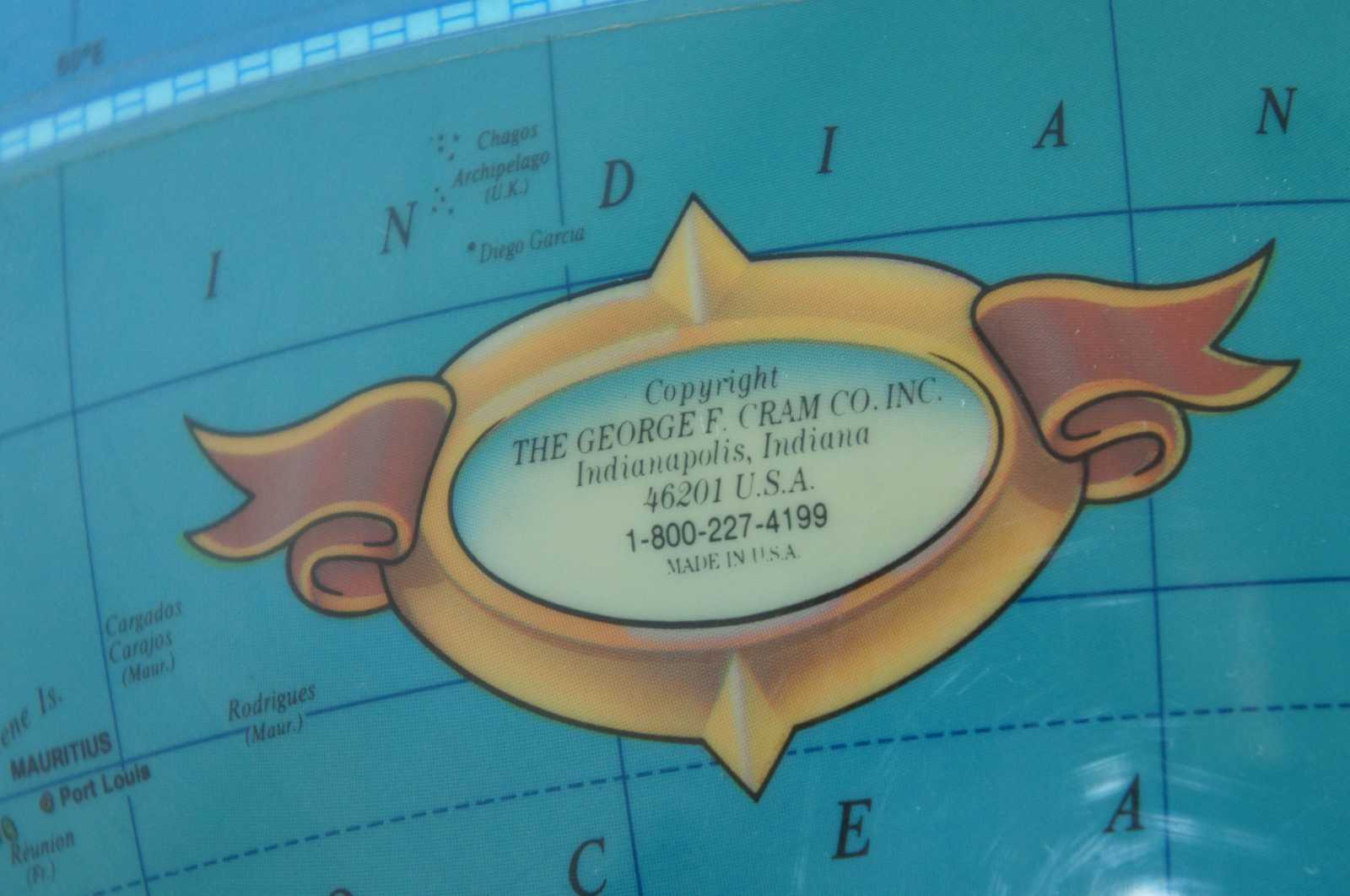 The Classica globe by George F. Cram Co. Inc. Globe sits loose in a metal cradle style stand marked with mile markers and time zones, allowing the user to see the time for any location on the planet at any time.