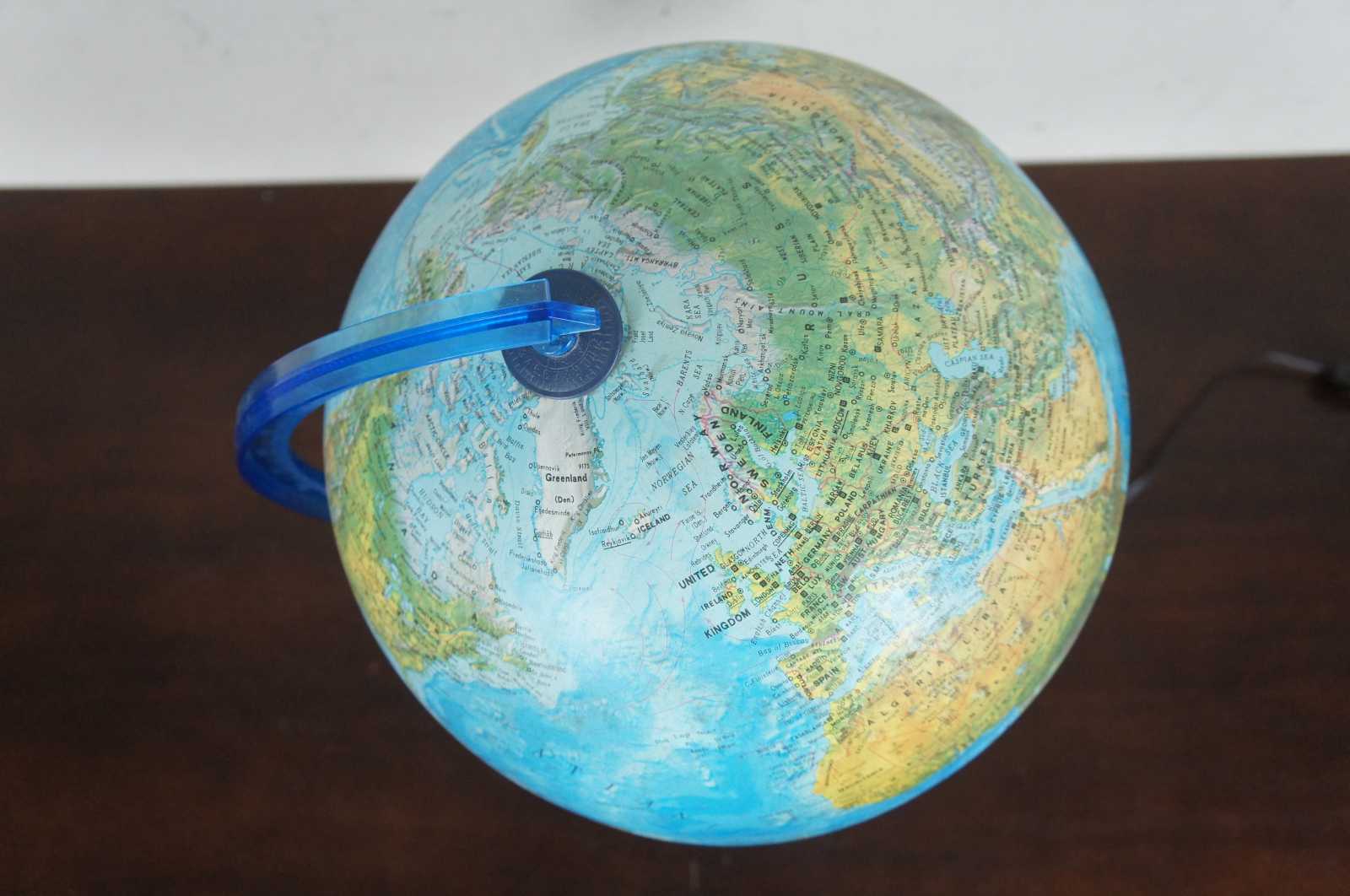 Vintage Nova Rico Ricoglobus illuminated, night light desk globe suspended on a blue plastic stand.