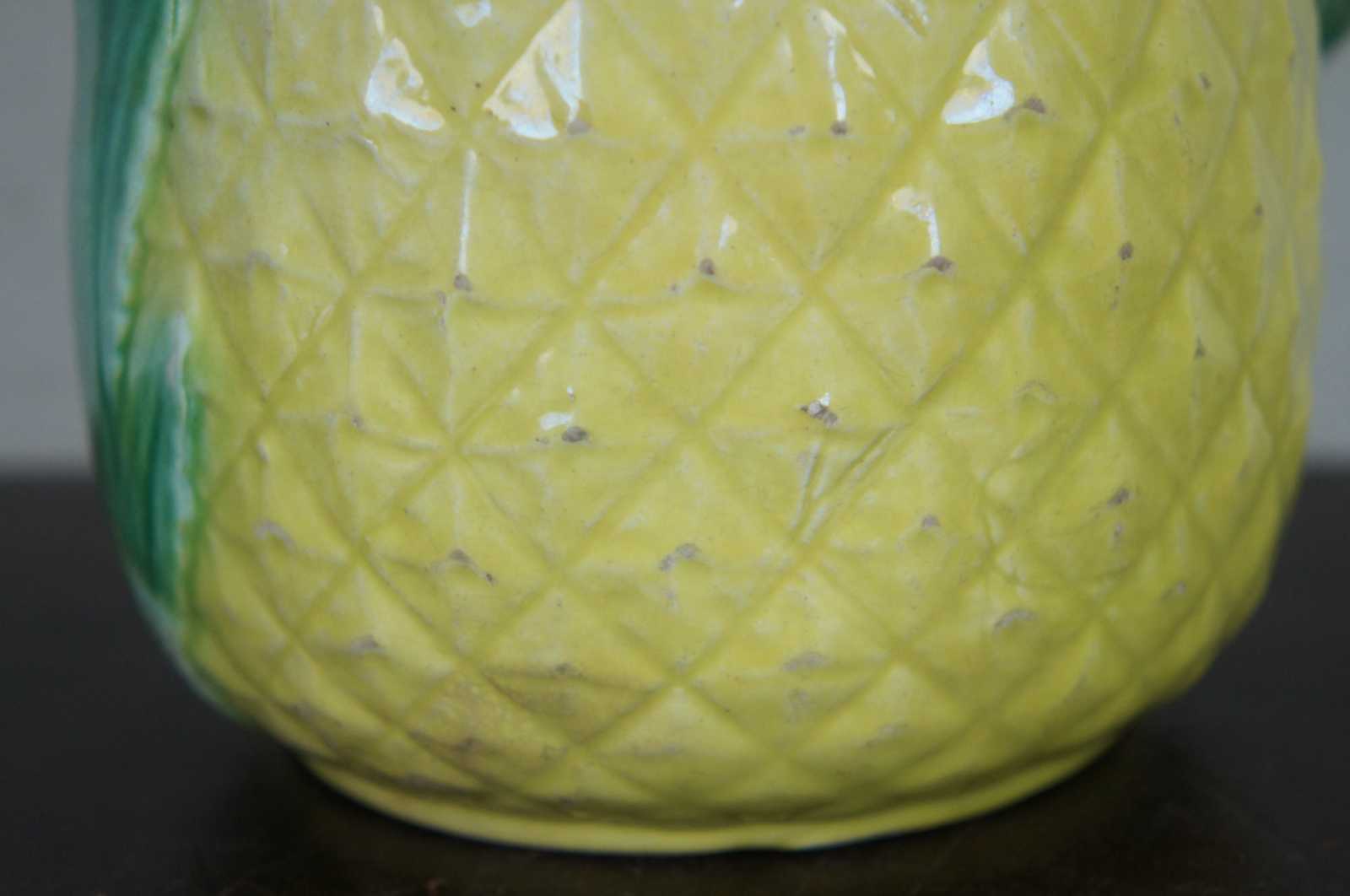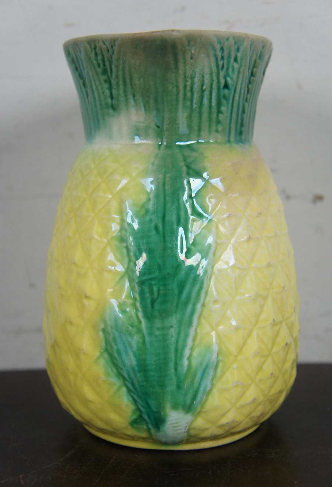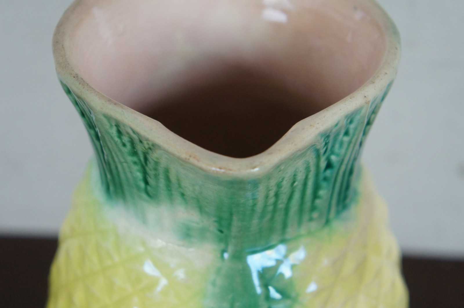Antique majolica pitcher in the shape of a pineapple with a patterned handle and leaves up the front and around the top. Glazed in green and yellow.