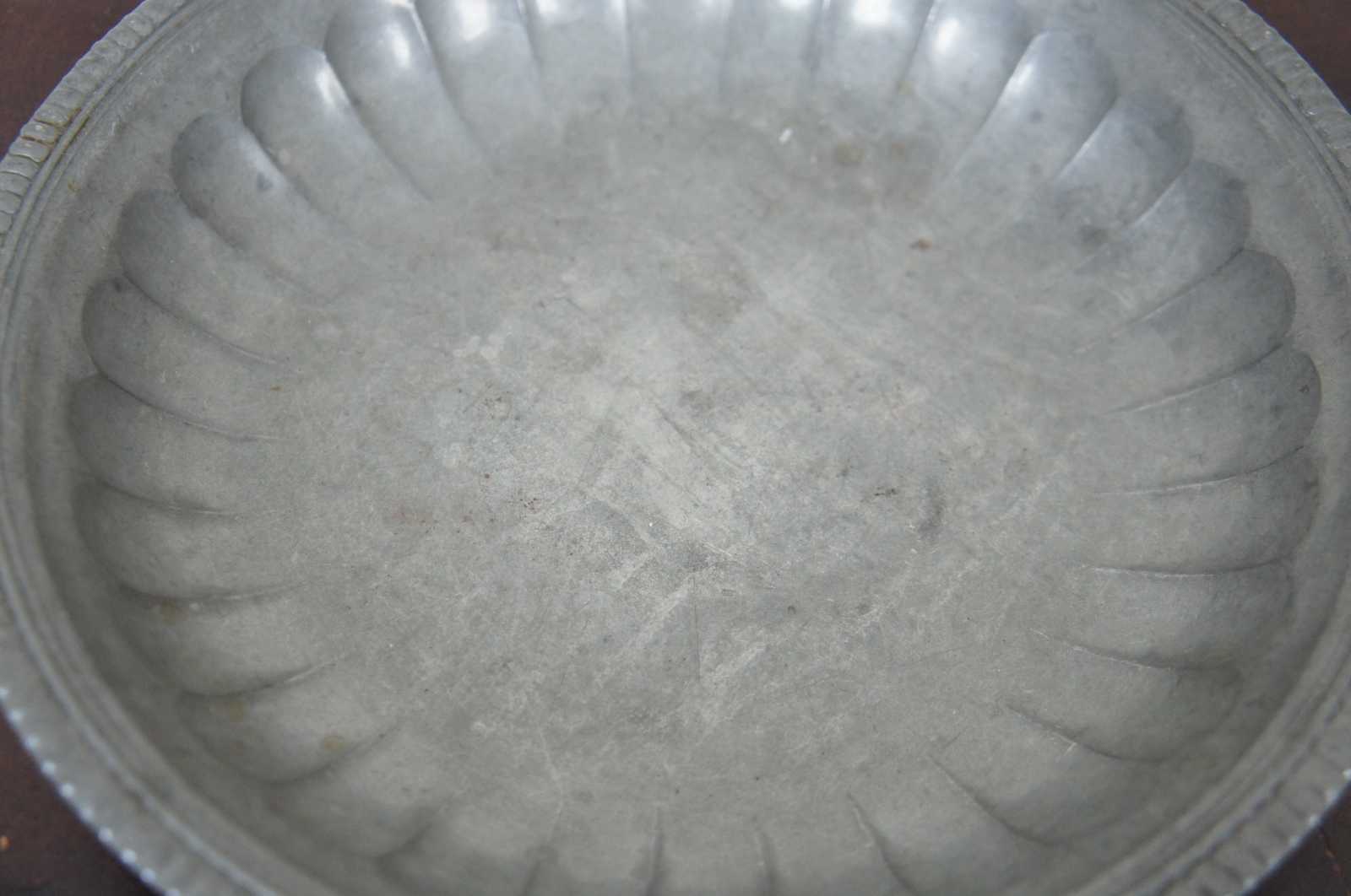 Antique round pewter serving dish with fluted sides and a rop twist pattern around the rim. Stamped on the reverse with two fleur de lis and a makers mark featuring a bunch of grapes, the numbers 1770, and the possible letters “BX Pilet” surrounded by leaves.
