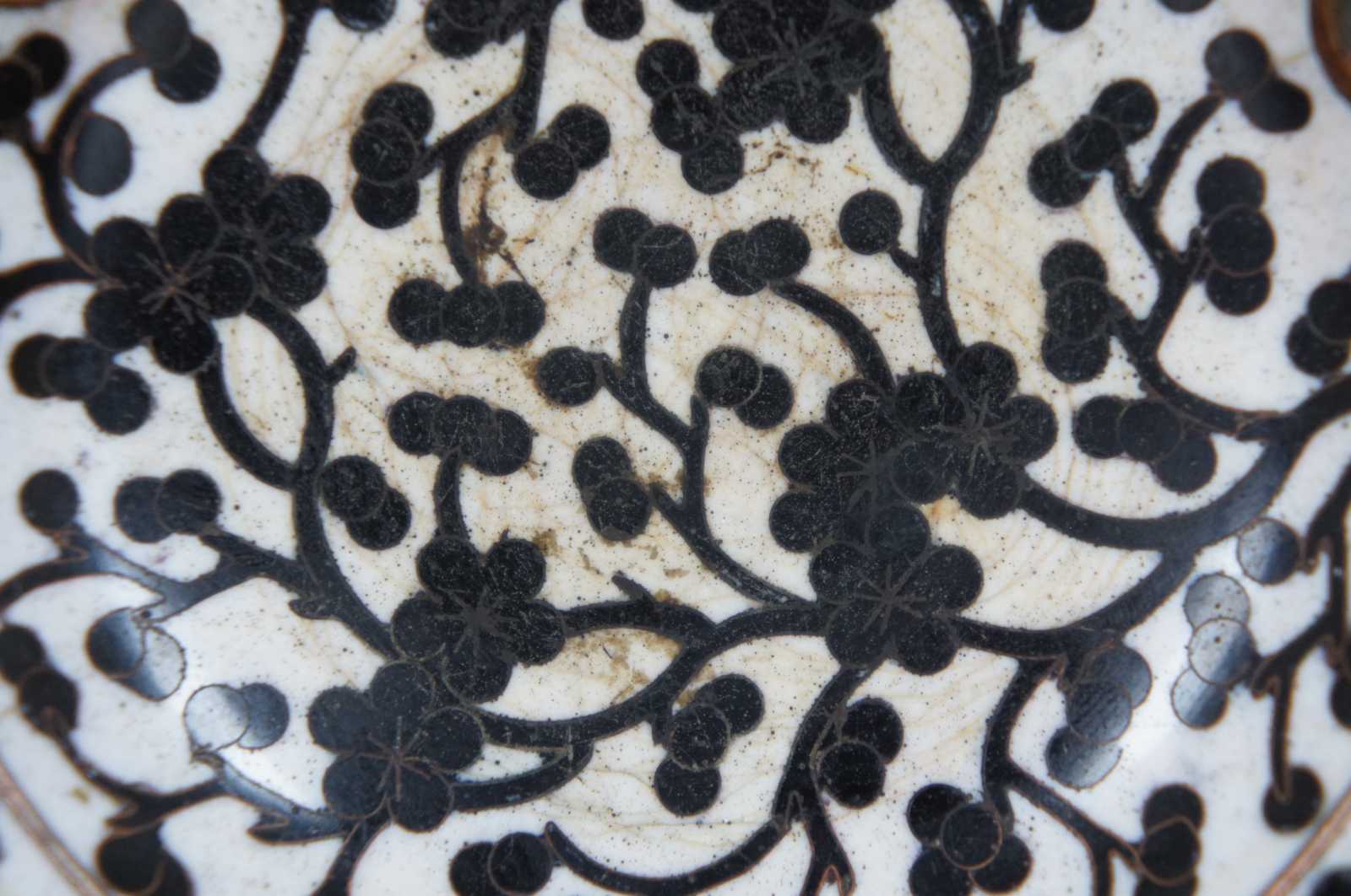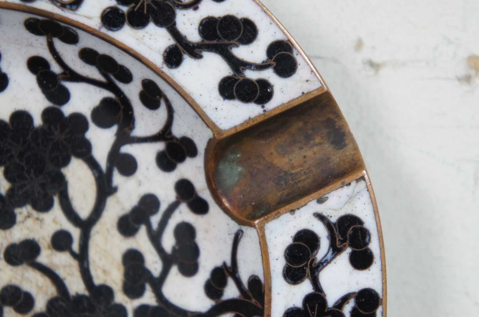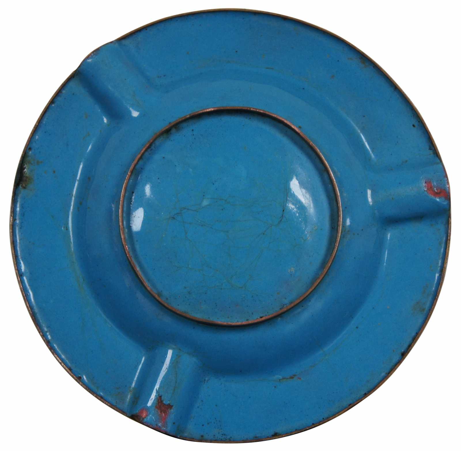 Vintage enamel on copper ashtray with three cigarette rests, decorated with black flowers on a white background and a blue underside.