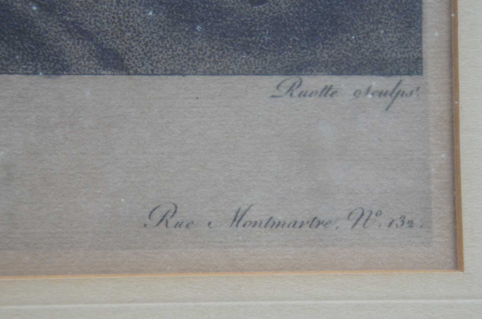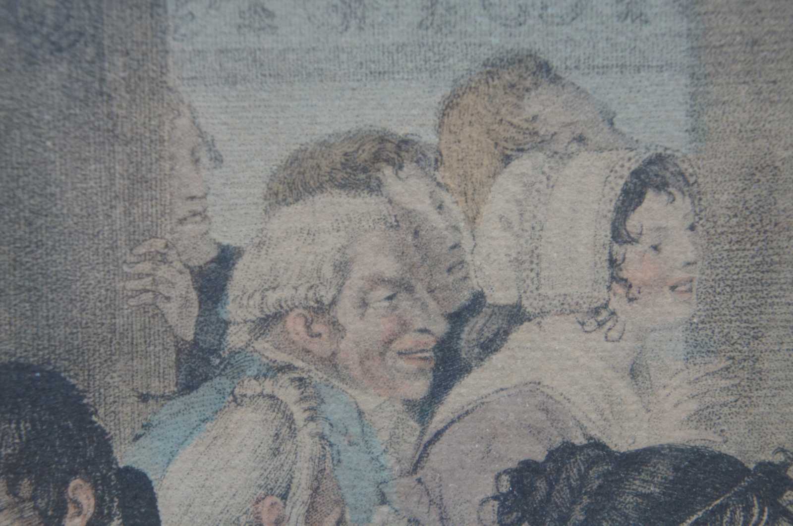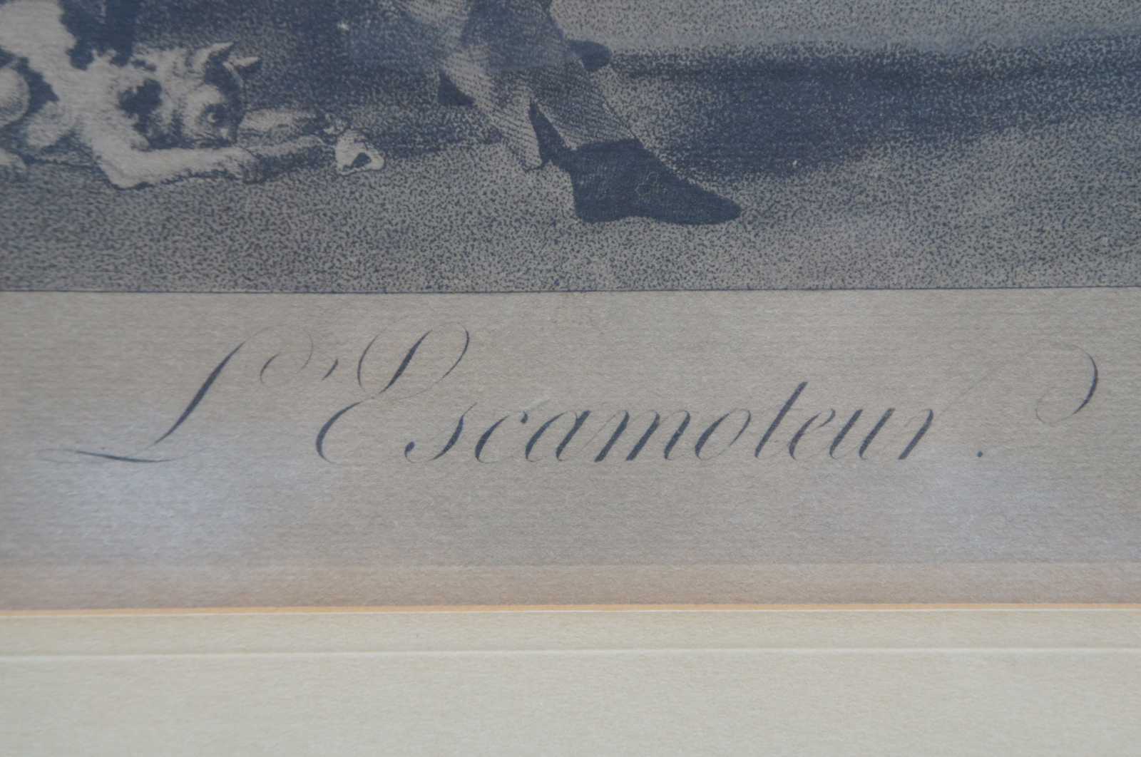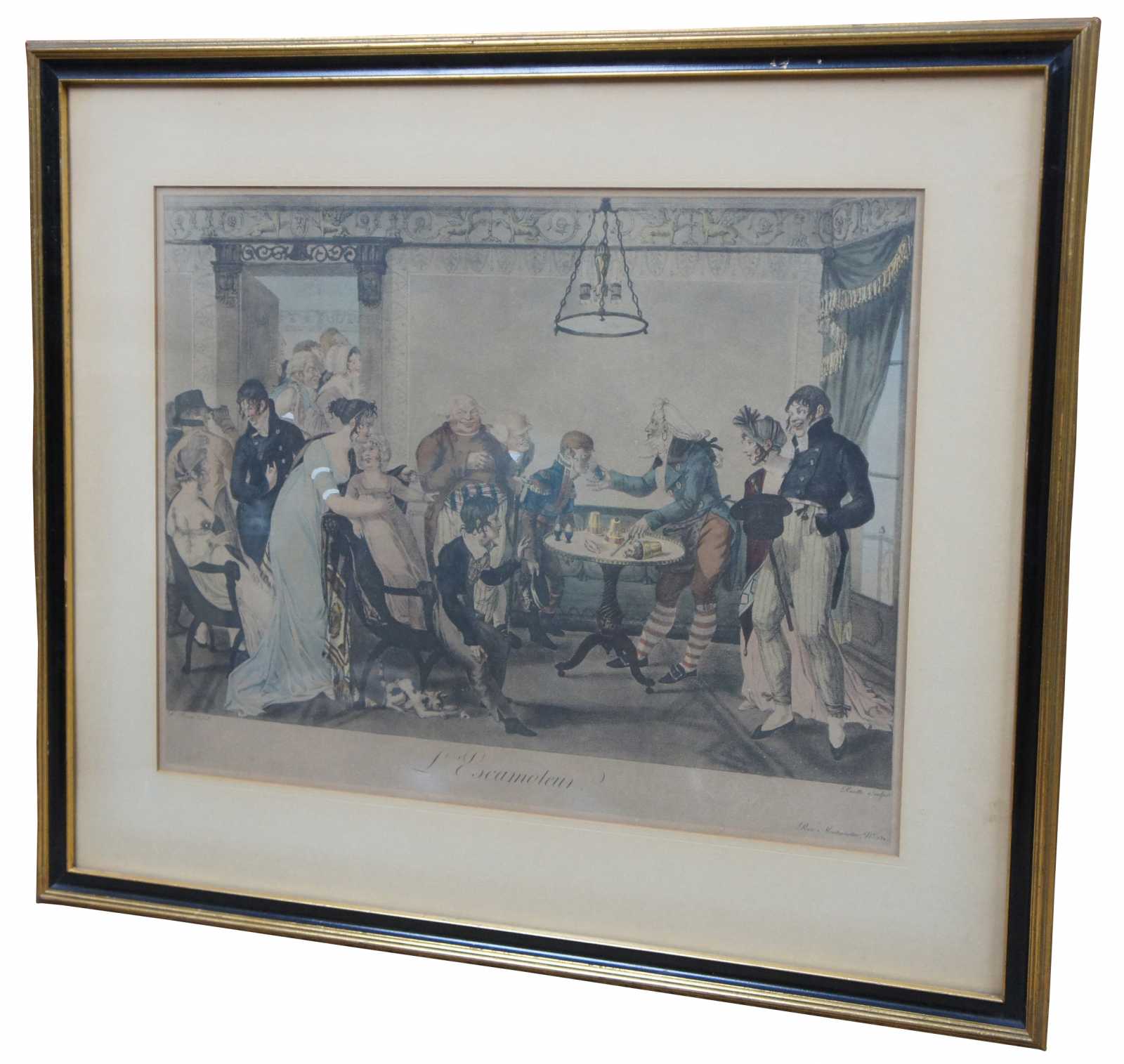 Early 19th century colored French engraving titled L’Escamoteur (The Conjurer) created in 1801 by Louis Charles Ruotte (1754-1806) after a work Jean-Francis Bosio, showing a party of people in a parlor surrounding a table where a conjurer is performing magic tricks.