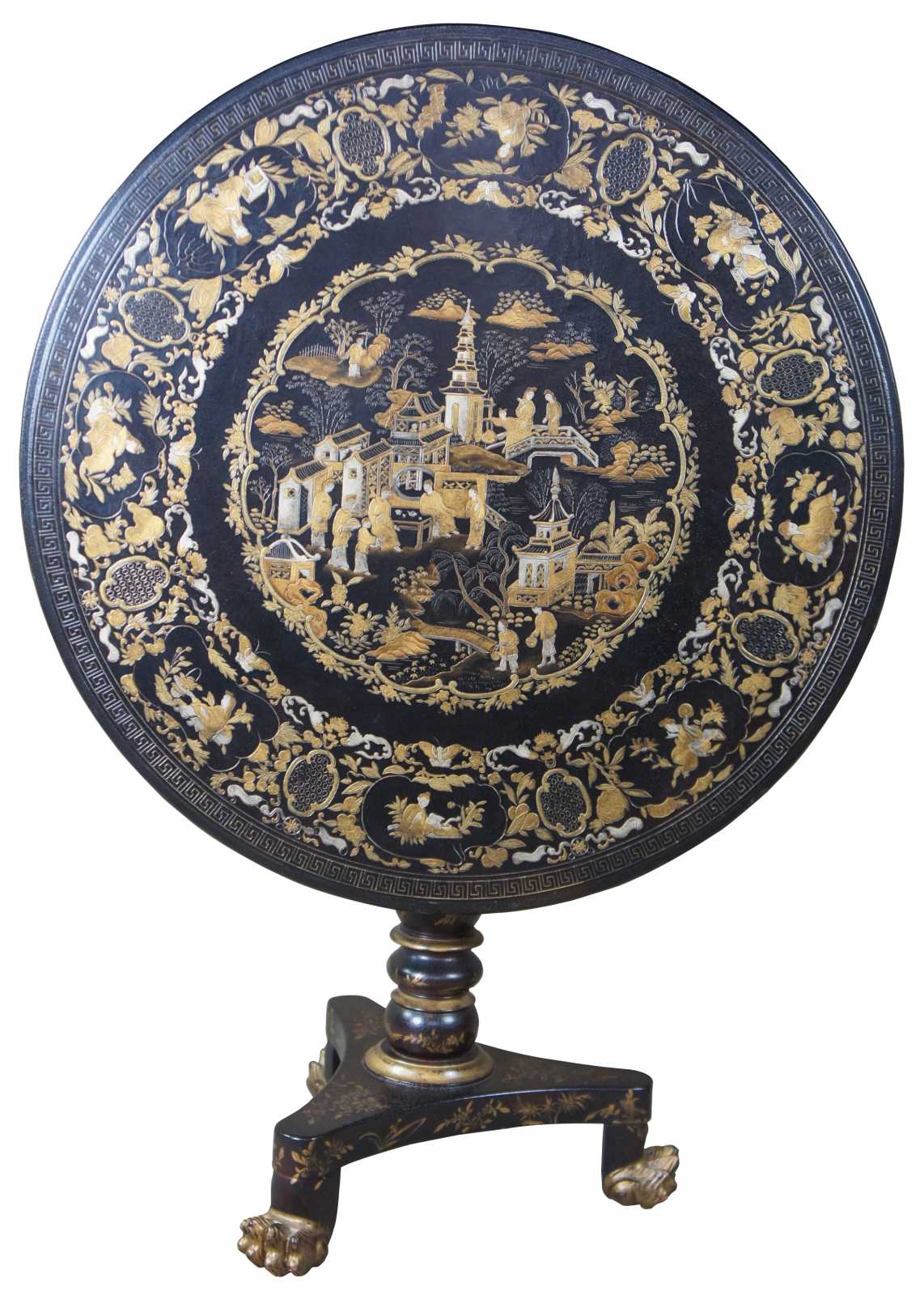 Baker Furniture Company Historic Charleston Japanned tilt-top tea table, in the Regency or Empire style. Features a circular top with embossed gilt landscape and figural decoration, a secondary band of embossed gilt foliate and figural vignette decoration with a fret border, over a turned baluster that terminates into a triangular base with gilt decoration and gilt paw feet. Label en verso of top reads "Baker Historic Charleston Reproductions".