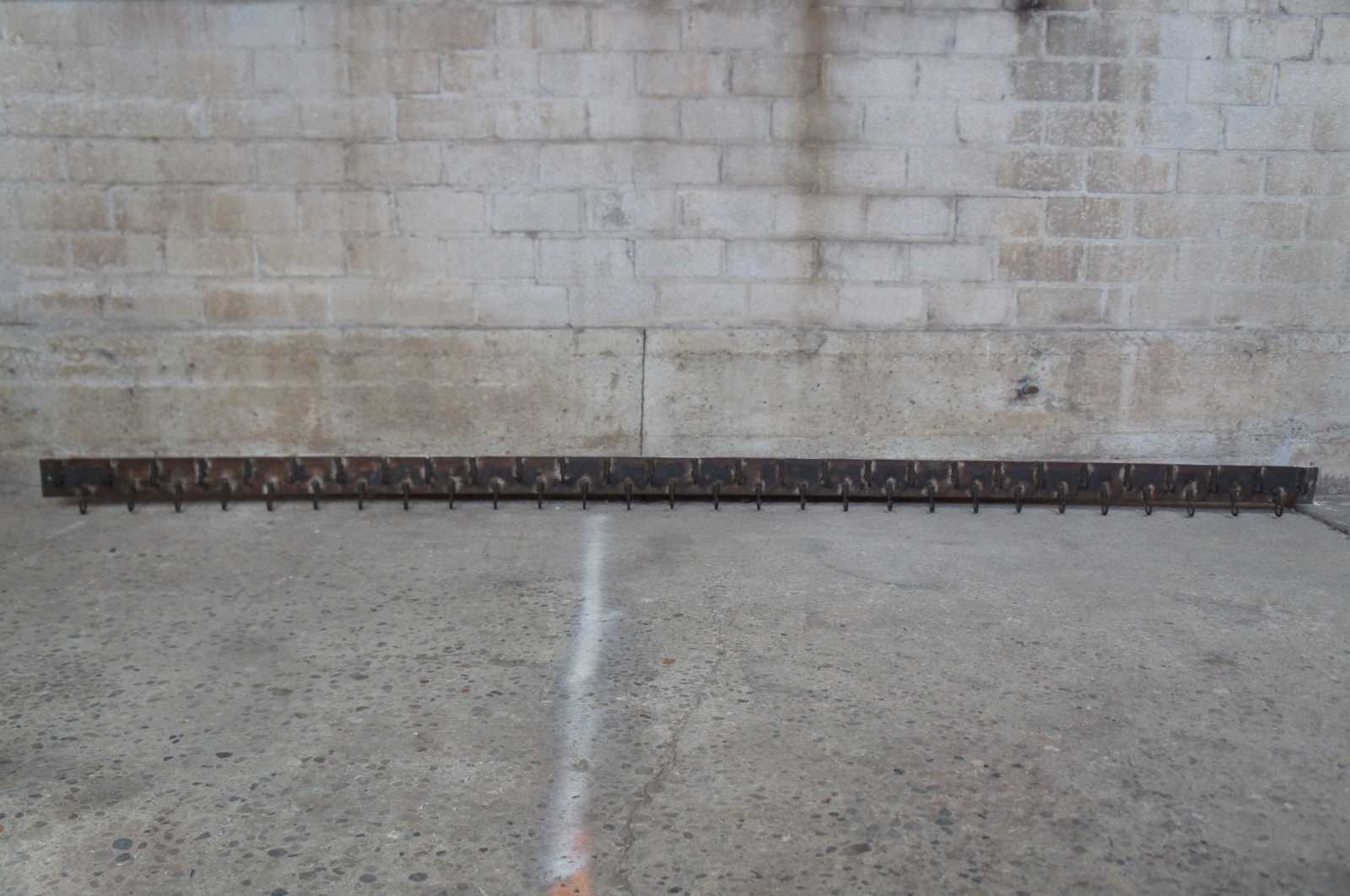 Primitive country farmhouse / industrial hand forged iron butcher rack with 57 hooks. Can be used for pots and pans or as a hall tree for coats / hats ect. 9.5 feet or 115".