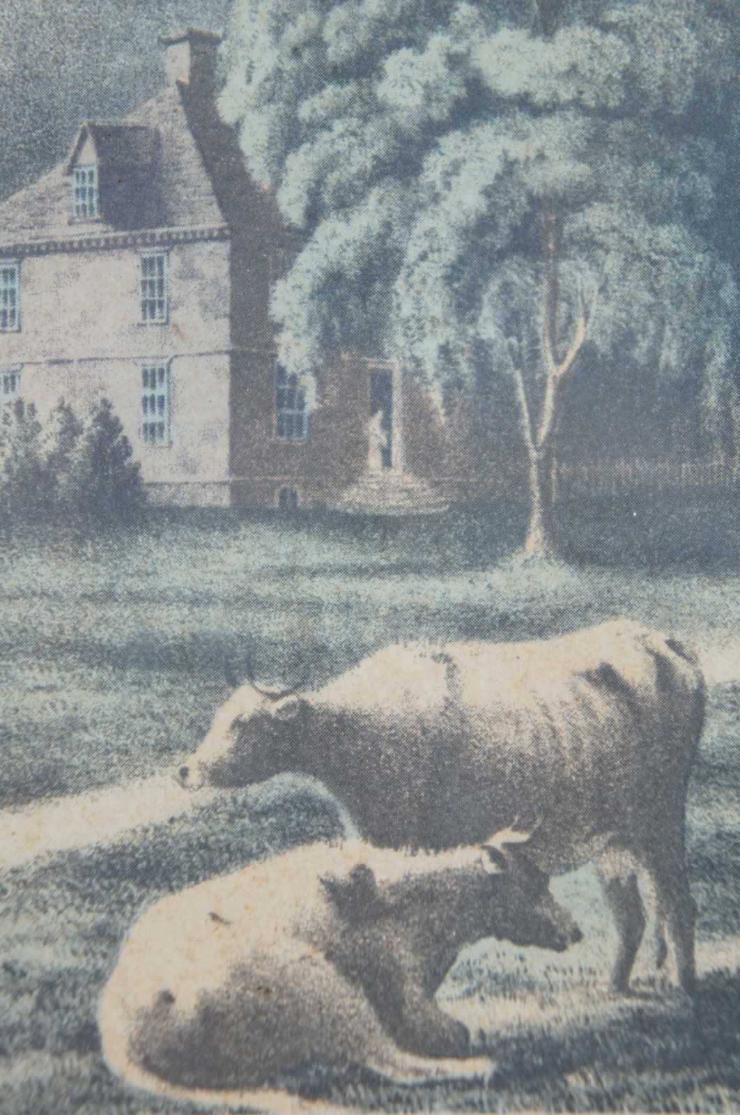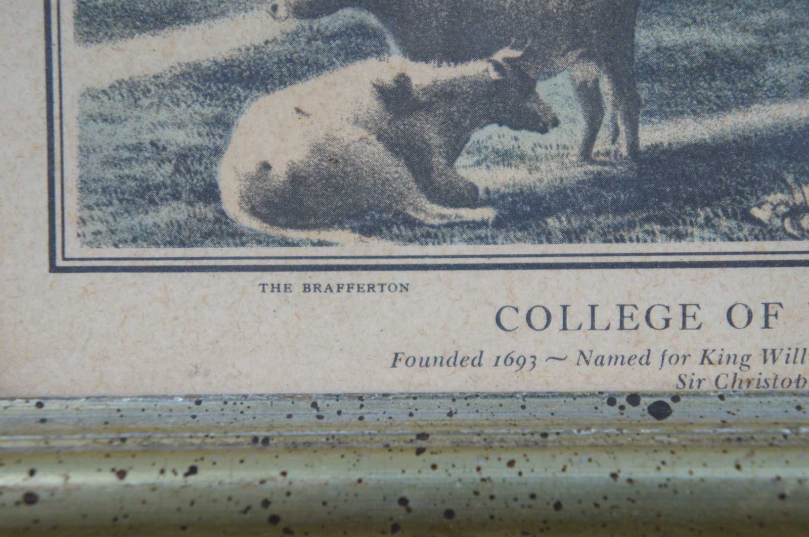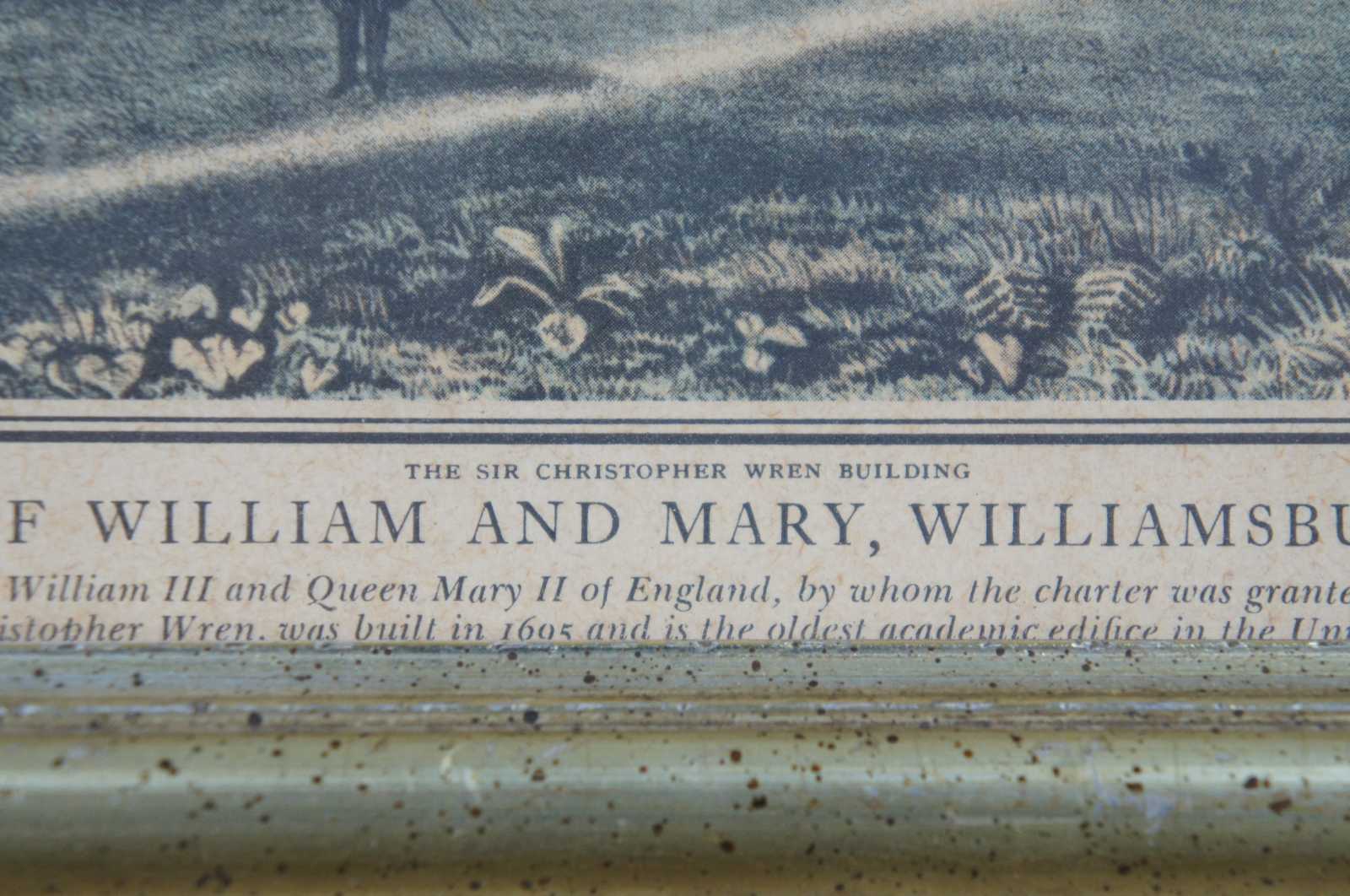 Antique colored engraving showing the green of the College of William and Mary, Williamsburg, VA 1839. Noted buildings include The Brafferton with two cows in the foreground, The Sir Christopher Wren Building with two standing figures in the foreground, and The President’s House with three figures seated/standing together.