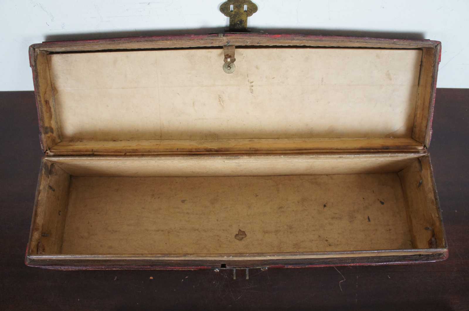 Antique red leather and lacquer Chinese scroll box with gold designs, domed lid, interior tray and brass handles / hardware.