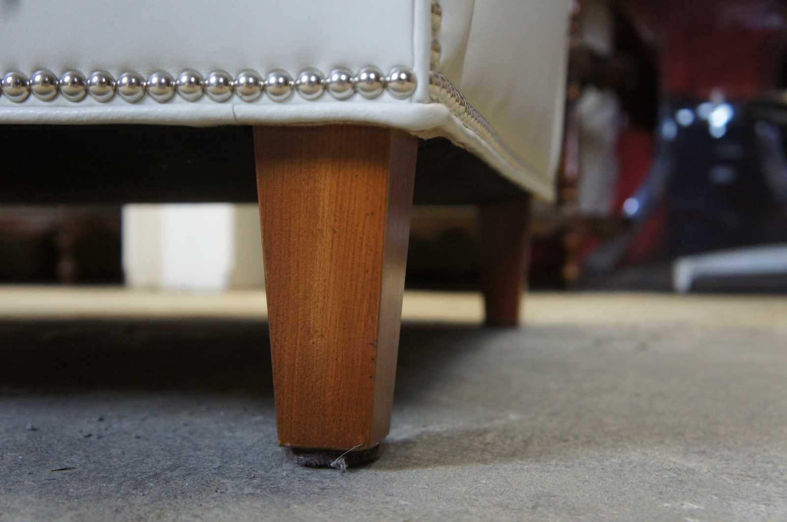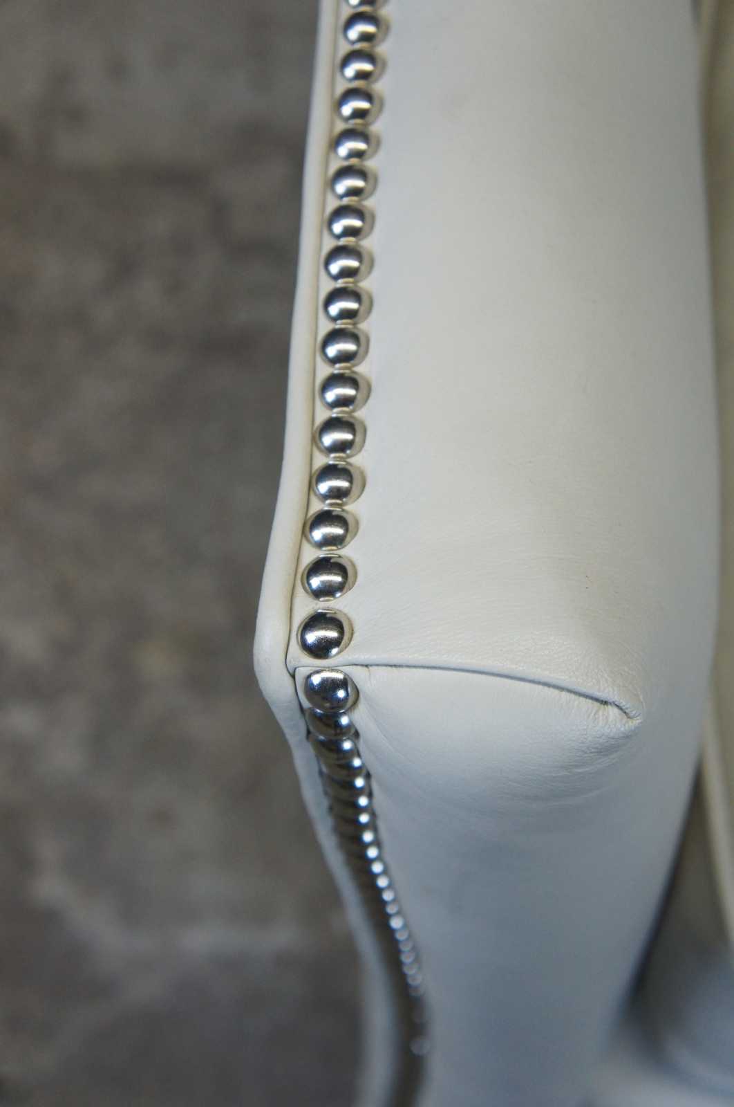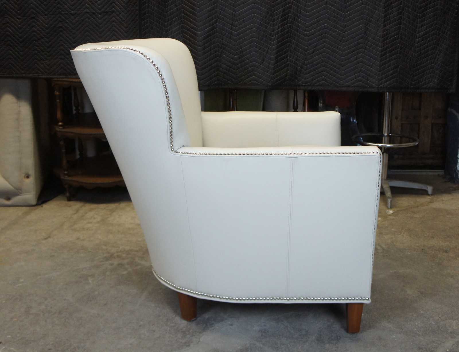 Two Harden Furniture wingback chairs. Made in McConnellsville NY in 2011. Upholstered in leather with silver nailhead trim. Chair is supported by square tapered legs. Perfect addition to any living room or library setting.