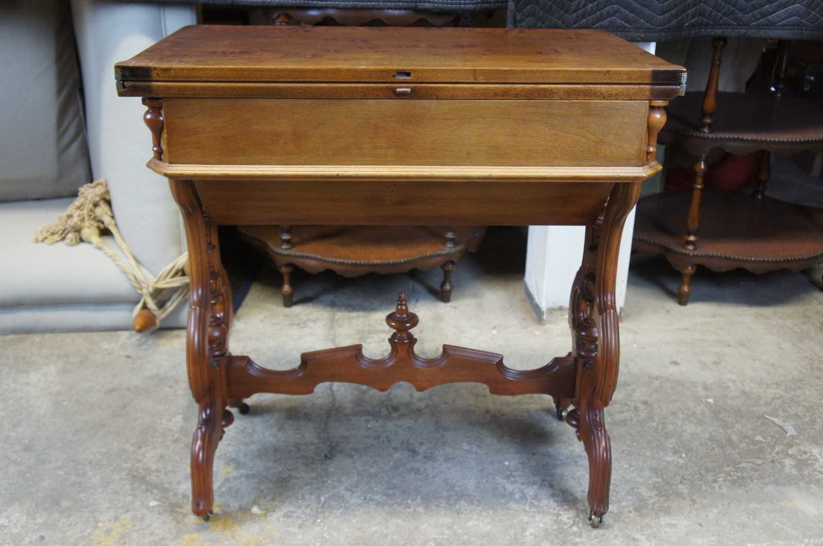 Circa 1880s walnut parlor table. A unique dual functioning piece that can be used as a swivel top game table or sewing cabinet. Features a compartment for storage beneath the table top as well as a large dovetailed troth drawer. Intricately designed with spindeled accents and eastlake inspired serpentine supports.