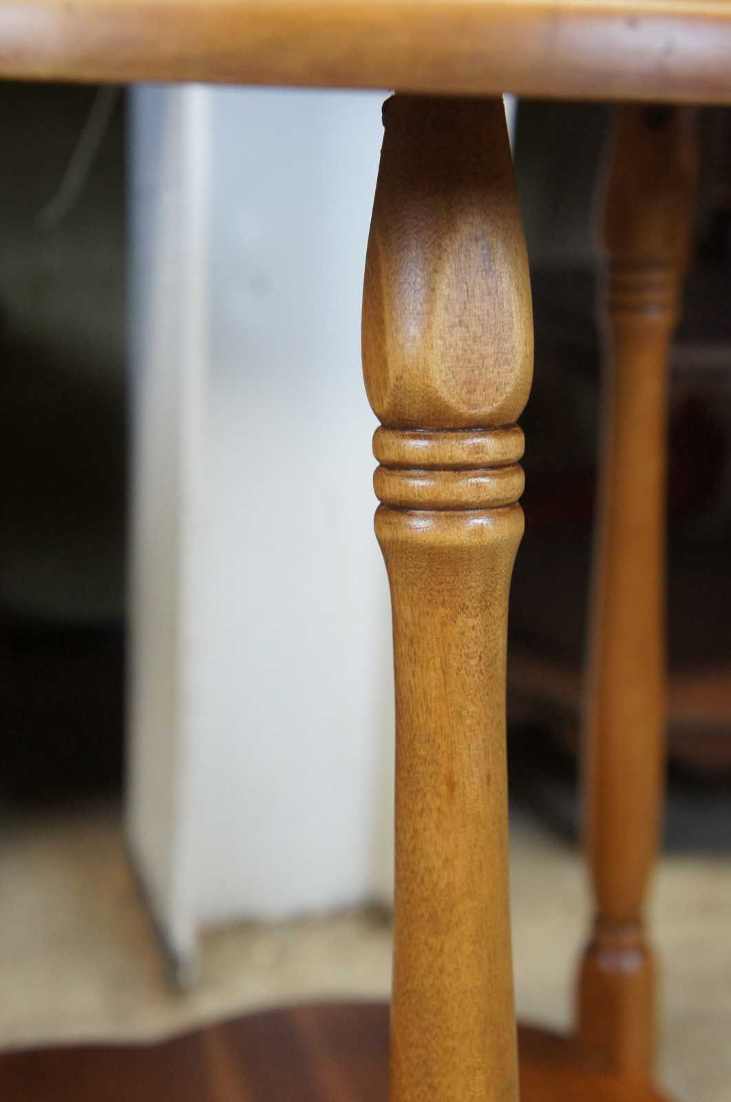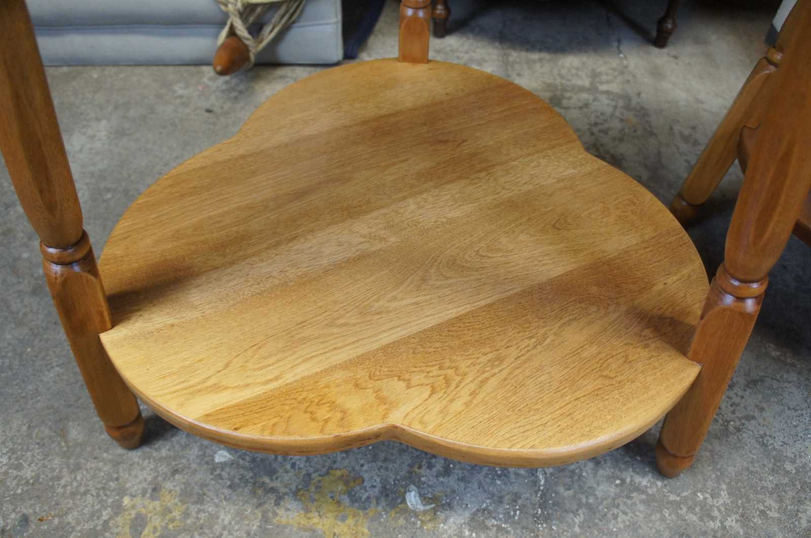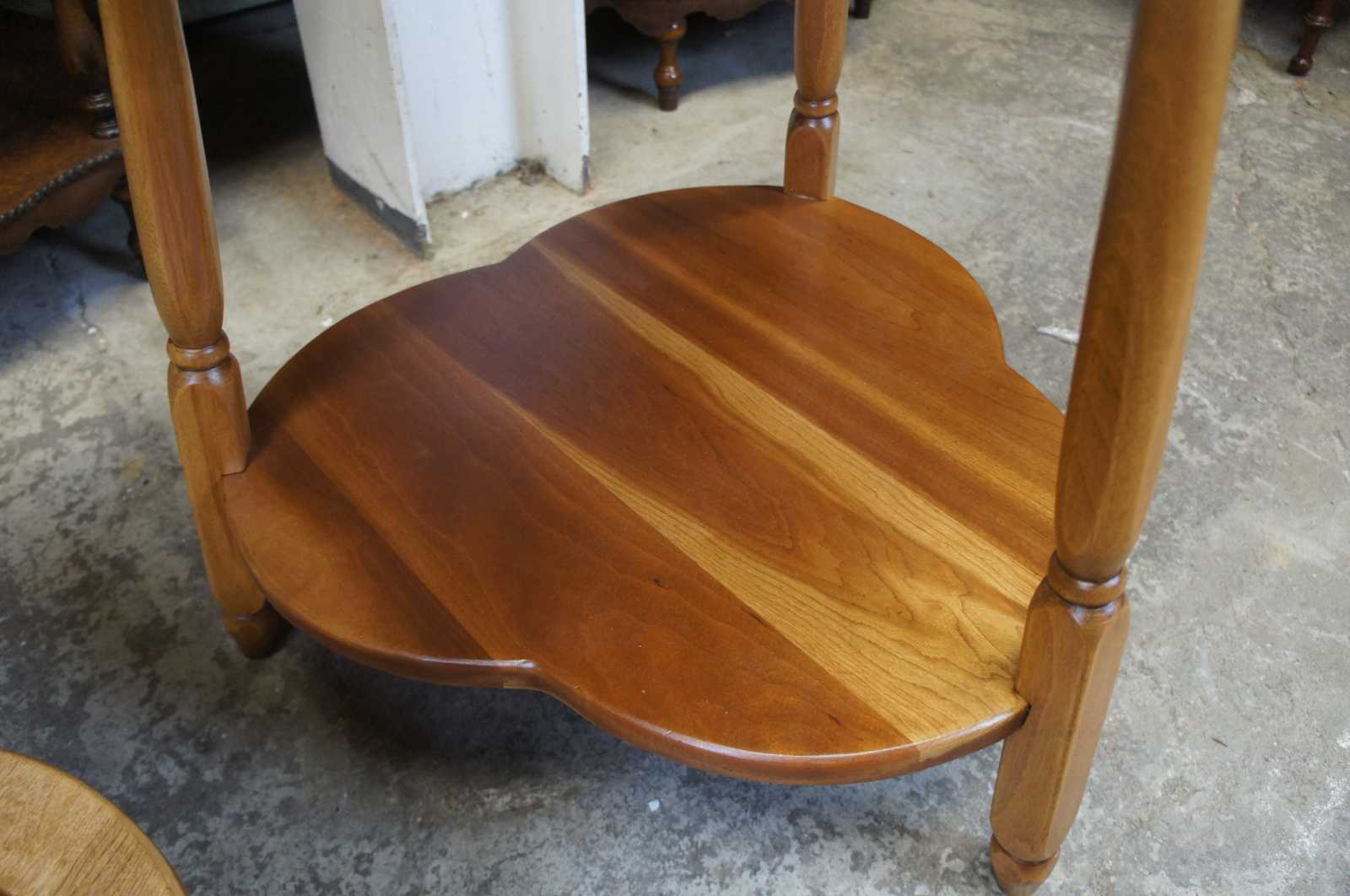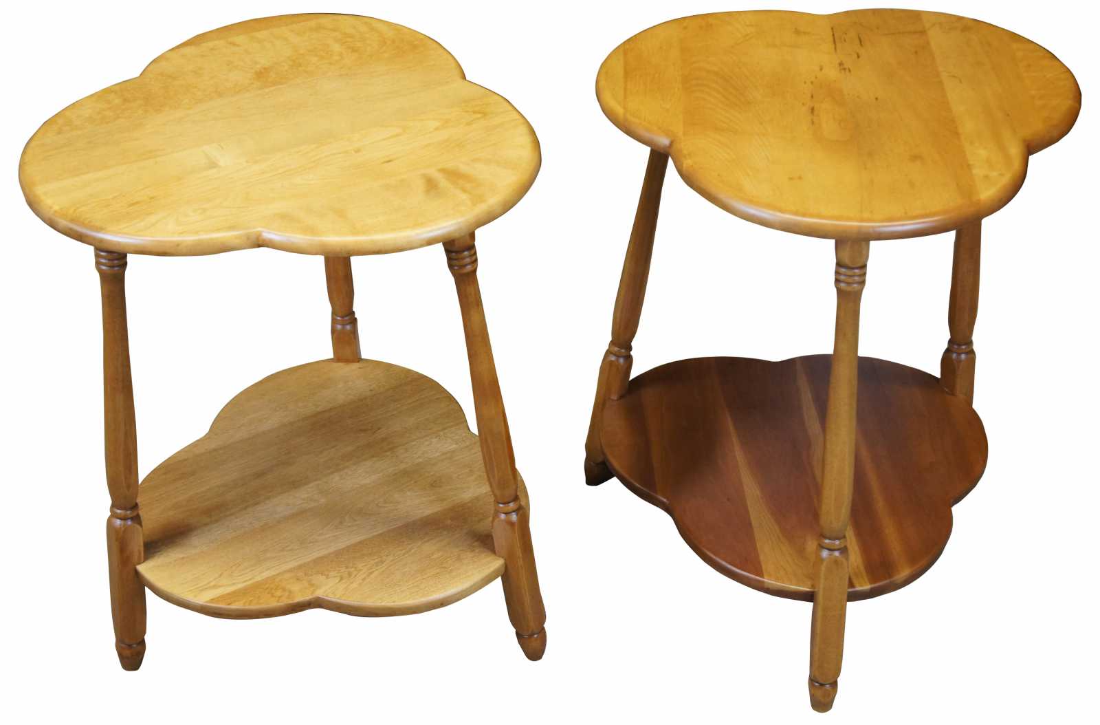 Two handmade trefoil tables. Features a trefoil top and lower shelf, supported by turned spindle legs. Made from Birch.