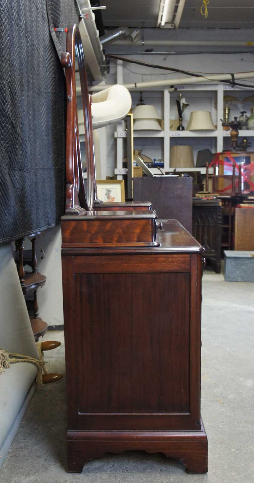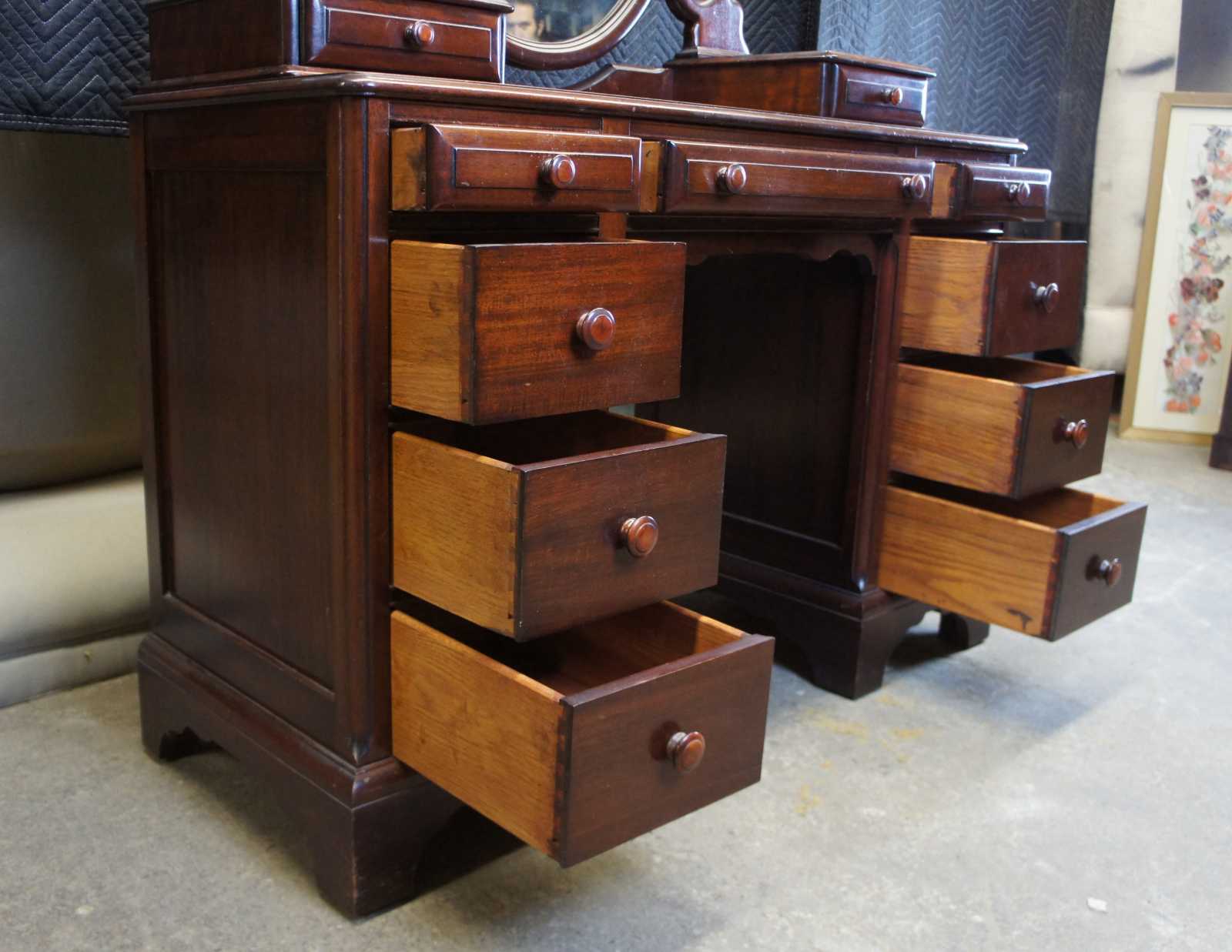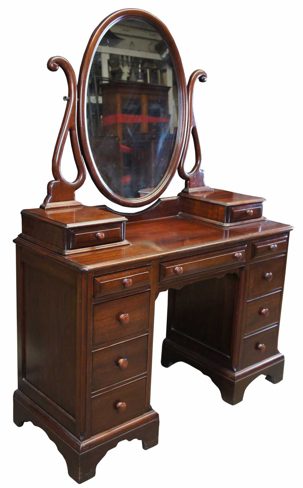Circa 1940s dressing table. Made form mahogany in Early American styling with nine drawers in addition to upper glove box drawers. Includes mirror with swivel or adjustable mirror.