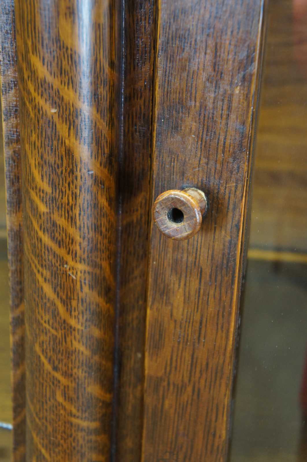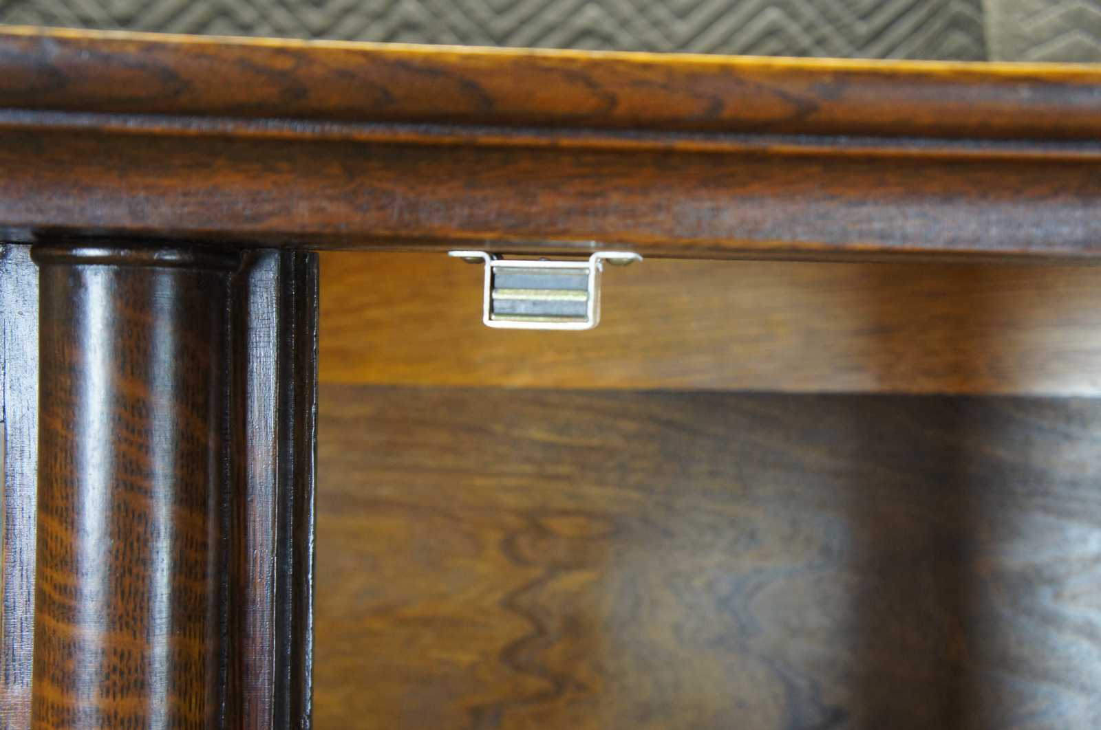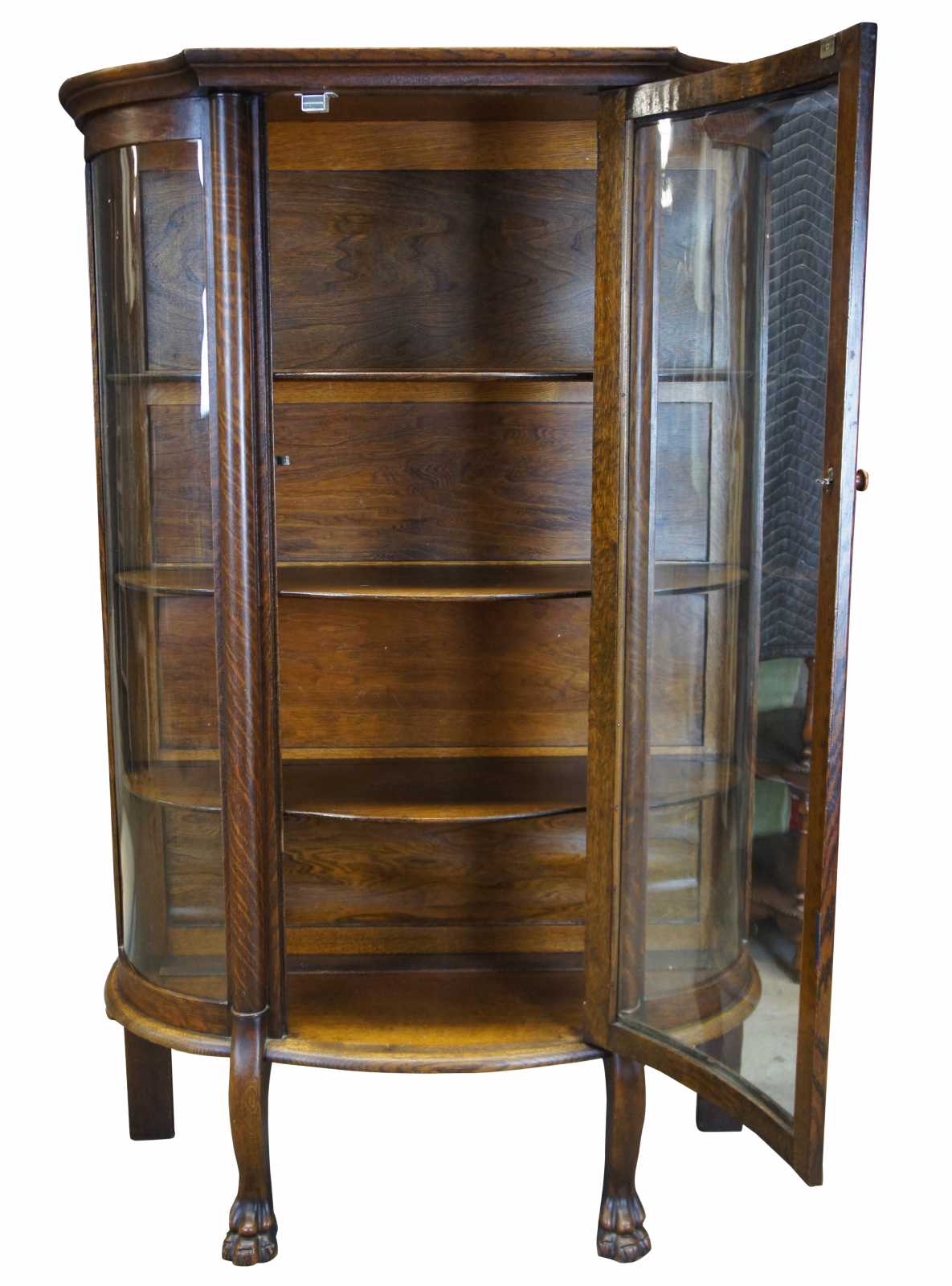 American Empire curved glass curio cabinet. Made from quartersawn oak with circular columns along the front leading to lion paw feet. Includes four shelves and plate groves.