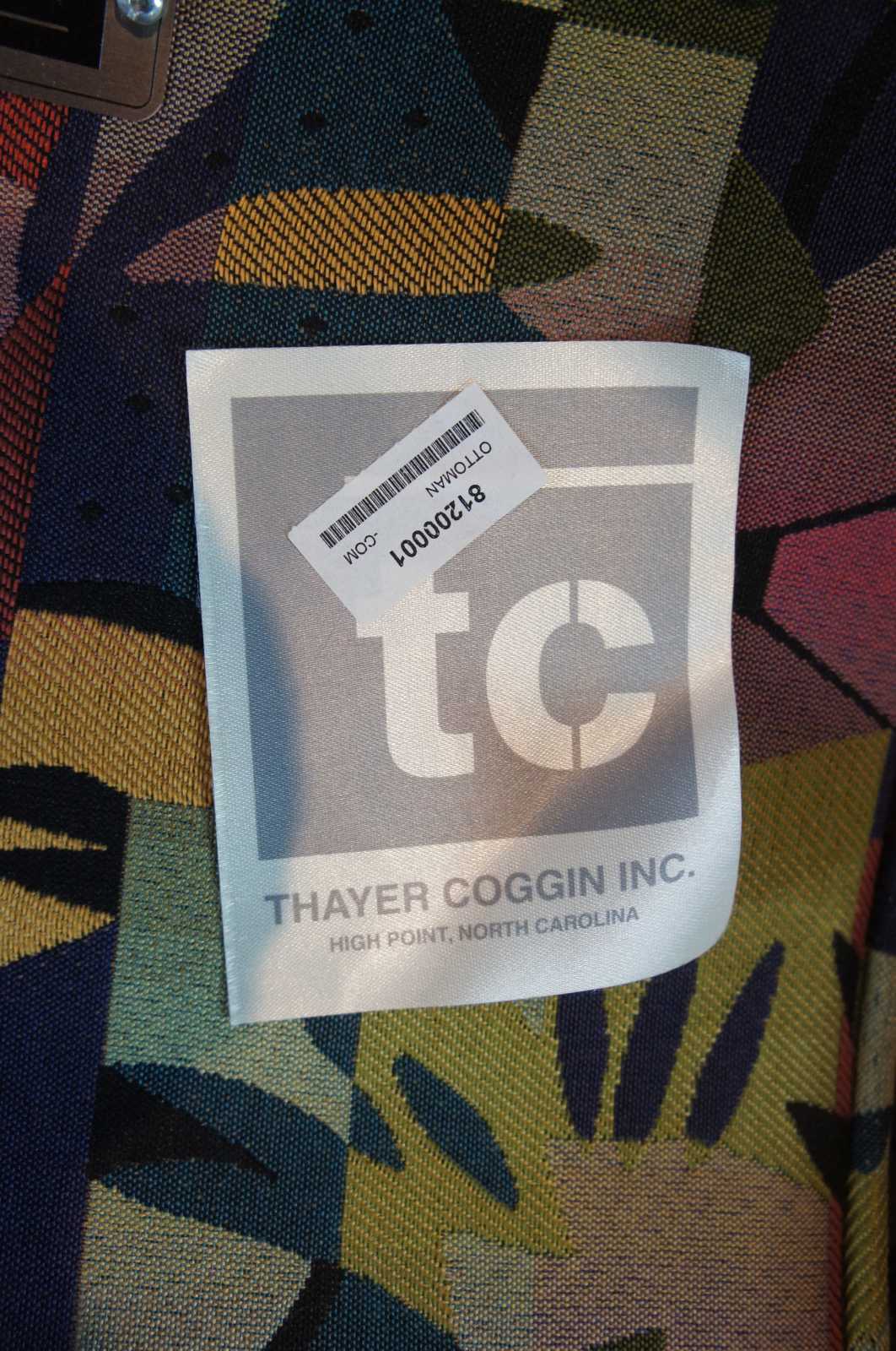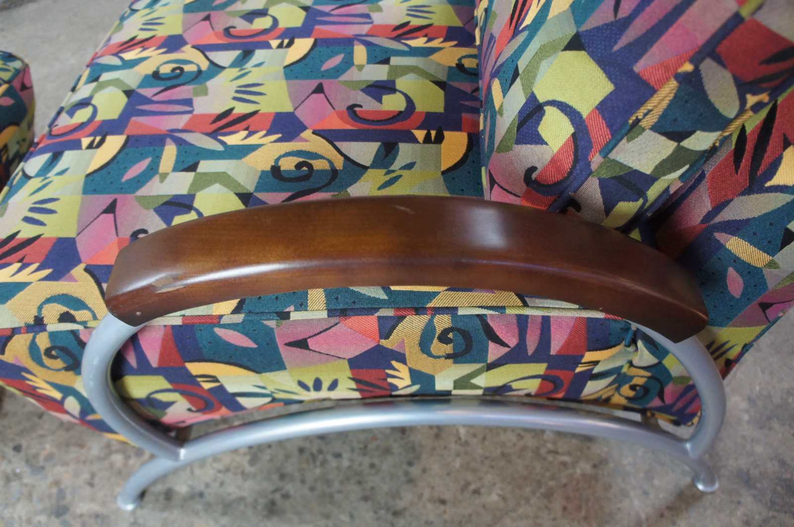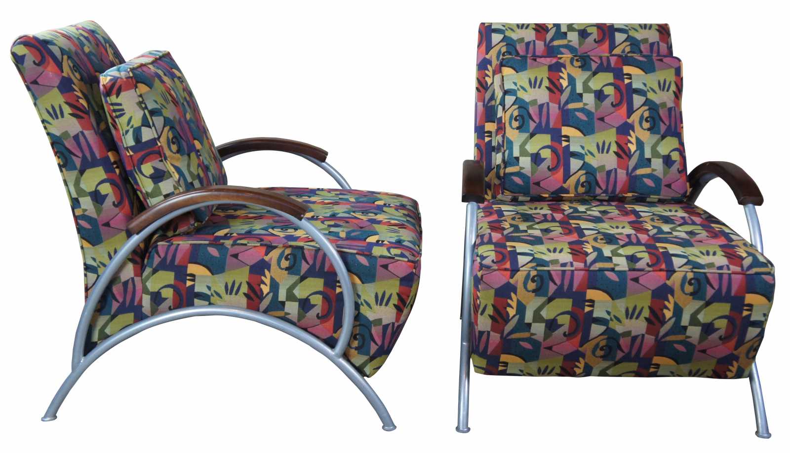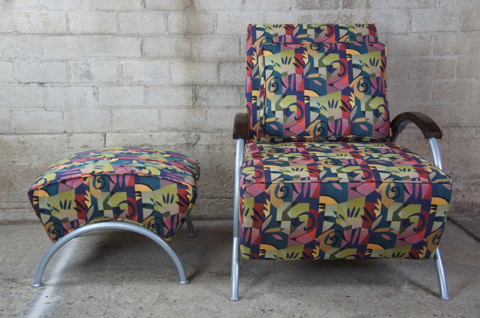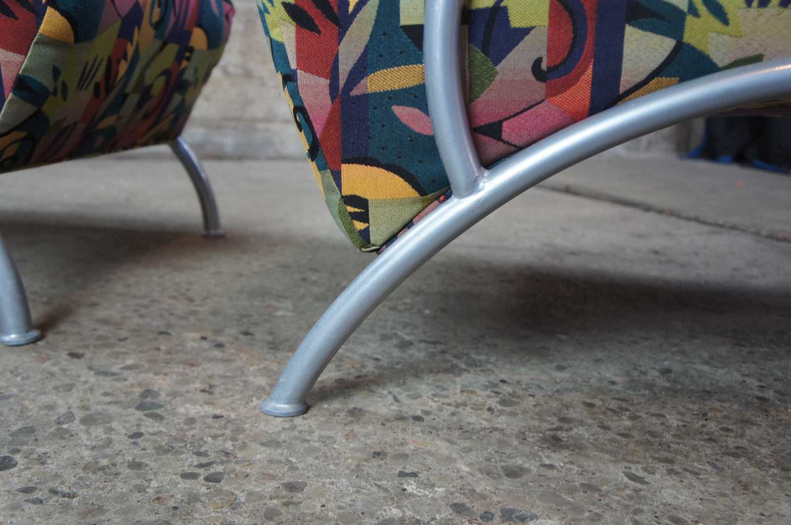 Pair of 2002 Milo Baughman for Thayer Coggin retro club or lounge chairs with ottomans. Features a sculptural frame with wooden arm rests and multi colored exotic fabric. Includes matching lumbar pillows and throw pillows. Labeled limited edition number 26 and 27 of 500 produced. Finished with brushed stainless steel frames and woo arm accents.