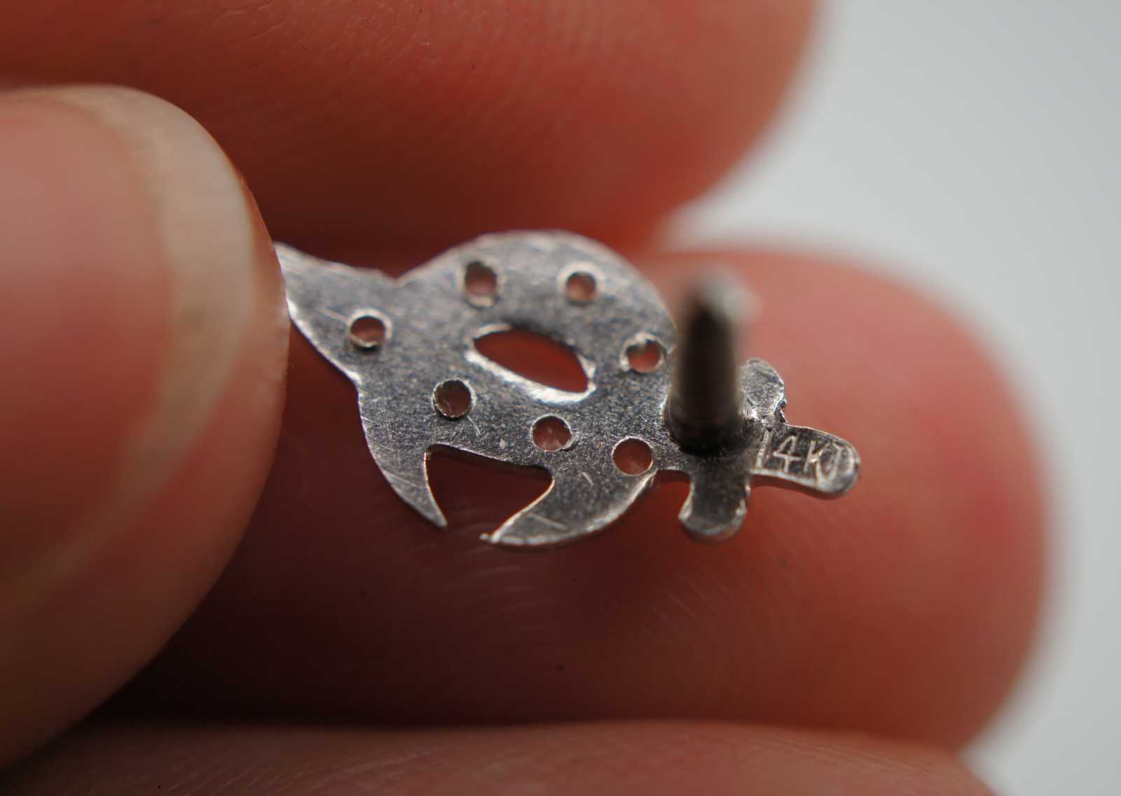 Vintage 14K white gold Shriner/Freemason/Masonic scimitar and crescent moon screw back lapel pin with seven diamonds along the blade and moon.
