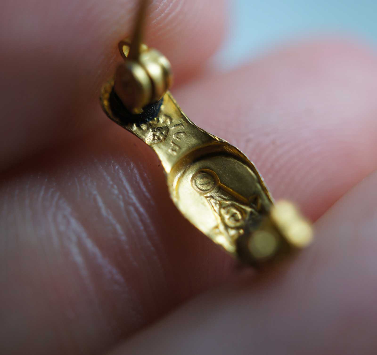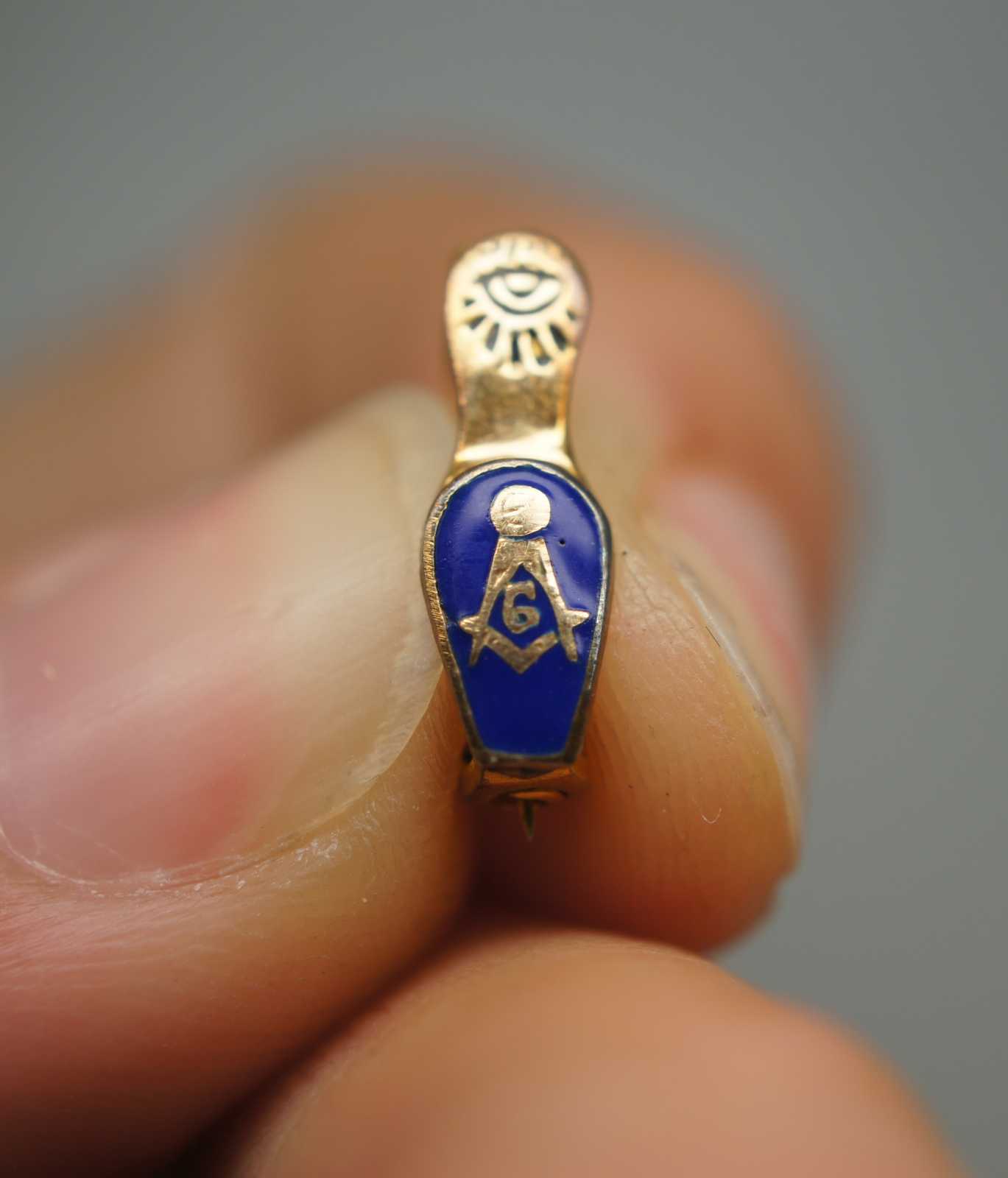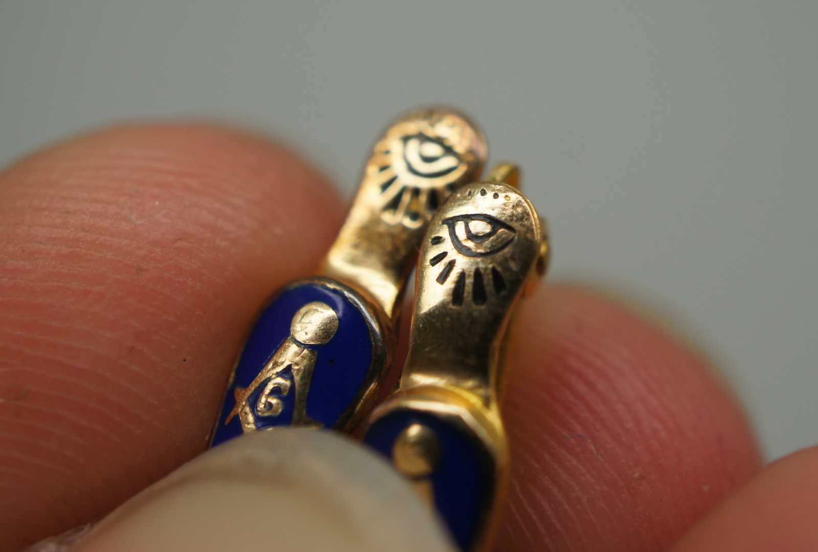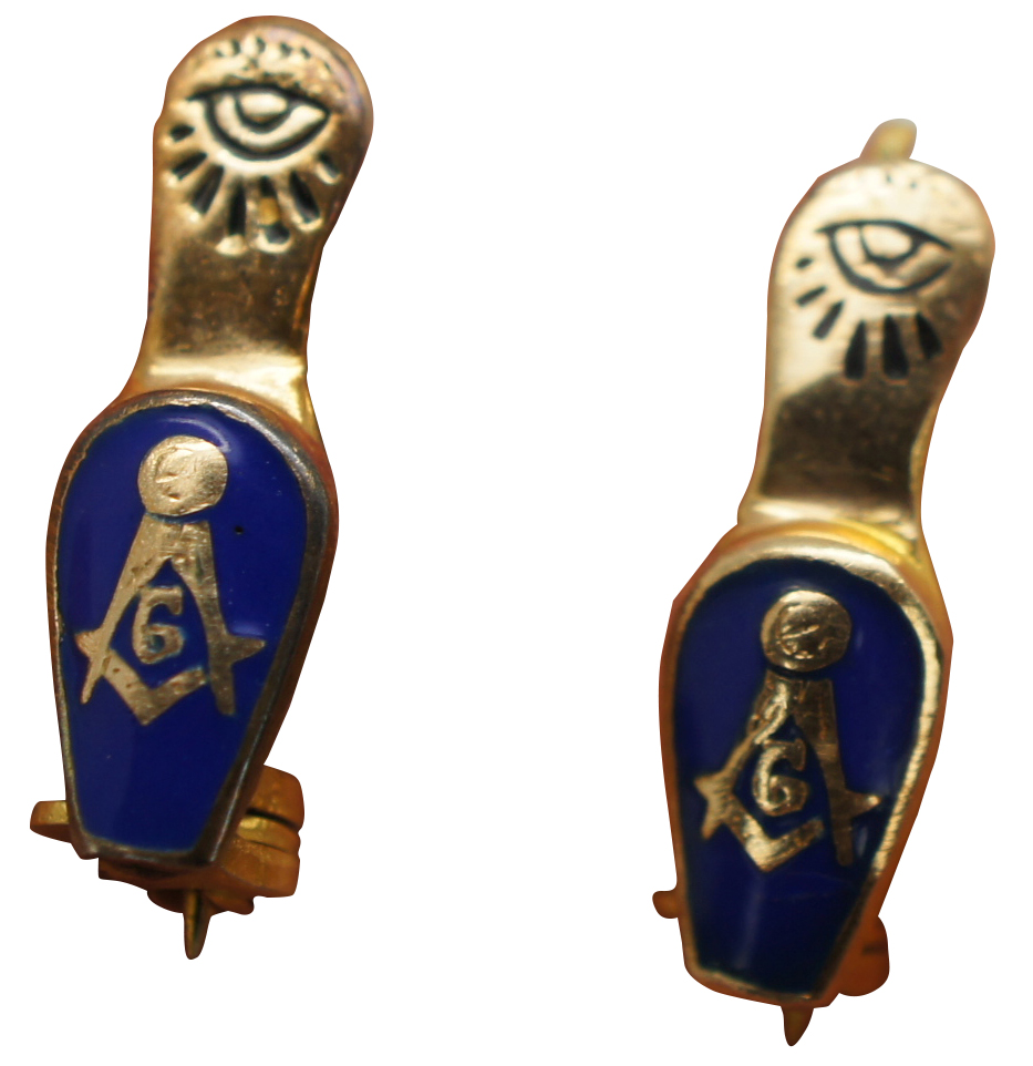 Pair of vintage 10k yellow gold straight back Scottish Rite/Freemason/Masonic lapel pins featuring blue enamel around the traditional compass and ruler with the letter G and engraved All Seeing Eye.