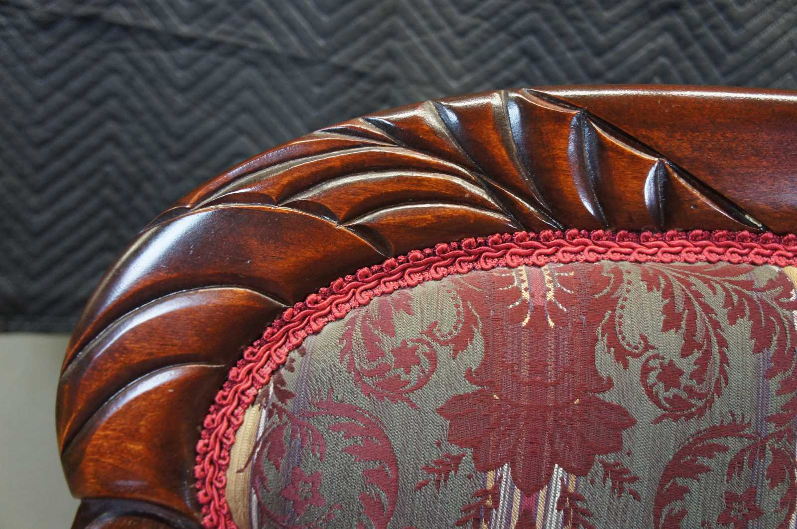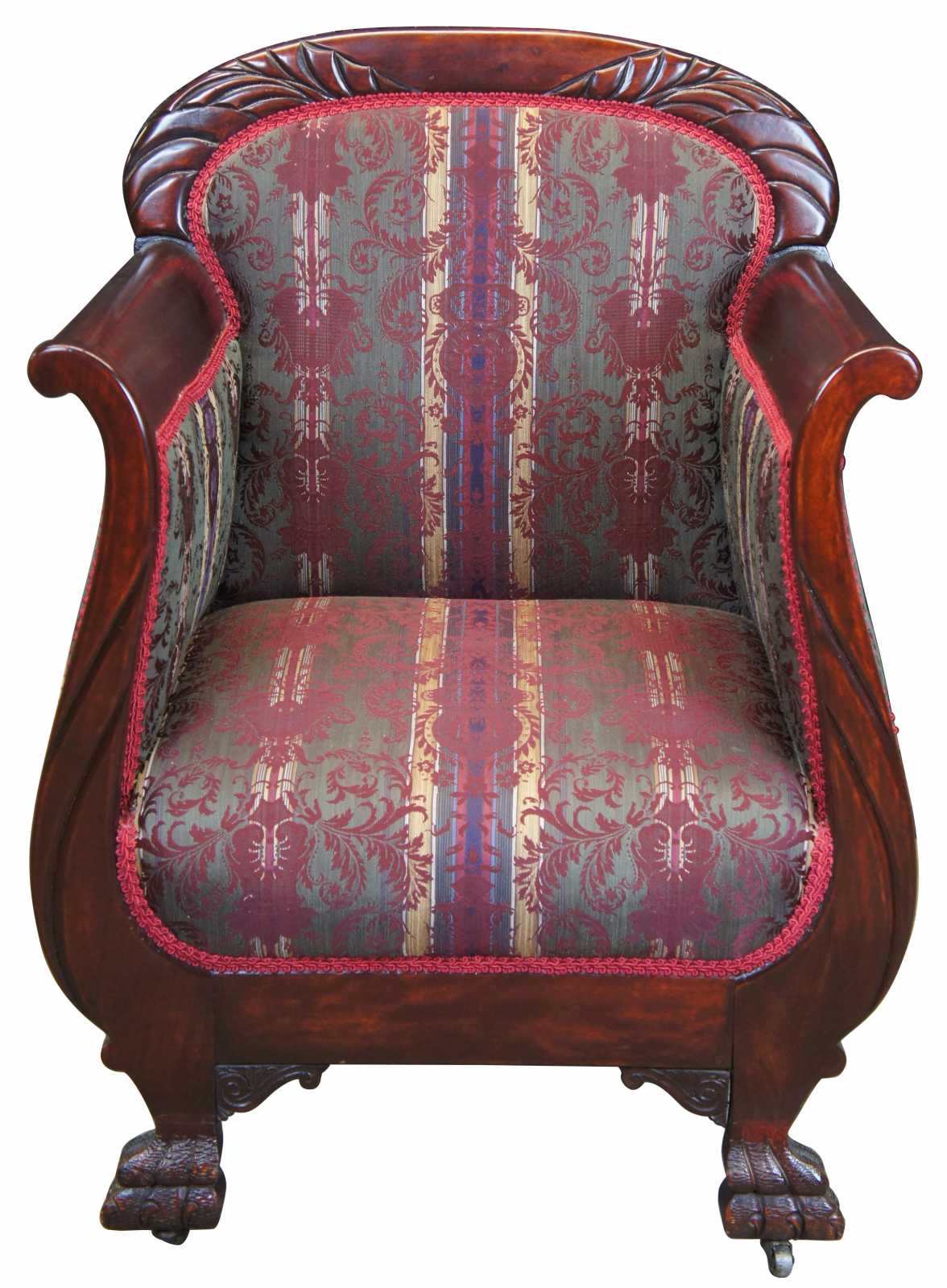 Featured is a two piece parlor set. Made from Mahogany with American Empire styling. Includes a harpe shape with high flared arms, carved back, and paw feet. Upholstered in a traditional French fabric with reds, blues, greens and gold accents. Includes two bolster pillows and one round side pillow. Metal plate label along the back base.