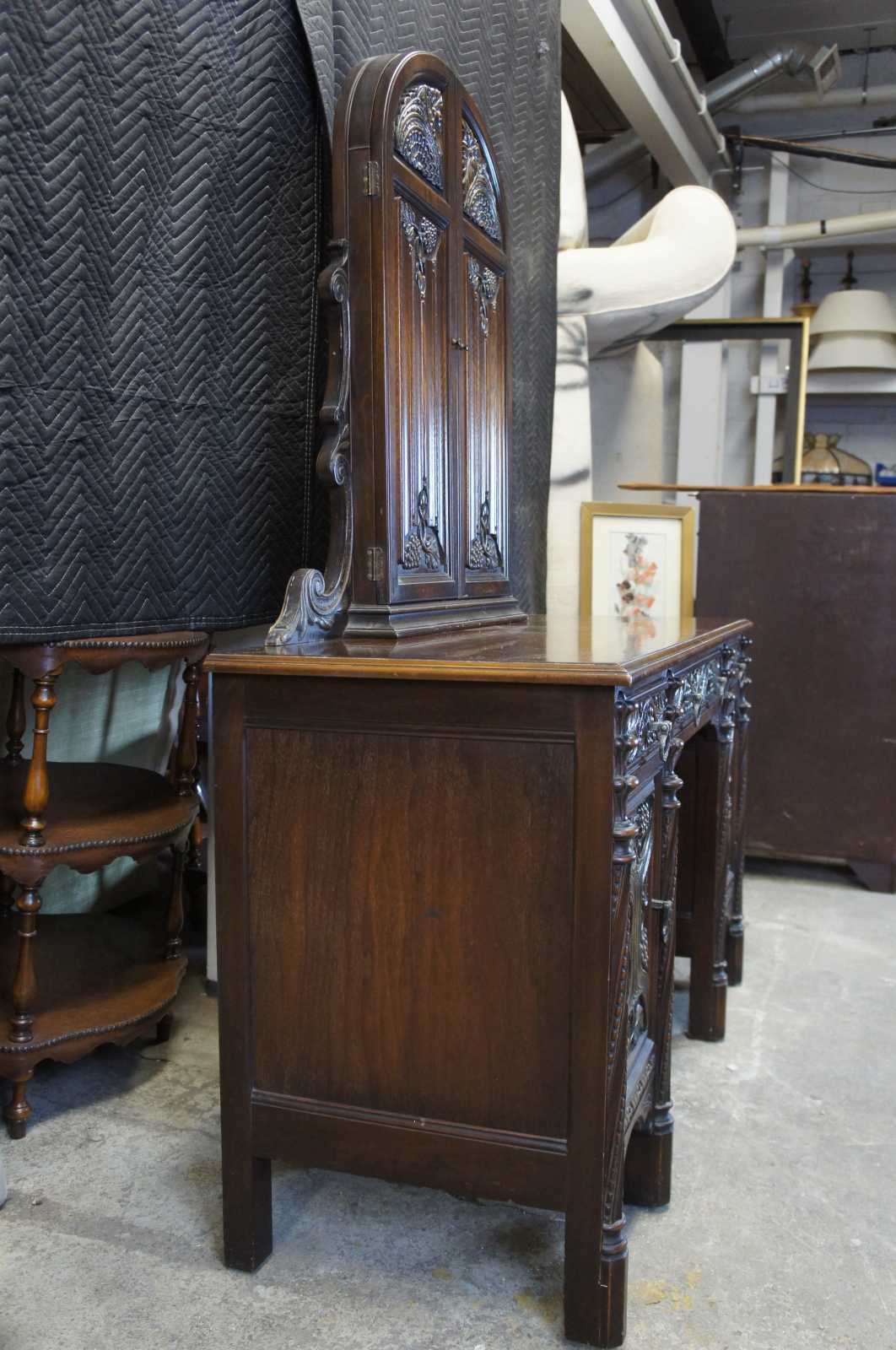 American Furniture Company Gothic or Spanish Renaissance Revival vanity desk and mirror. Operating out of Batesville Indiana since 1899, they worked closely and collaborated in part with Romweber. Specializing in high grade bedroom suites & furniture. Made from American Walnut with low relief floral carvings, Gothic arched doors that open to mirror, twisted balusters posts. Includes three drawers over lower cabinets. Circa 1930s.