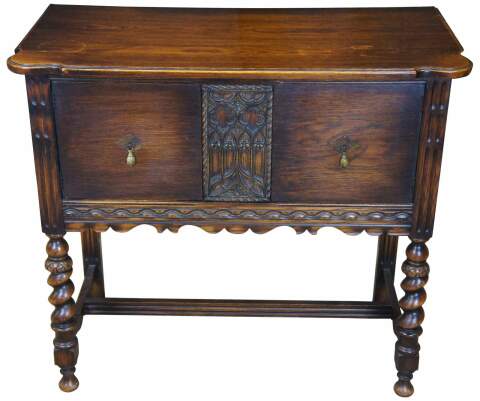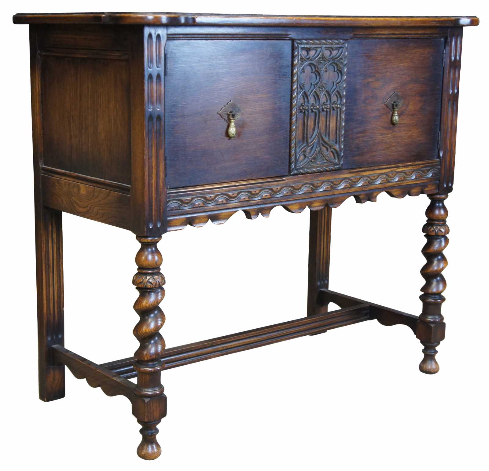Early 20th century Jacobean or Spanish Revival buffet or altar cabinet. Made from oak with raised carvings between two cabinet doors. The cabinet is supported by four legs with barley twisted accents and a trestle base.
